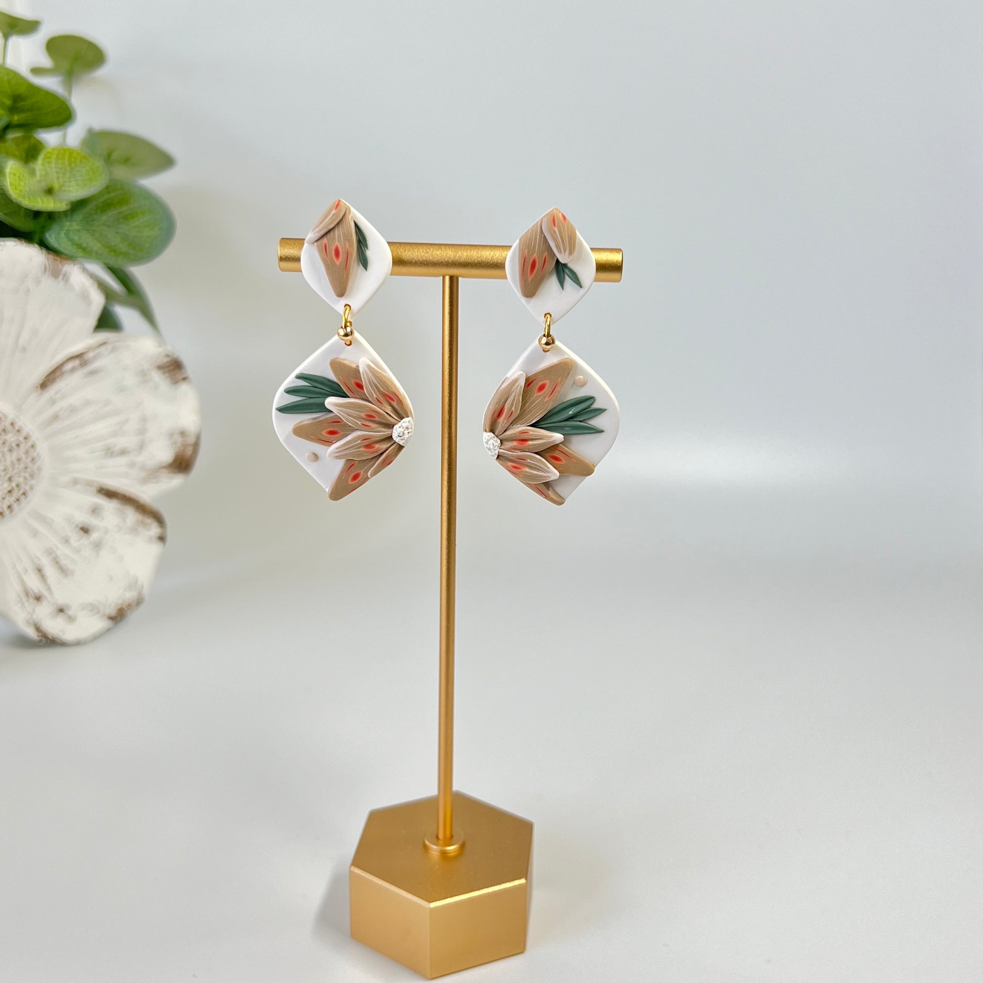 *Please be mindful of the handmade nature of these clay creations. They can withstand normal wear but please refrain from wearing them in water, excessive heat or near tiny hands. Your earrings are delicate, especially the flower designs. Avoid the use of oils, cream or perfume, as they might affect the longevity. Please allow slight variances in pattern and color due to display differences.