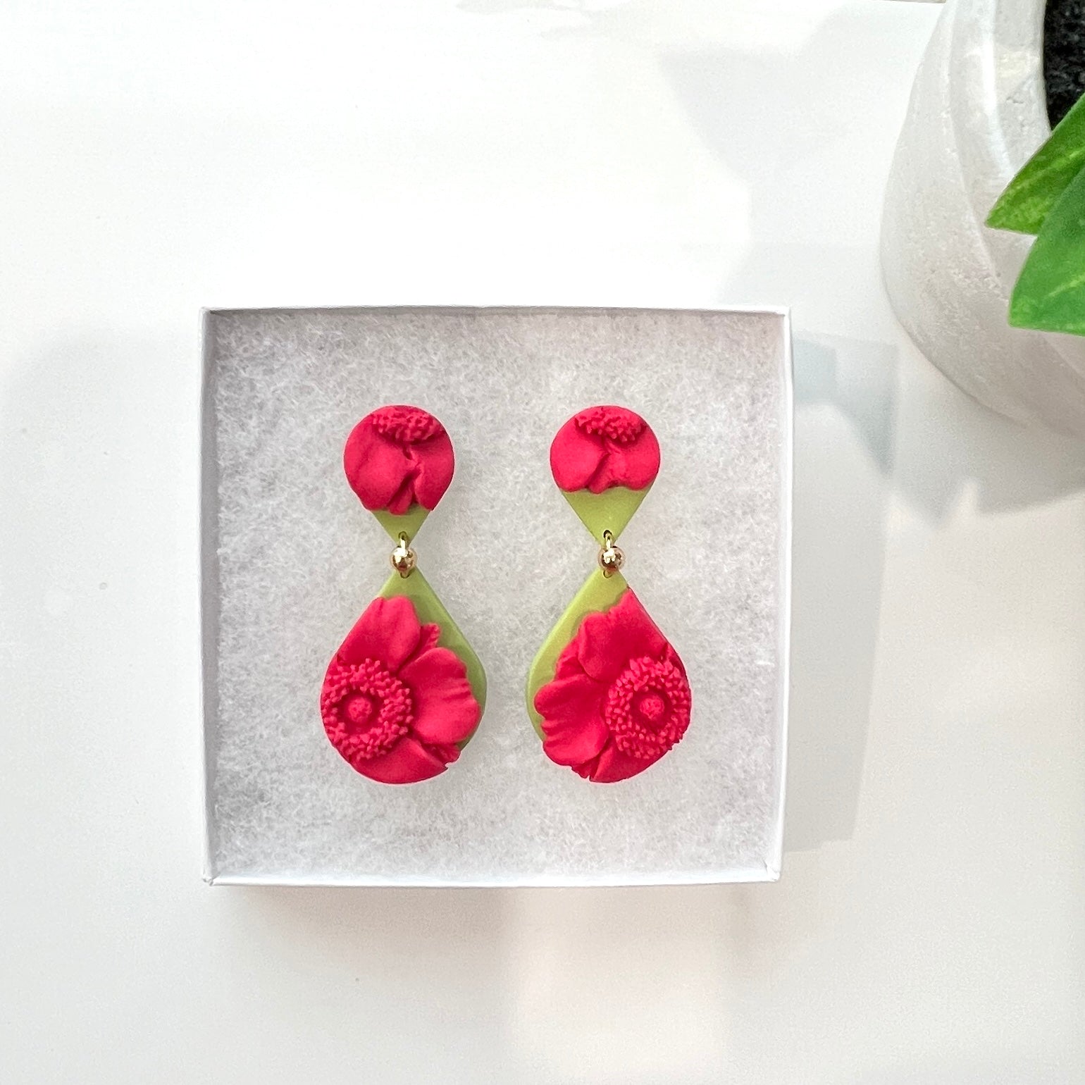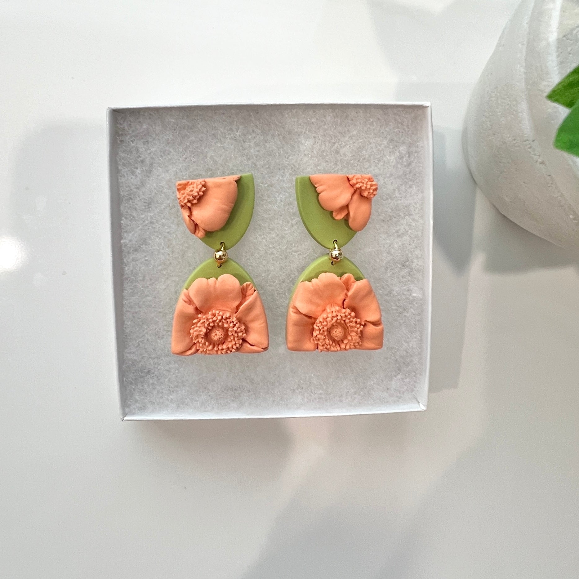 Please be mindful of the handmade nature of these clay creations. They can withstand normal wear but please refrain from wearing them in water, excessive heat or near tiny hands. Your earrings are delicate, especially the flower designs. Avoid the use of oils, cream or perfume, as they might affect the longevity. Please allow slight variances in pattern and color due to display differences.