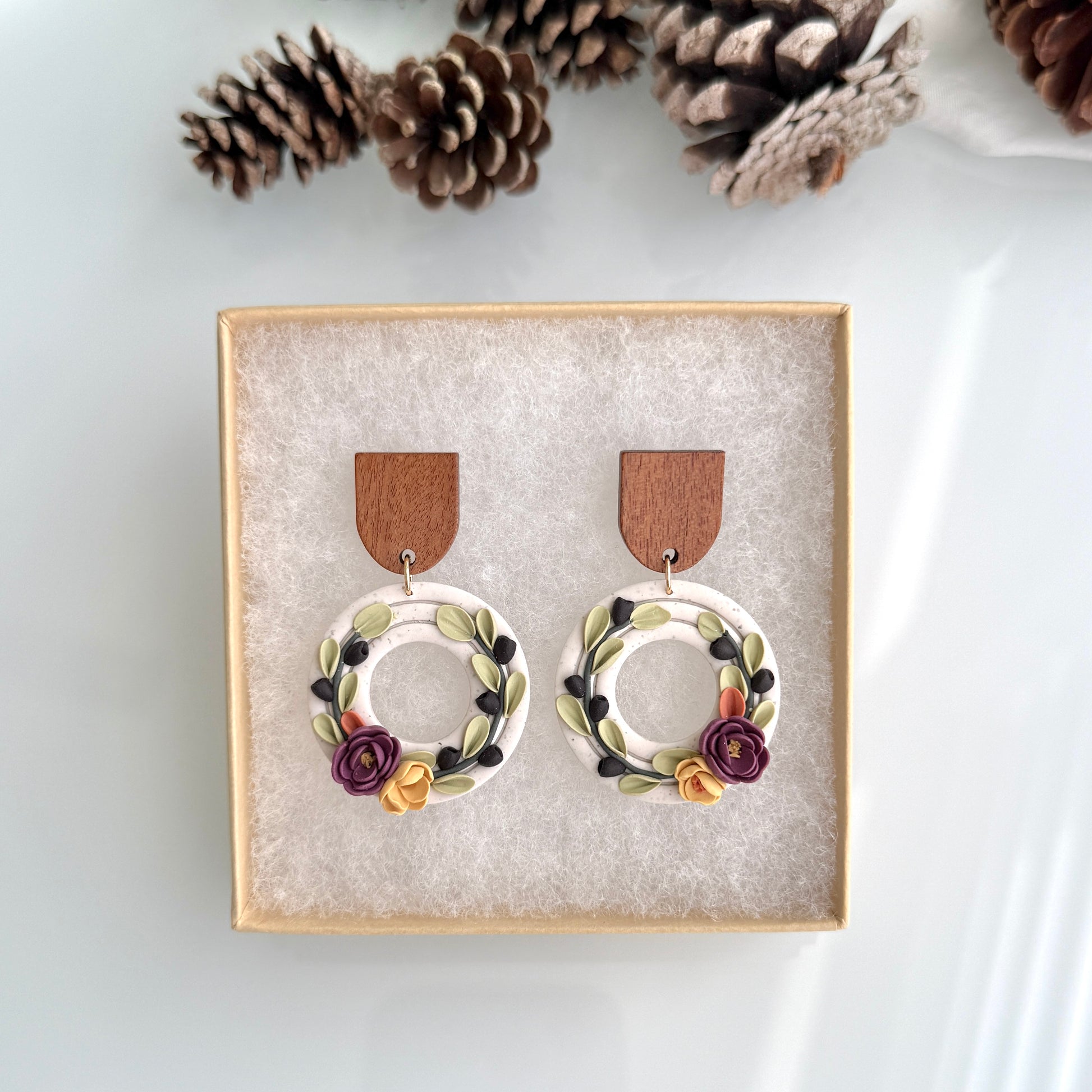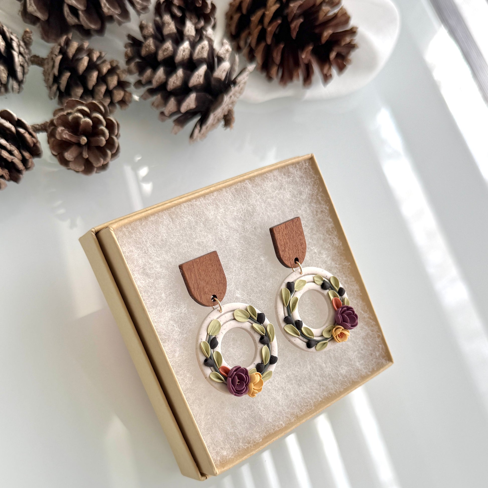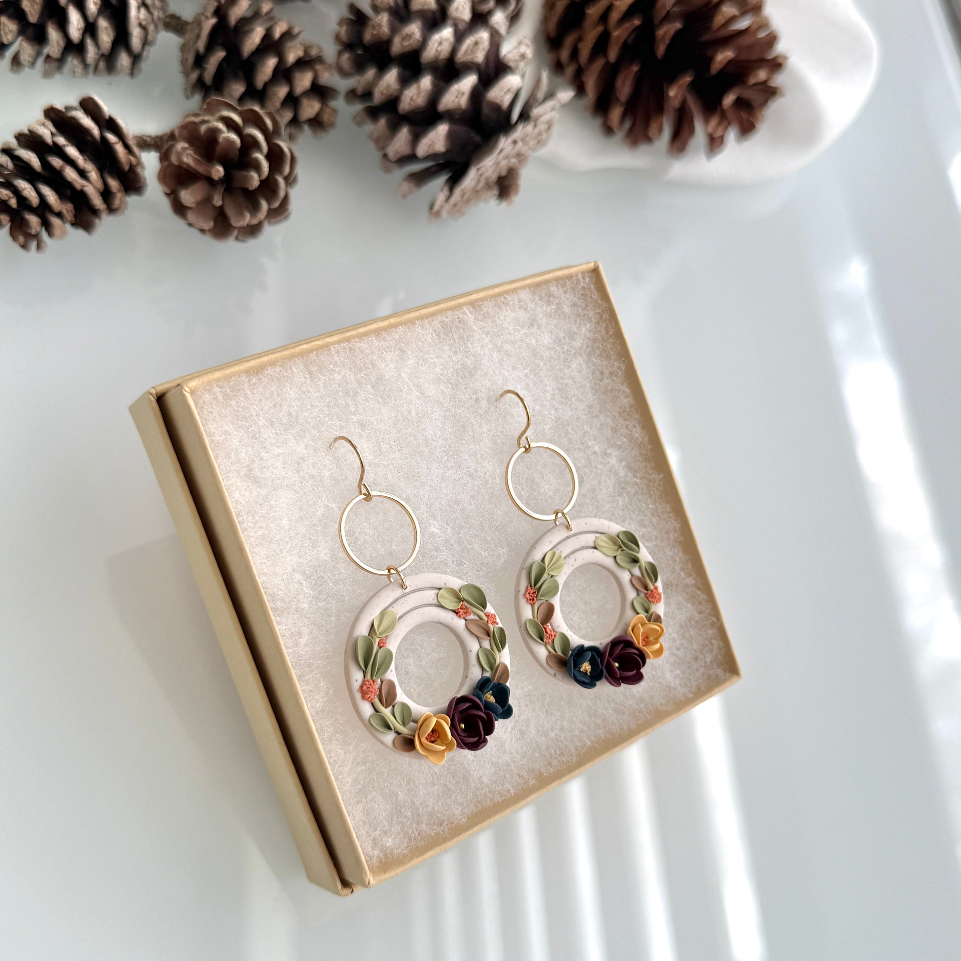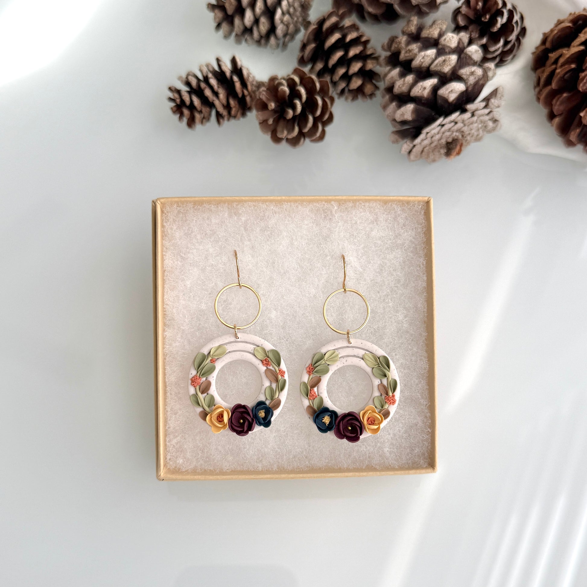 Speckled ‘wreath’ with Fall inspired colors and 3D flowers (Marigold, Navy, Burgundy) with gold ring detail and standard ear hook: Approximate total length: 57mm *Silver option available
