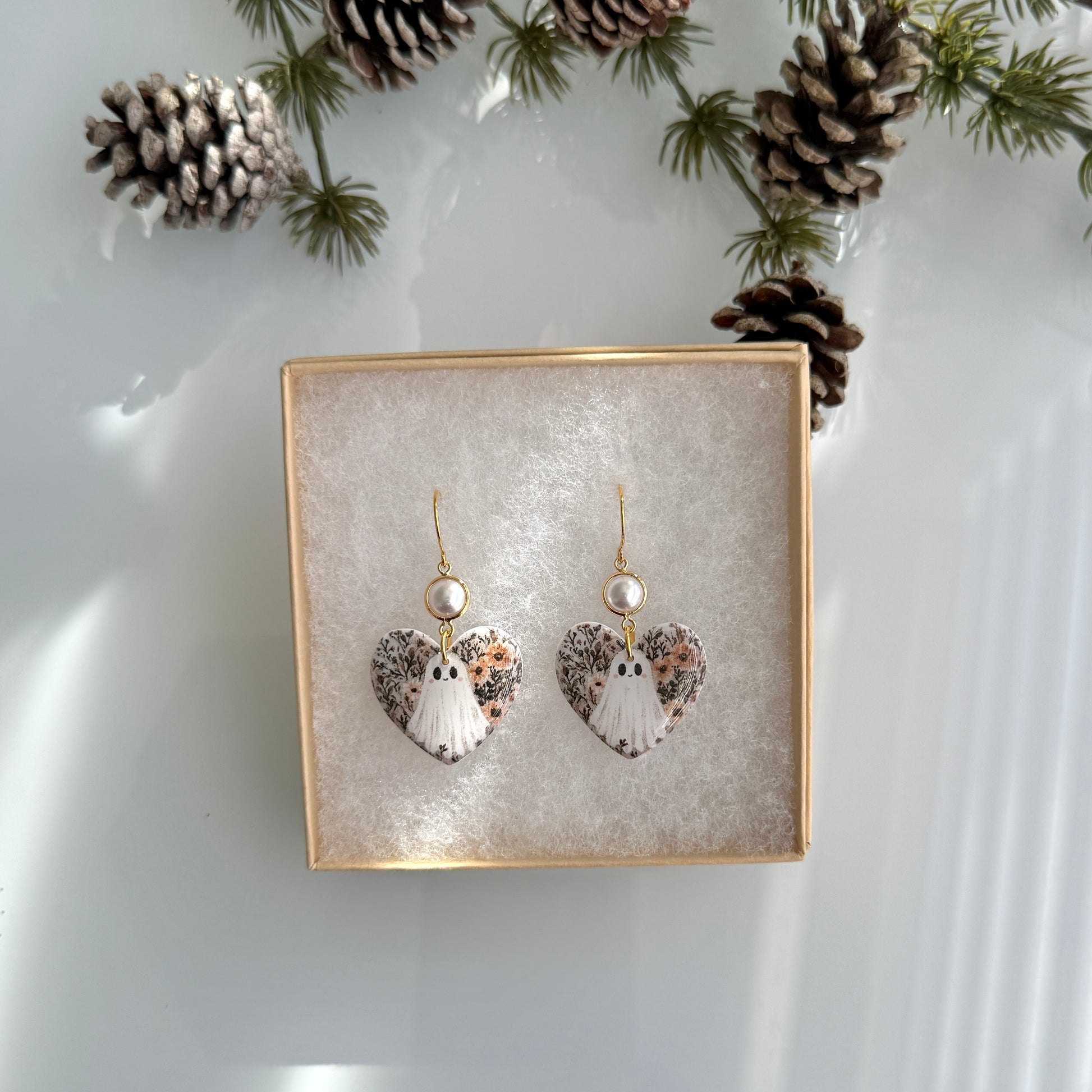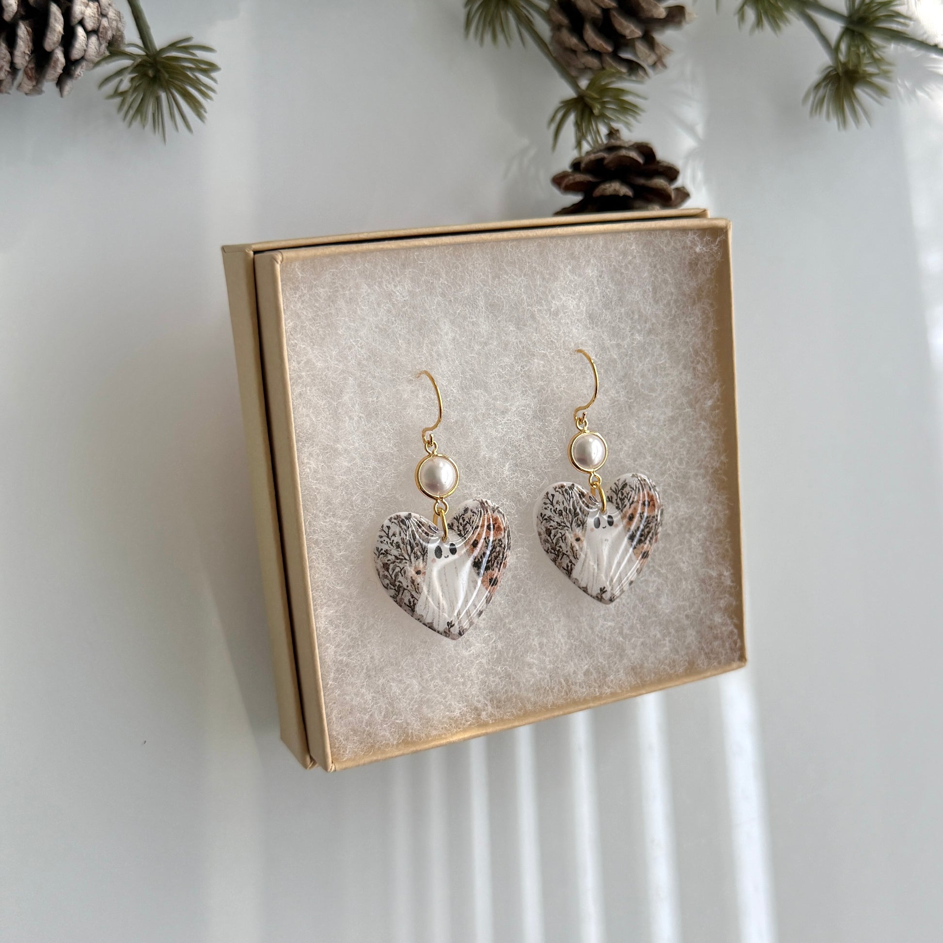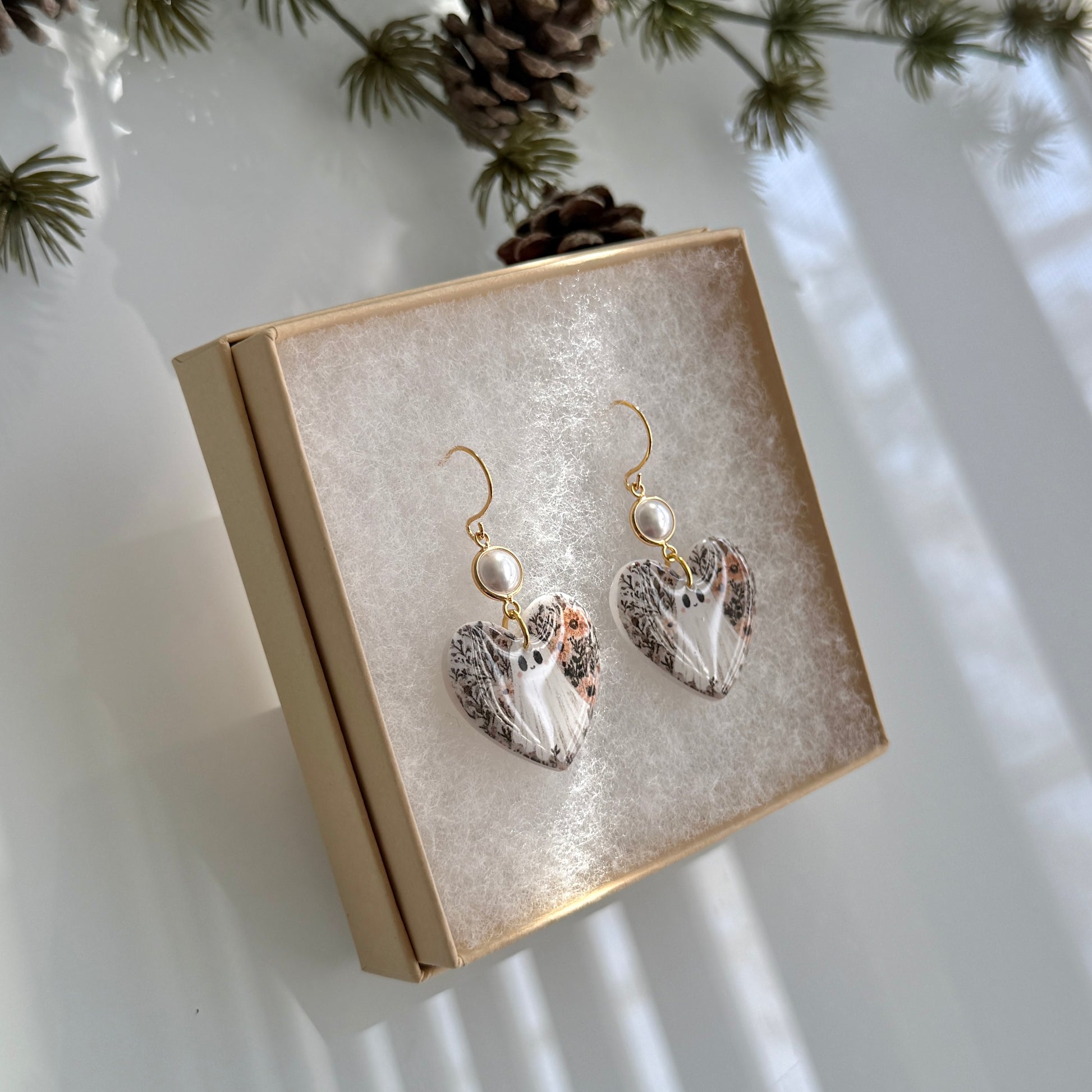 Spooky heart print, covered with shiny resin, faux pearl detail and standard ear hook: Gold only