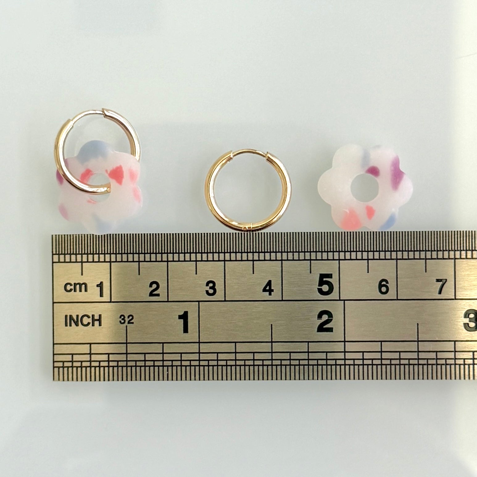 Tiny hoops(16mm) with interchangeable flowers(17mm). Wear one or two flowers at the same time. Hoops and flowers sold separately.