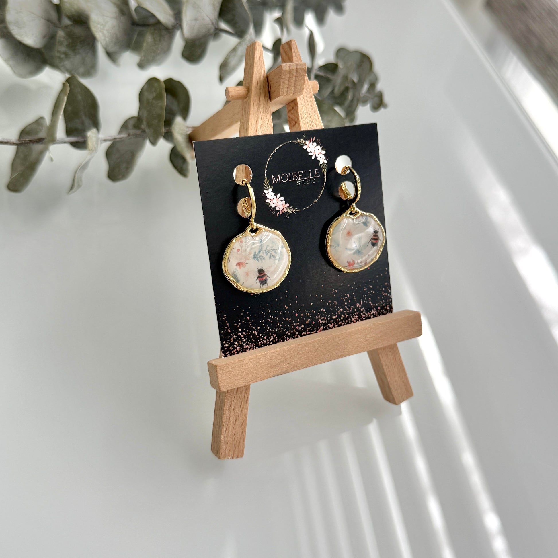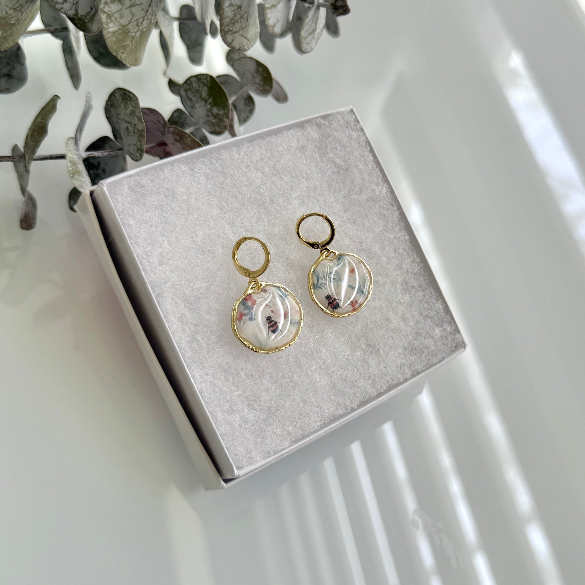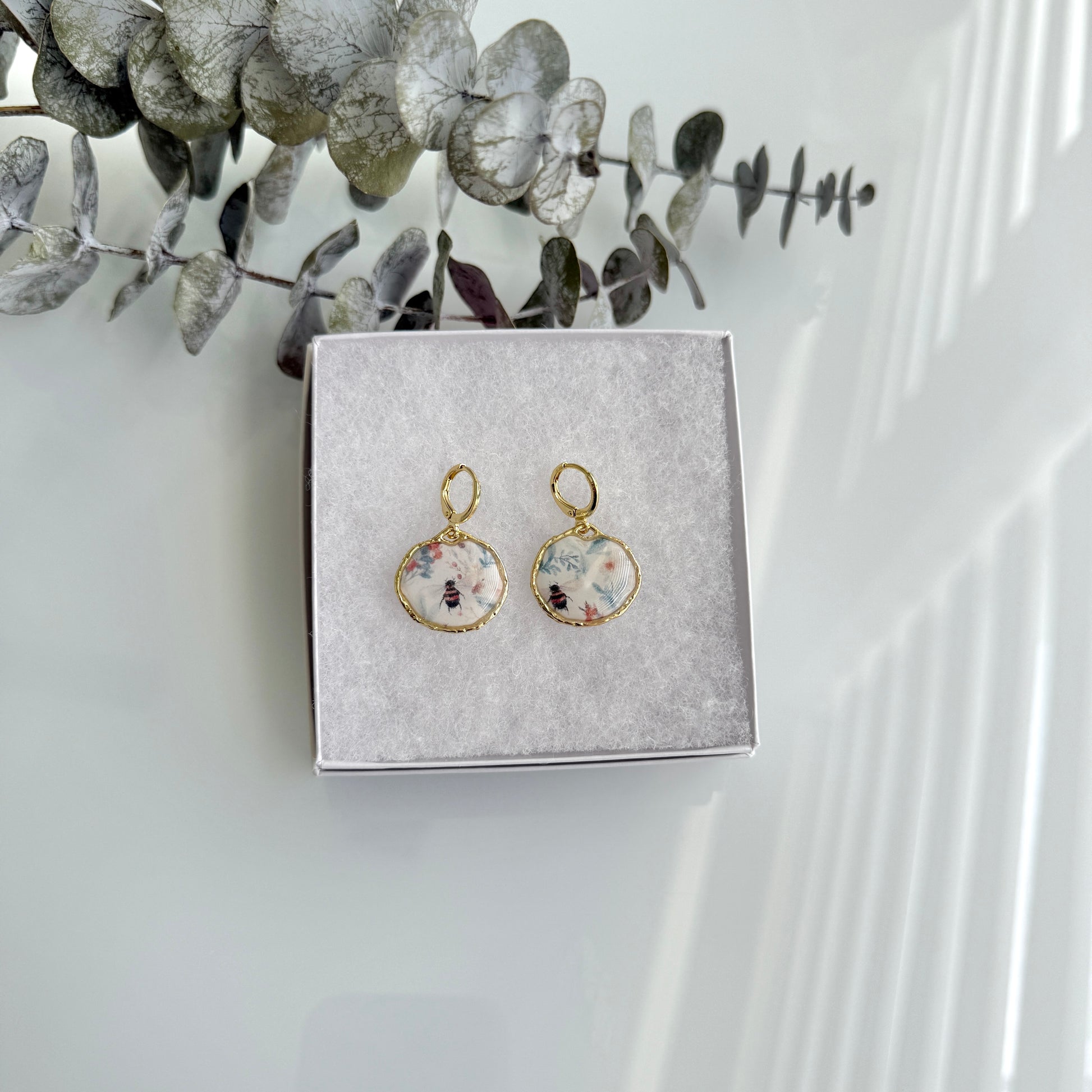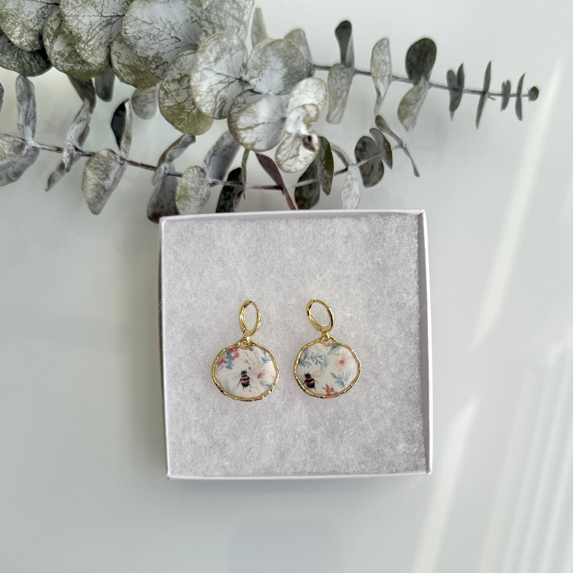 Tiny oval(21mm) with bee and floral print and French lever back huggie detail : Approximate diameter: 33mm