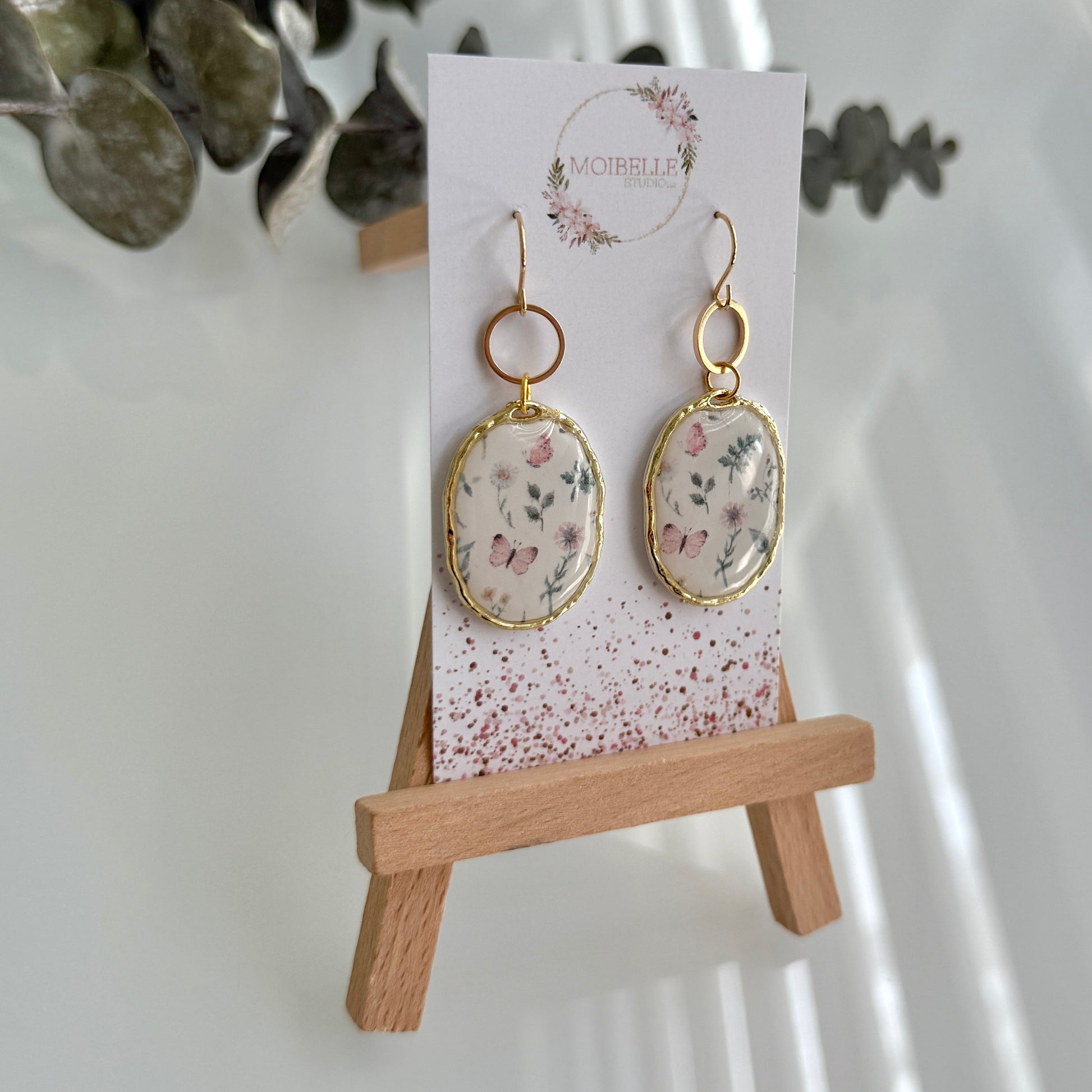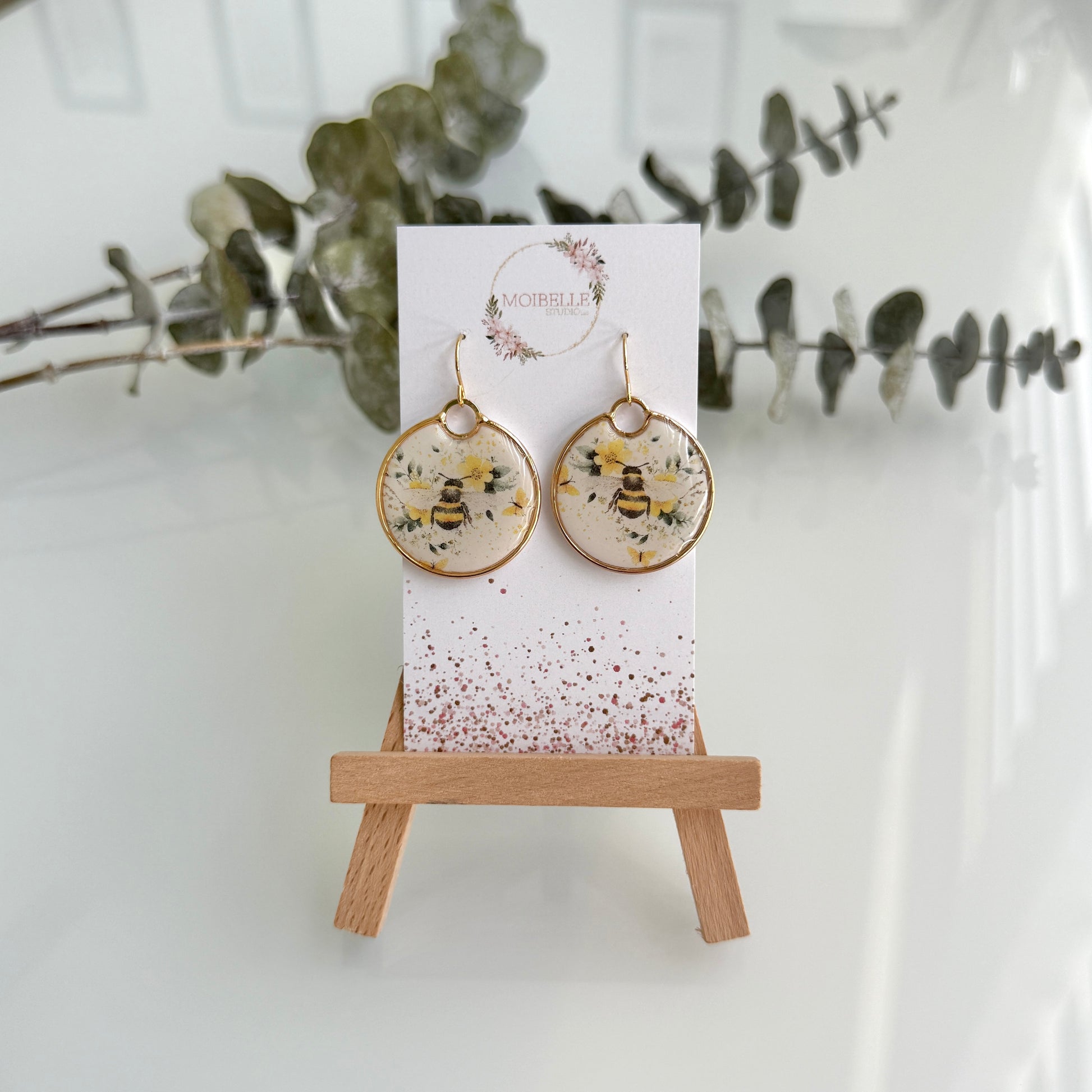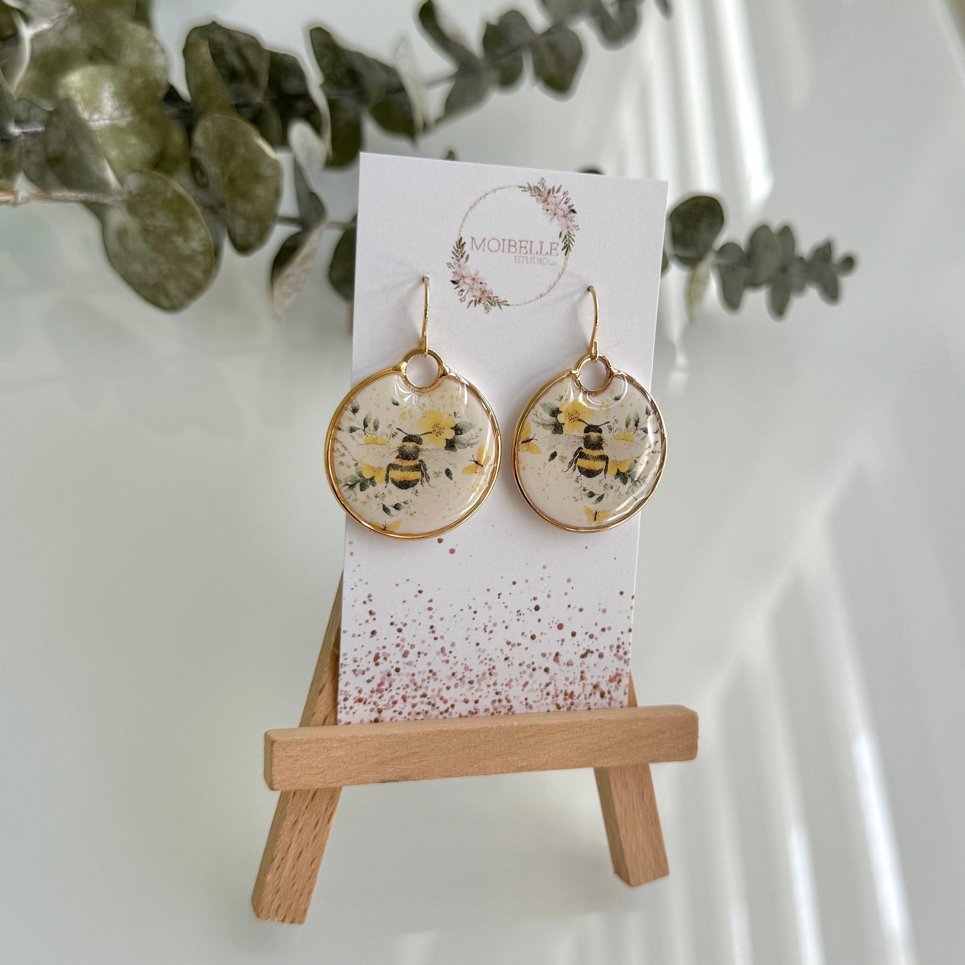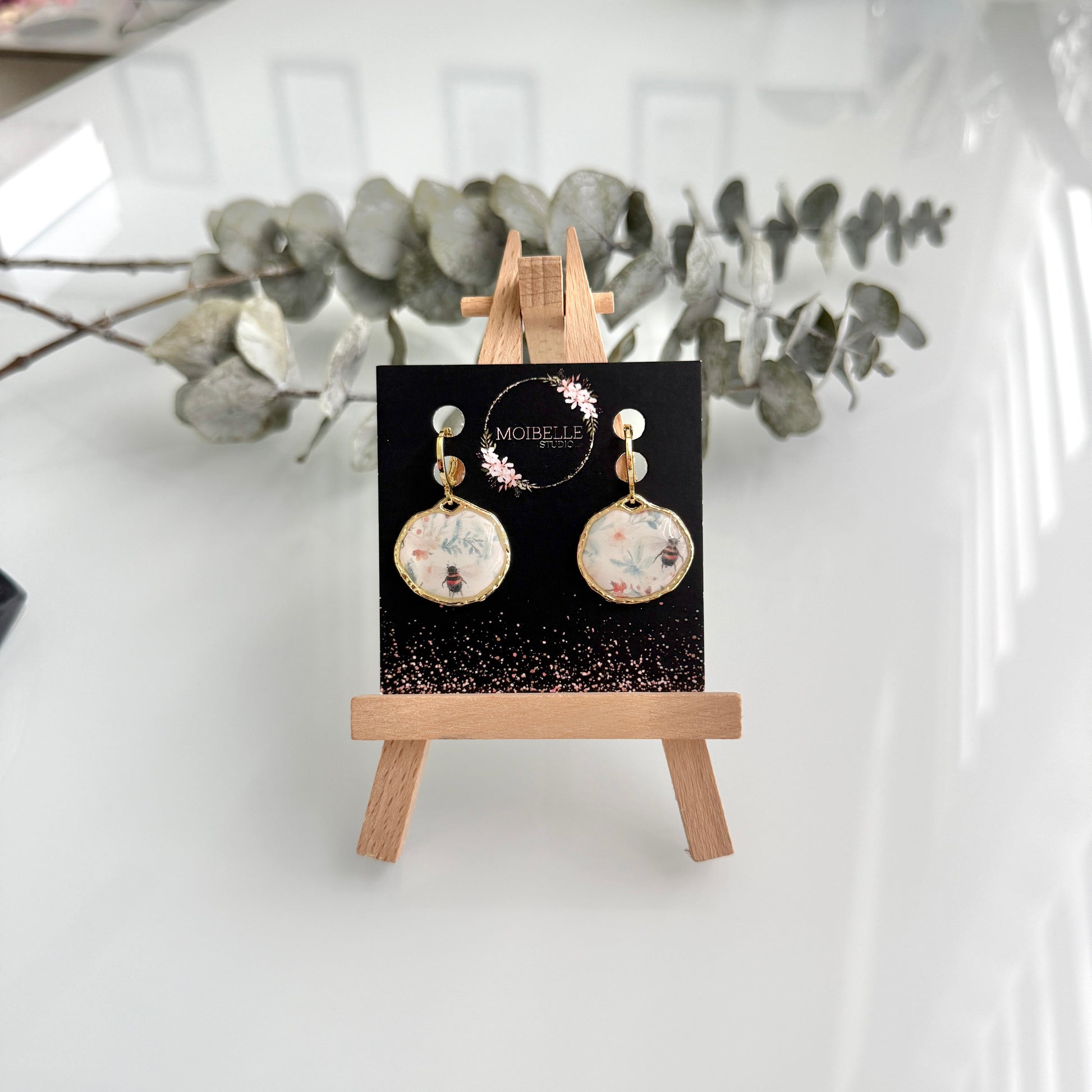 Tiny oval(21mm) with bee and floral print and French lever back huggie detail : Approximate diameter: 33mm
