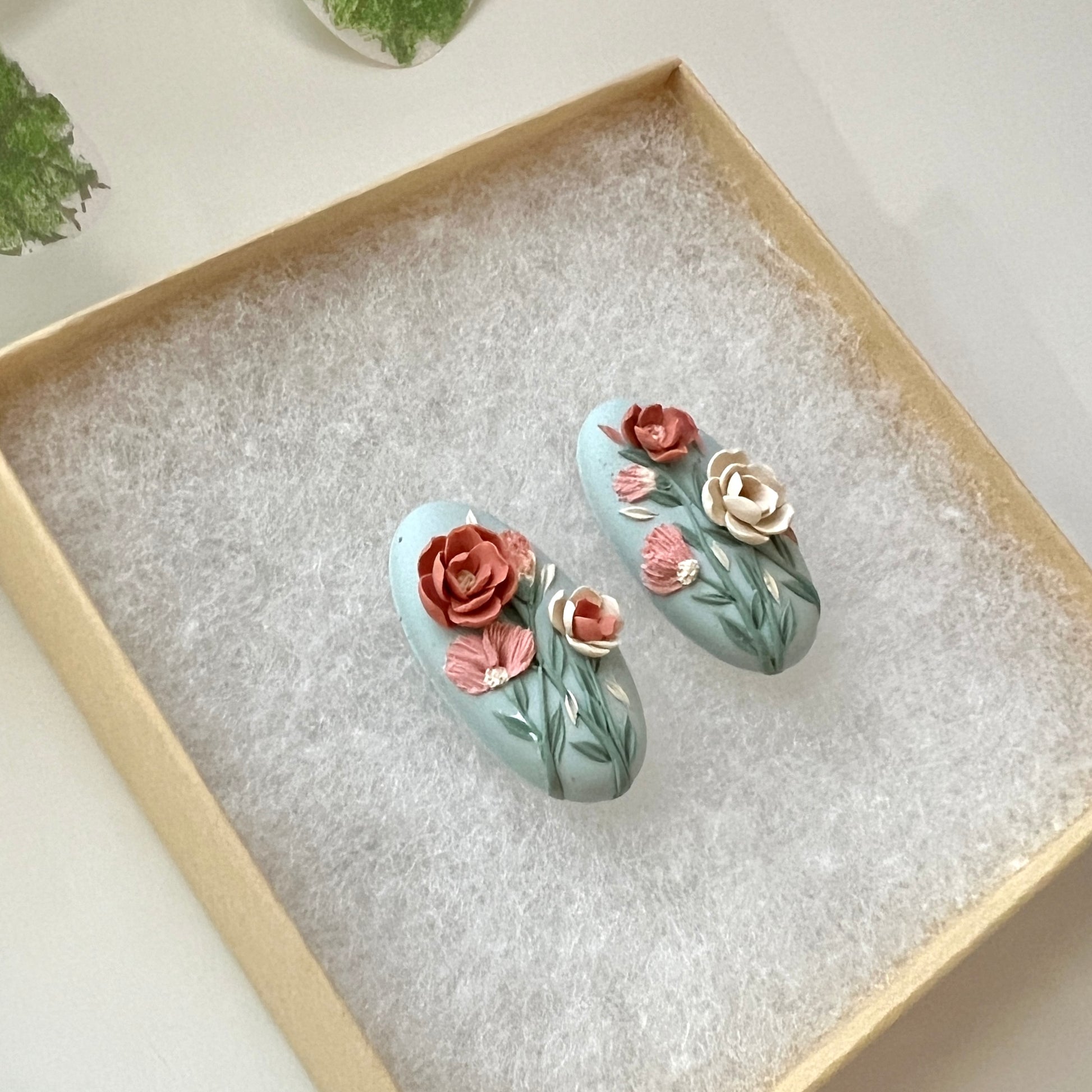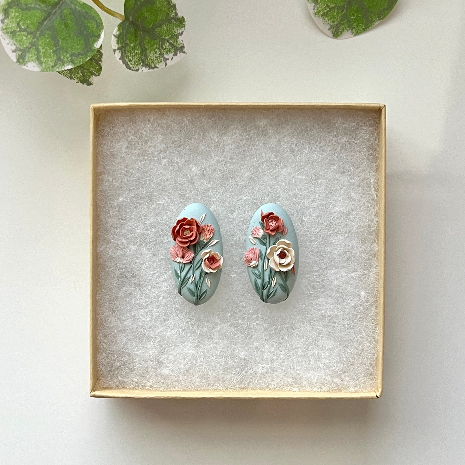 Leia stud has tiny detailed flowers in nude, pink and pastel burnt coral on a speckled soft blue domed oval base