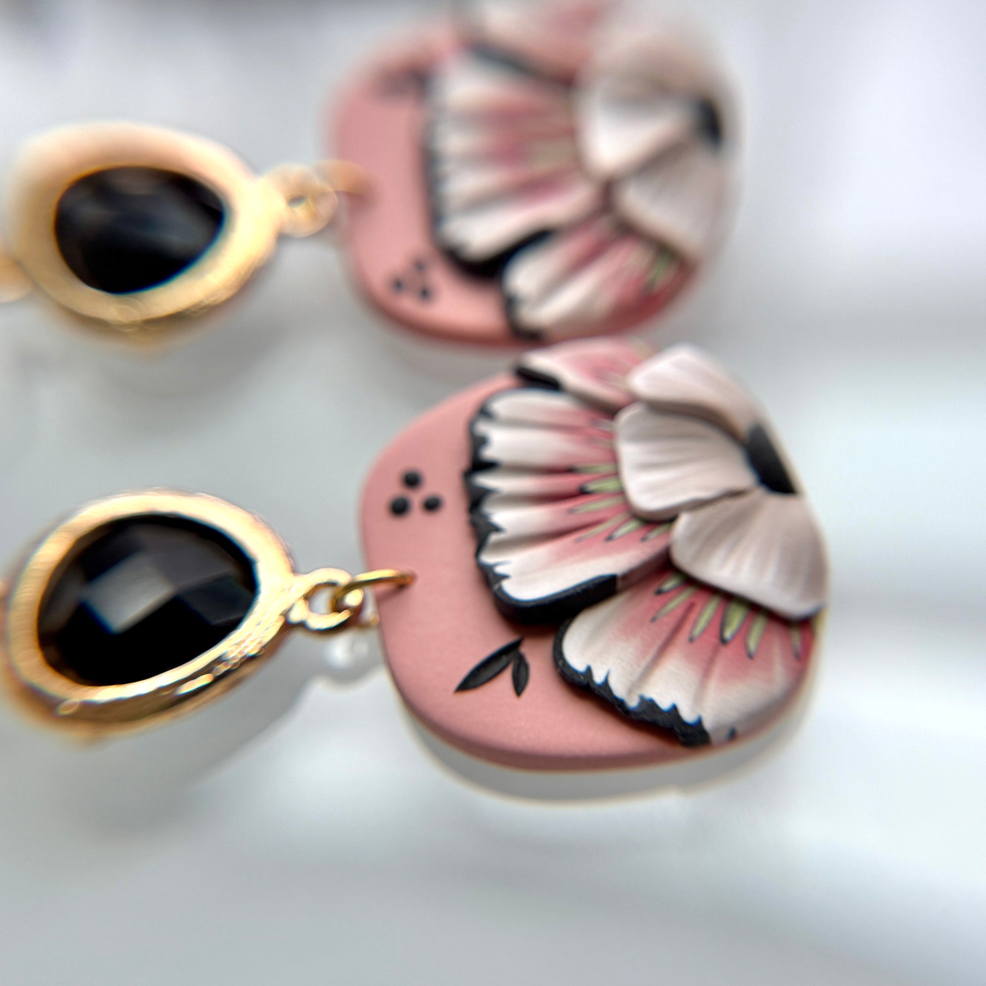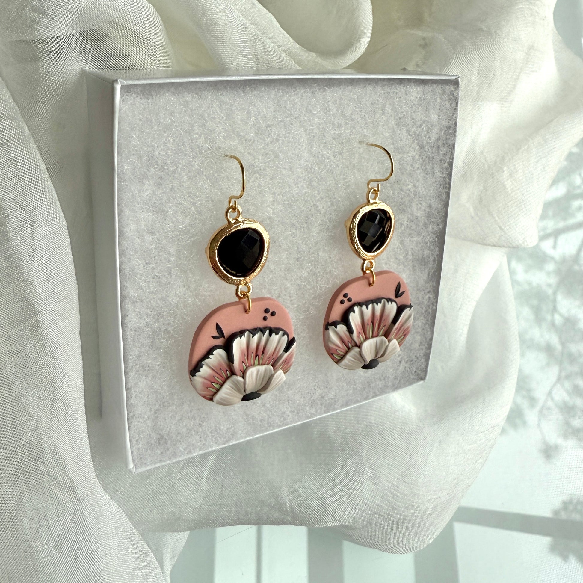 -Black glass: Ivory, burnt coral, green and black petals with black glass detail and standard ear hook