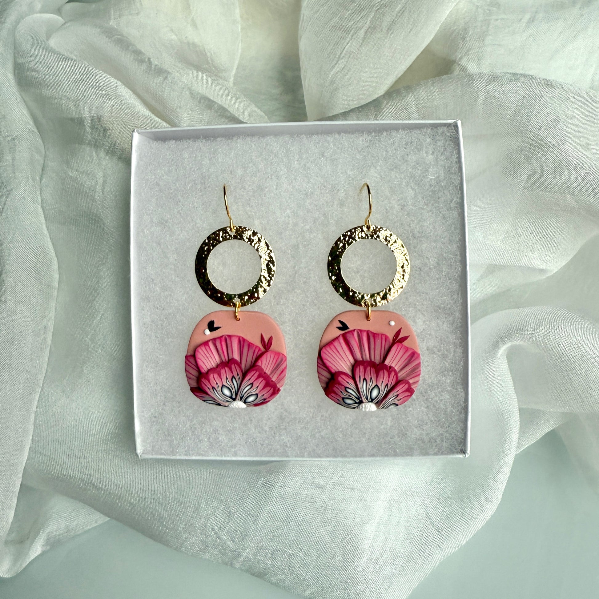 -Circle detail: Red, white, pink and black petals with a hammered circle detail and standard ear hook.