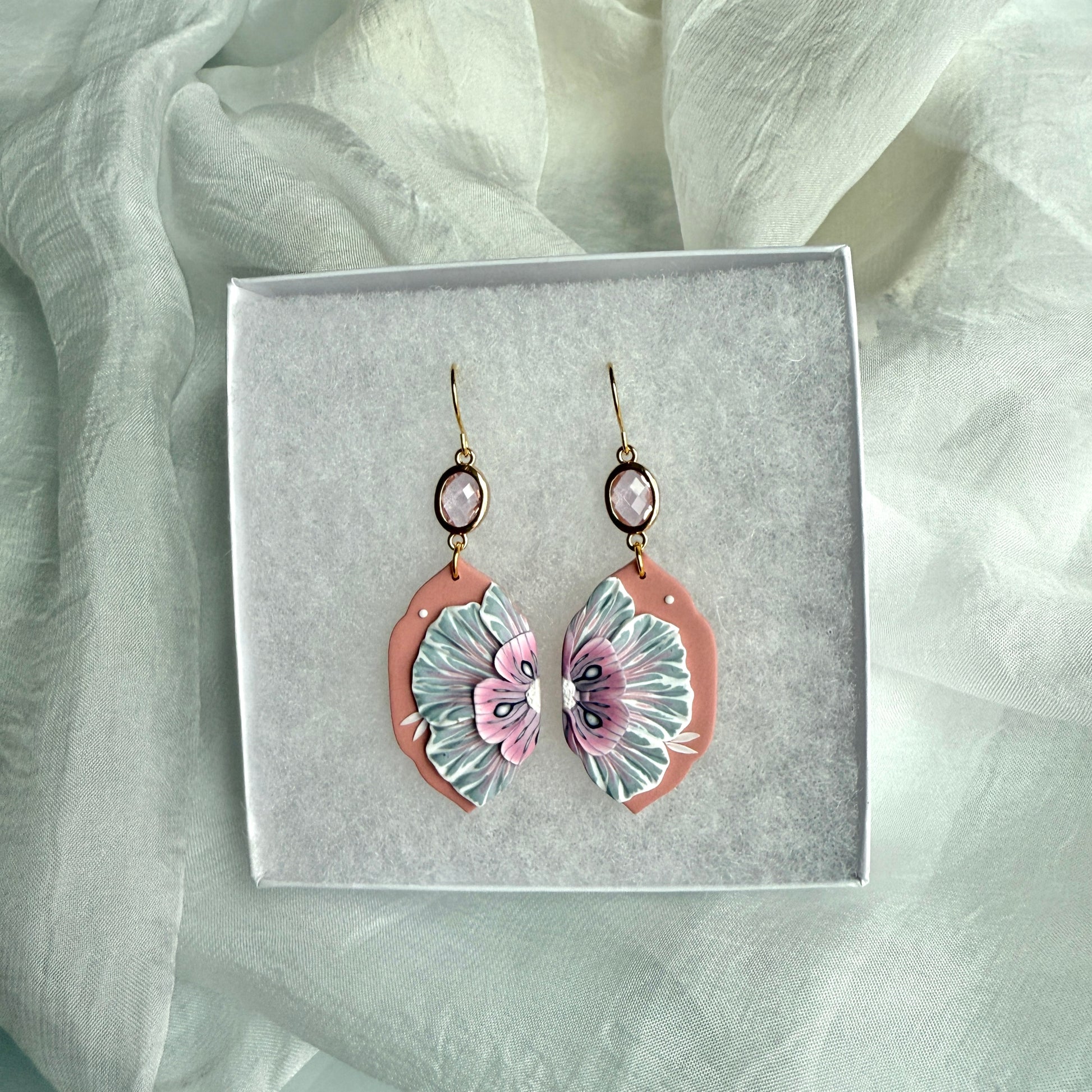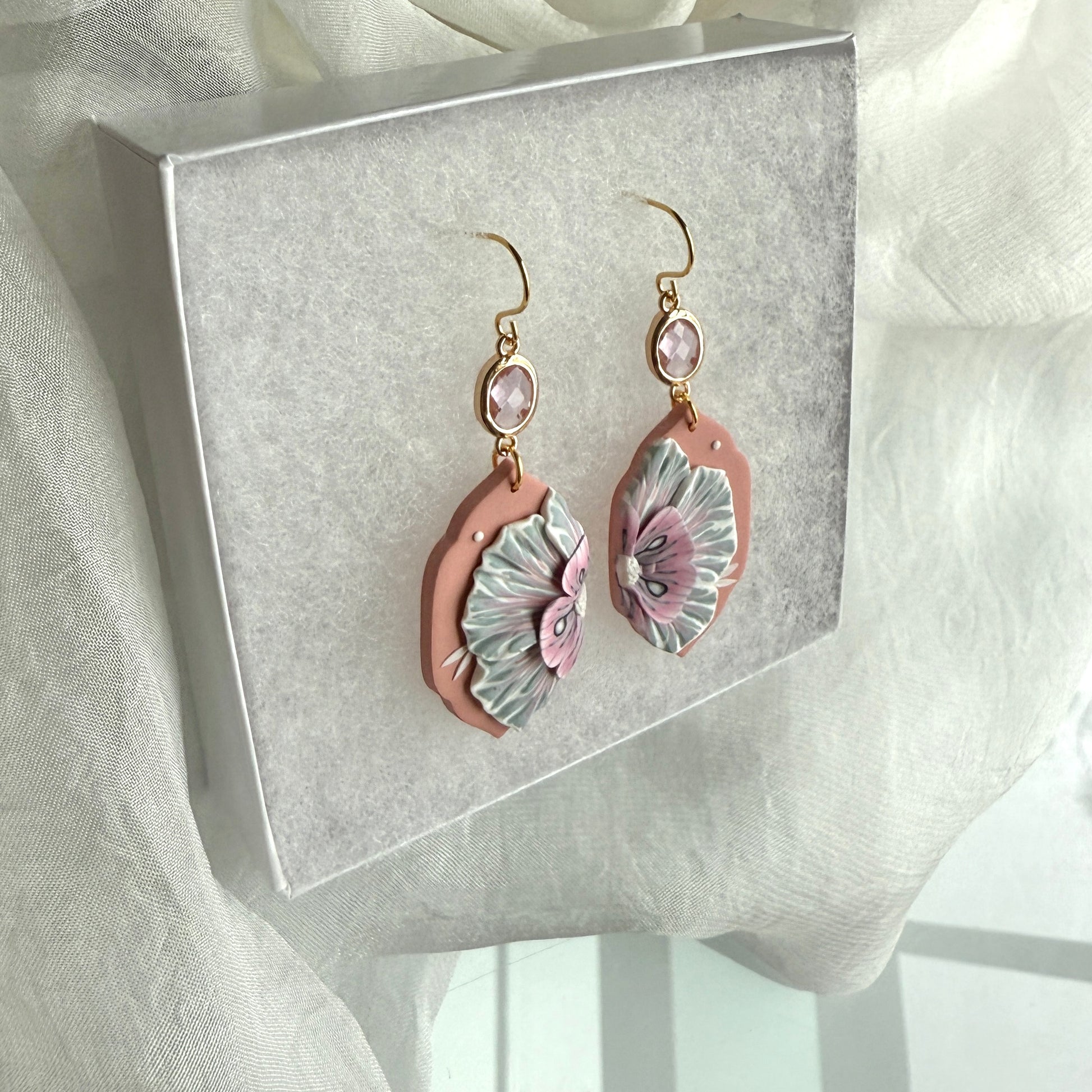 -Oval glass: Pink, green, lavender and white petals with pink oval glass detail and standard ear hook.