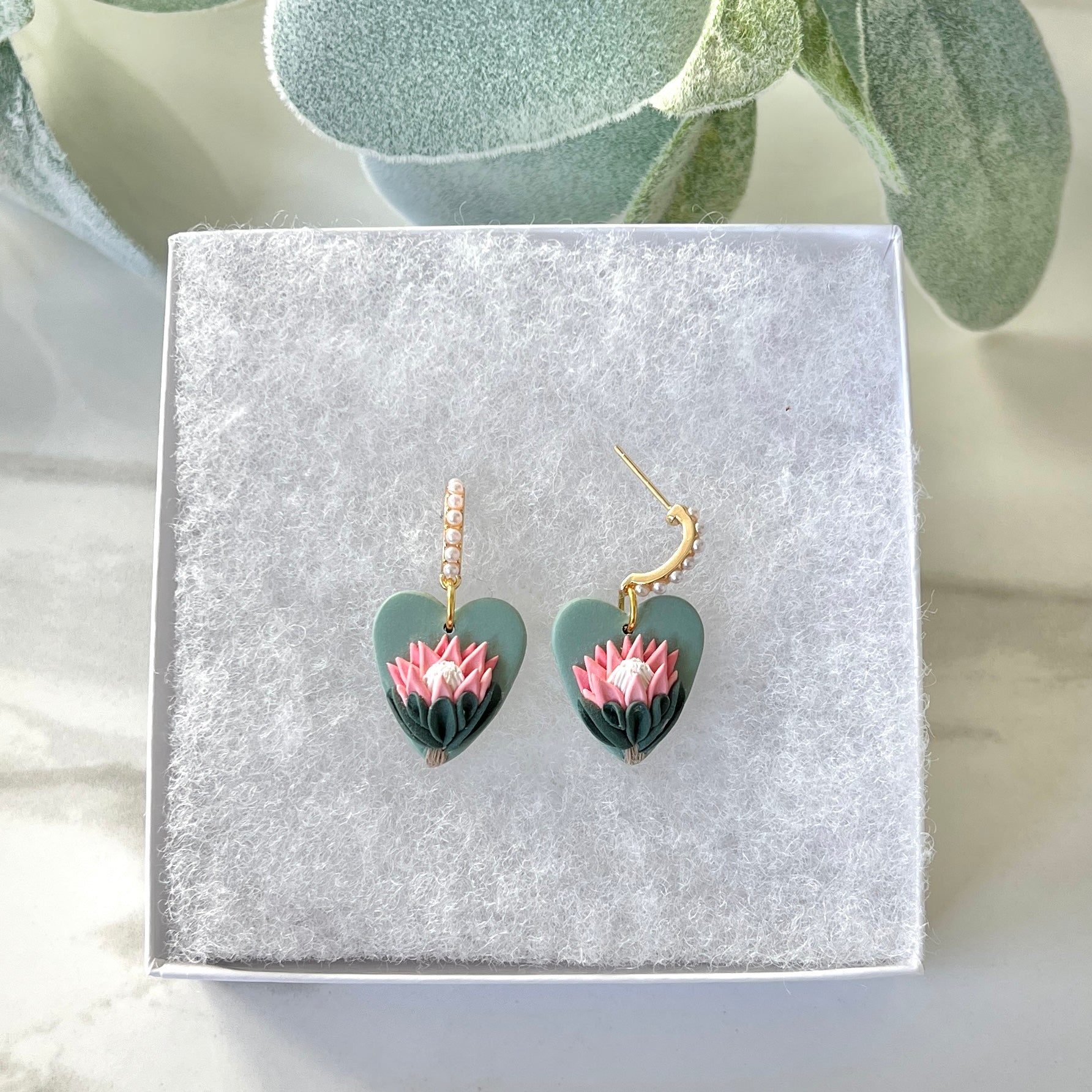 Green heart shape 20x17mm)with coral tone Protea and pearl detail stud. Approximate total length 33mm