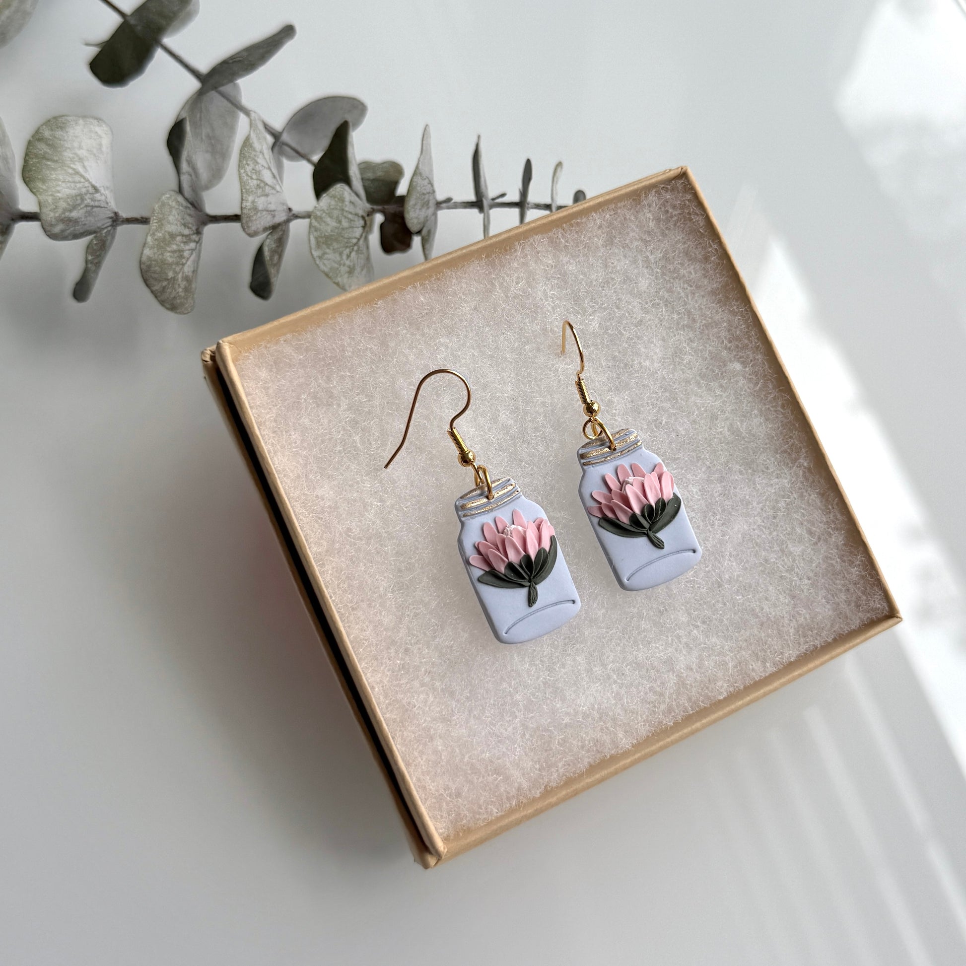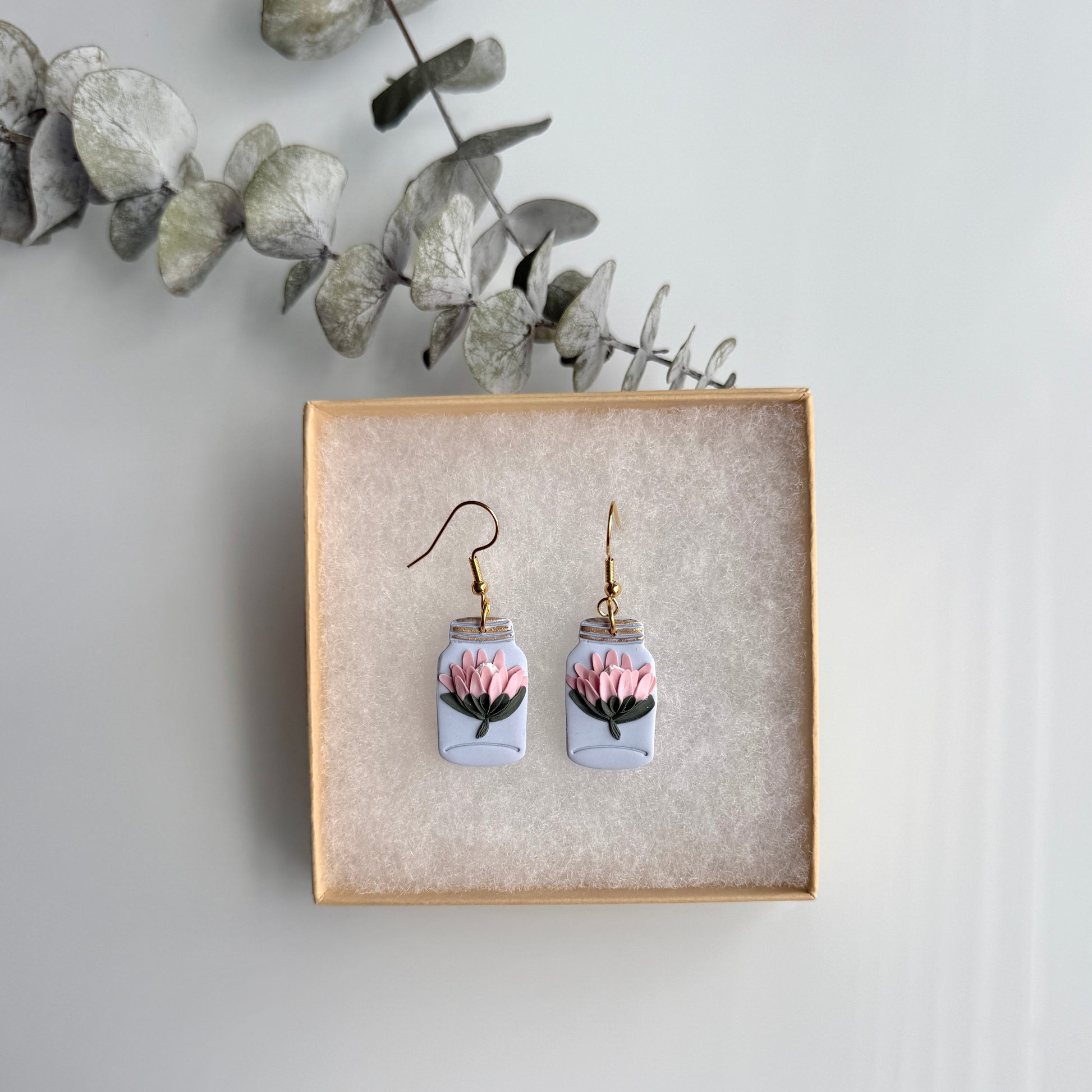 Nude pink 3D Protea flowers(pointy/rounded petals) on Periwinkle blue base with standard ear hook. Approximate total length 46mm