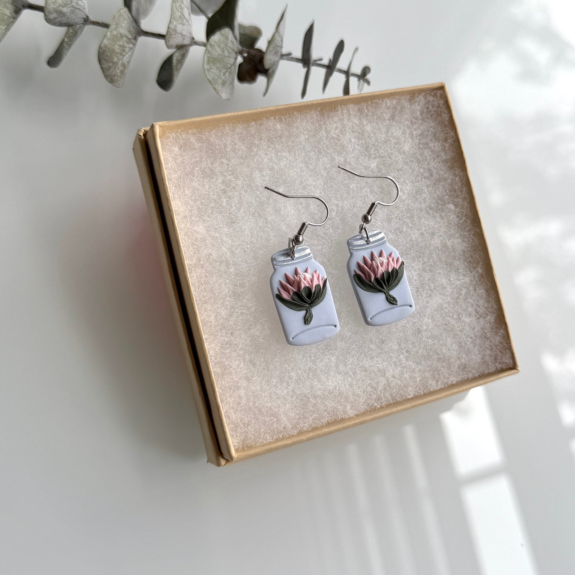 Proteas are bold and beautiful flowers, named after the Greek god Proteus and varies in a wide range of pink, red, white, cream and yellow colors. 3D flowers on Periwinkle blue base with standard ear hook