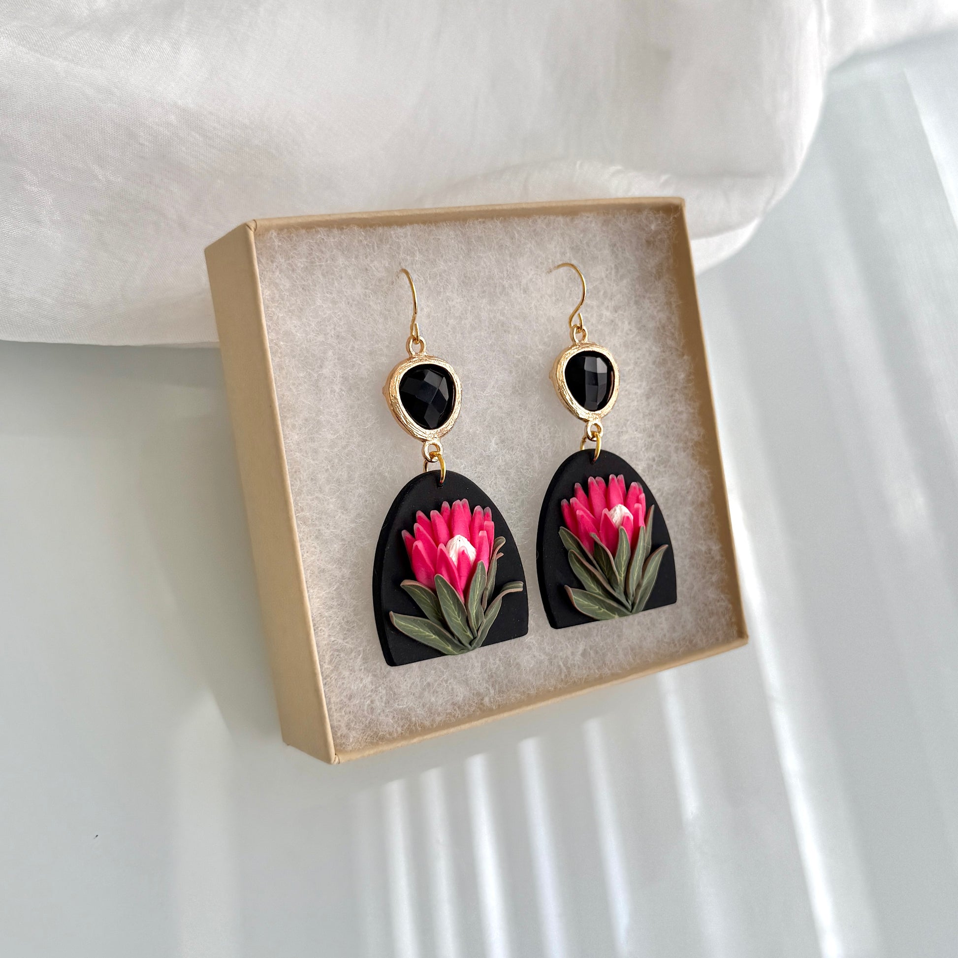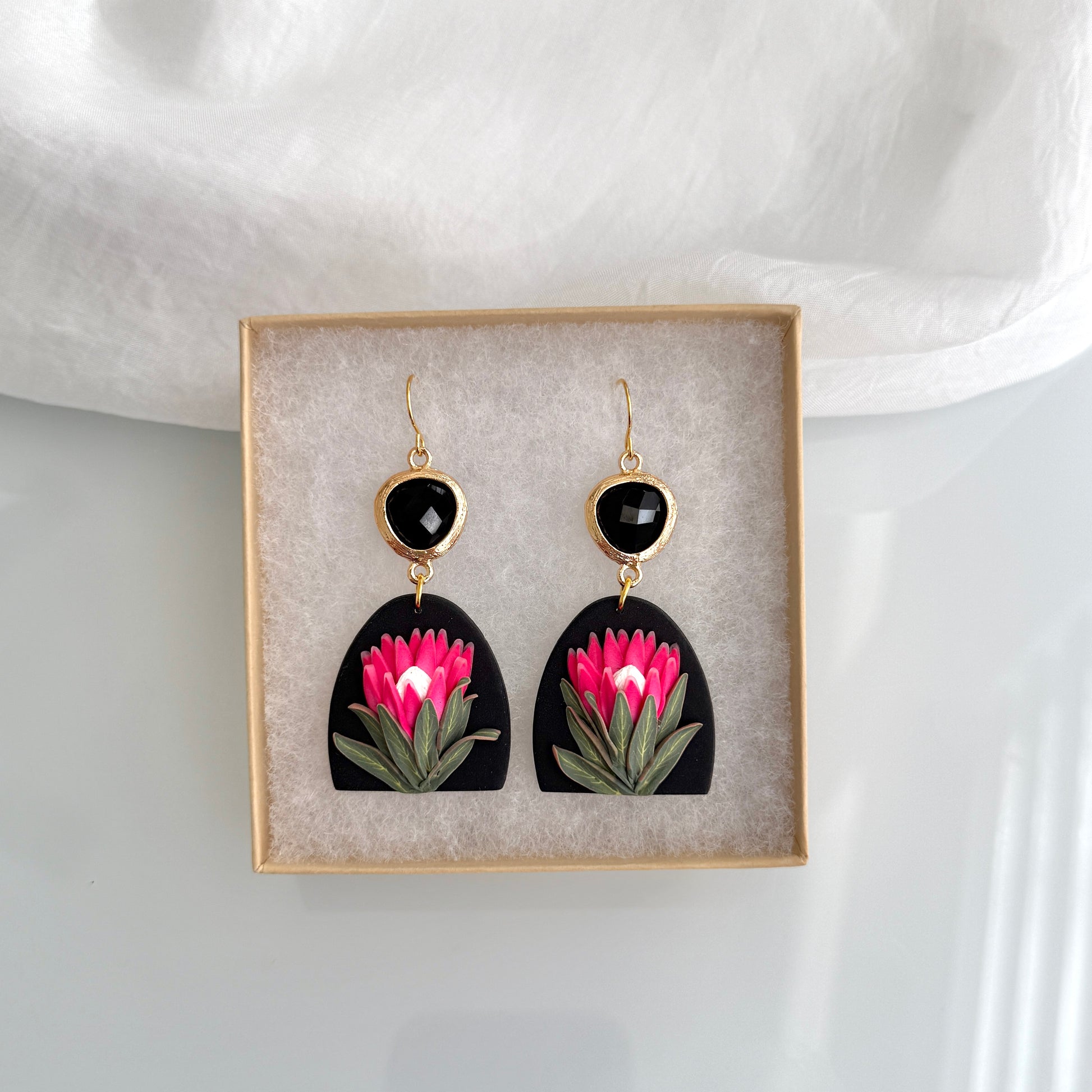 3D Hot Pink Proteas with black glass detail and standard ear hook: