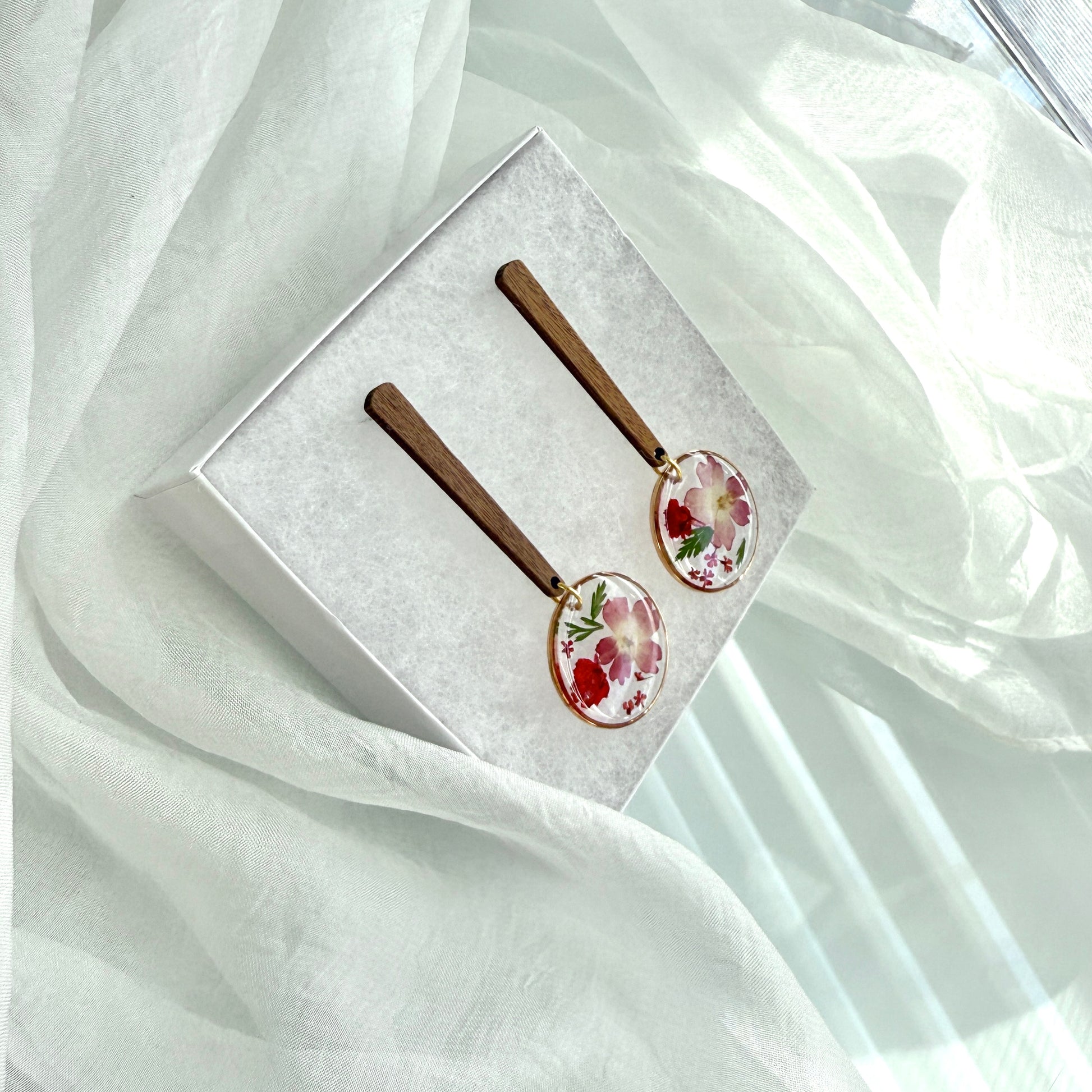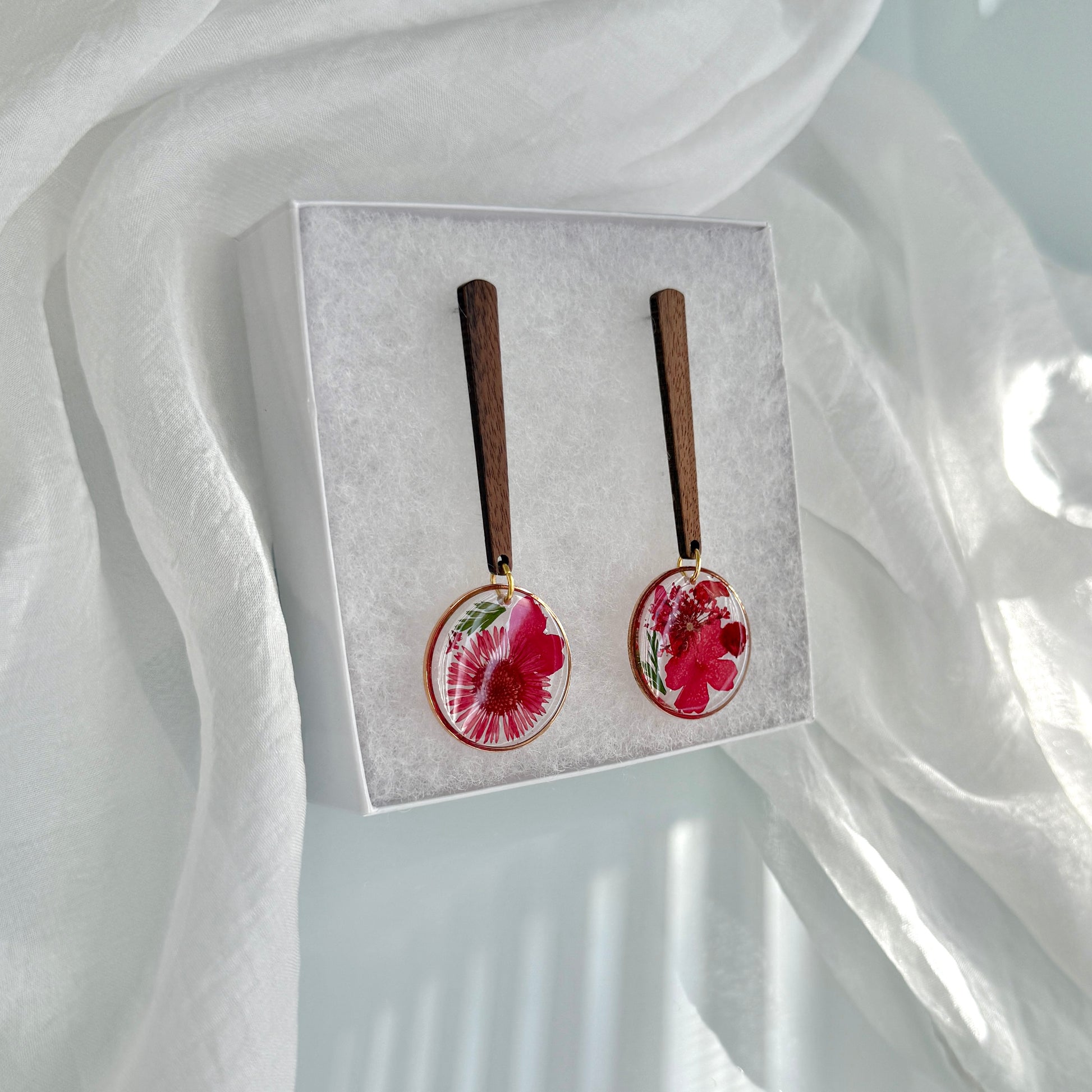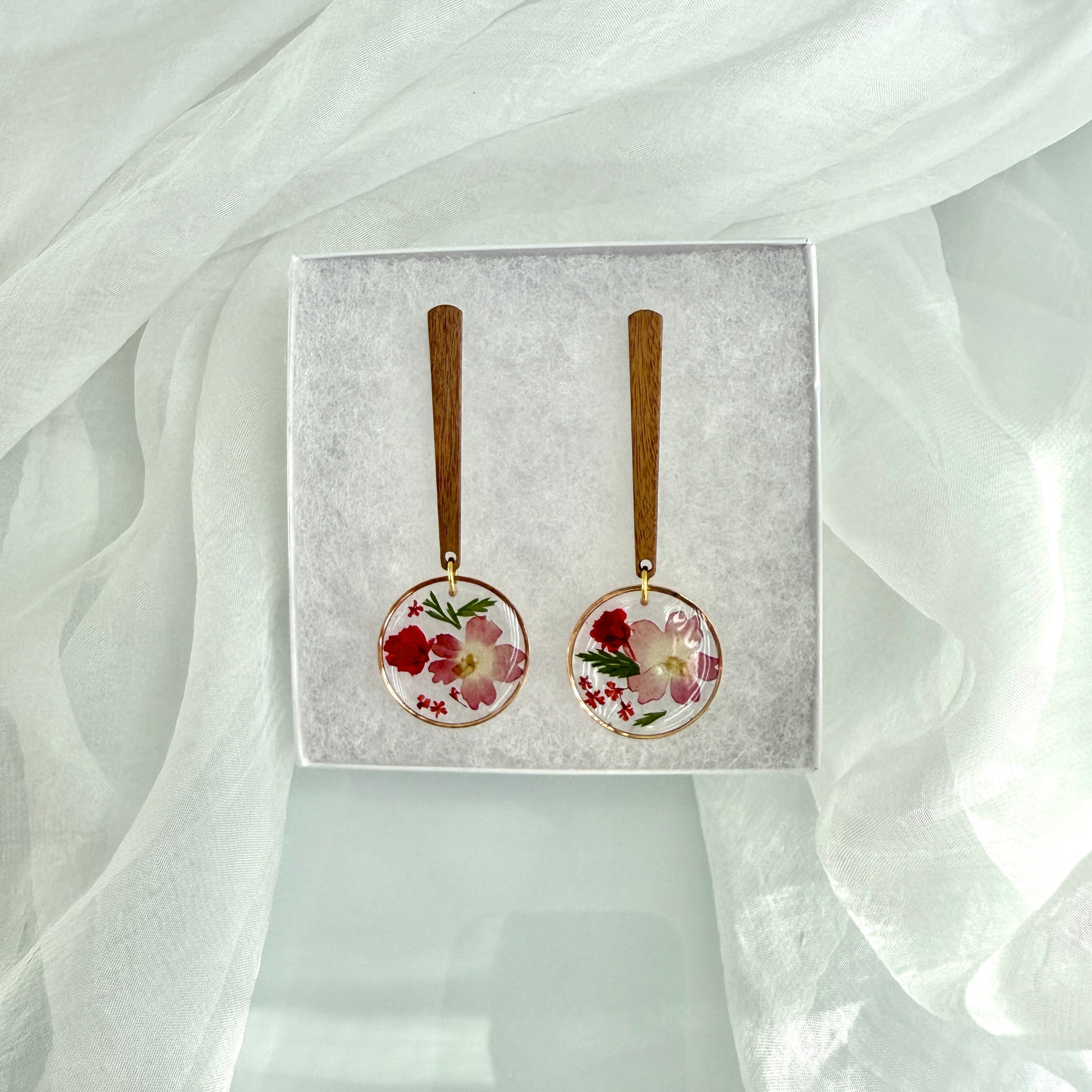 Real flowers set in gold tone ring(25mm) with resin and long wooden ear stud detail