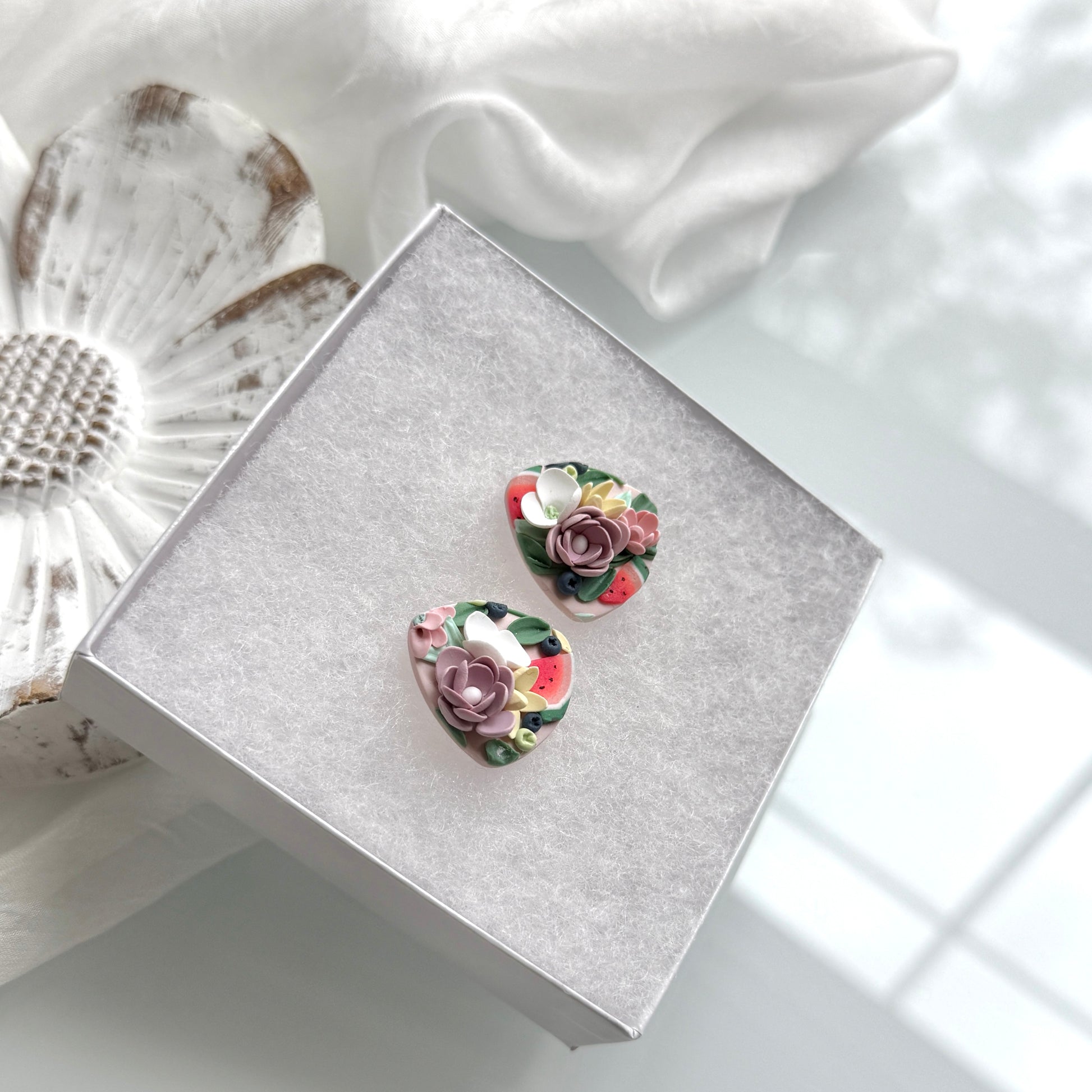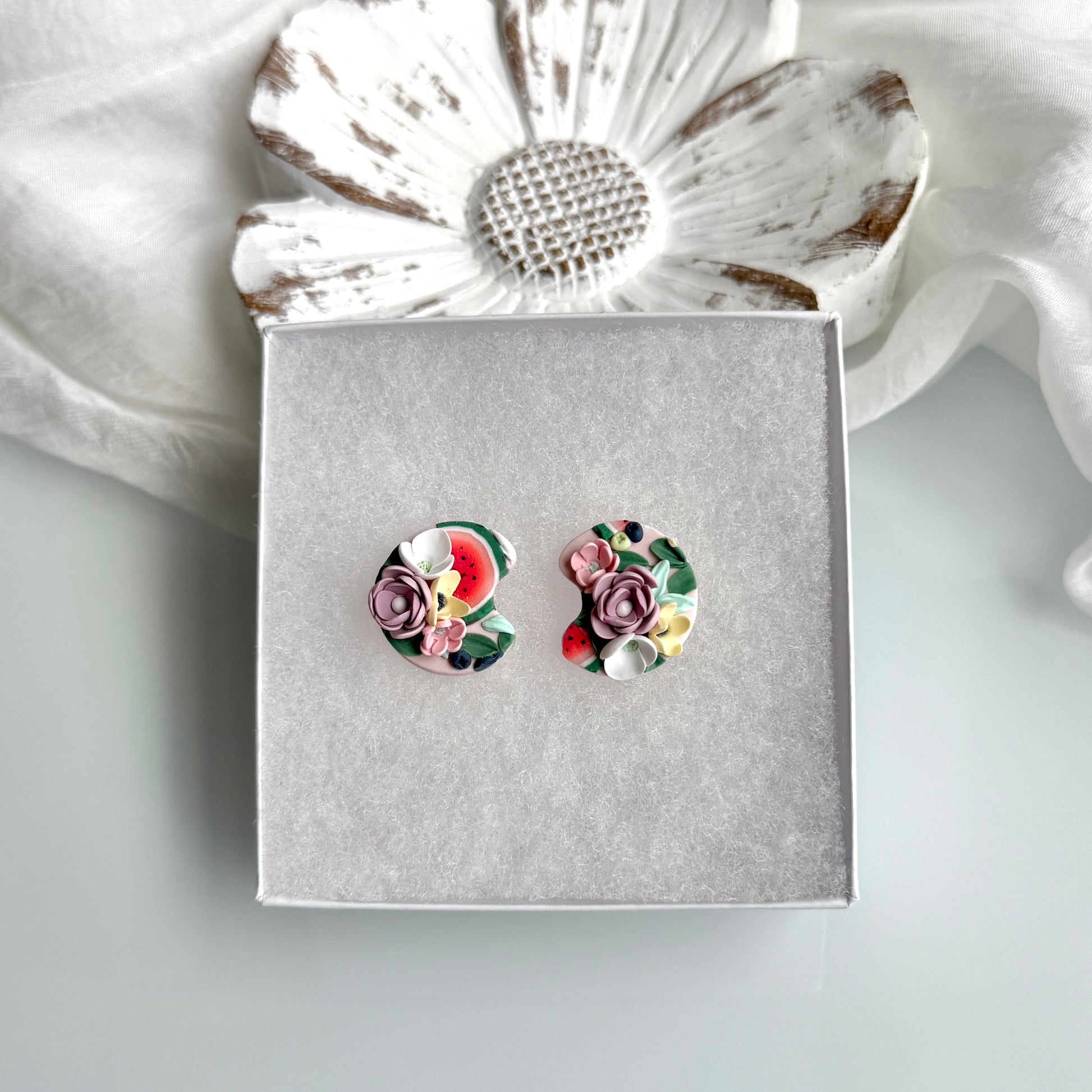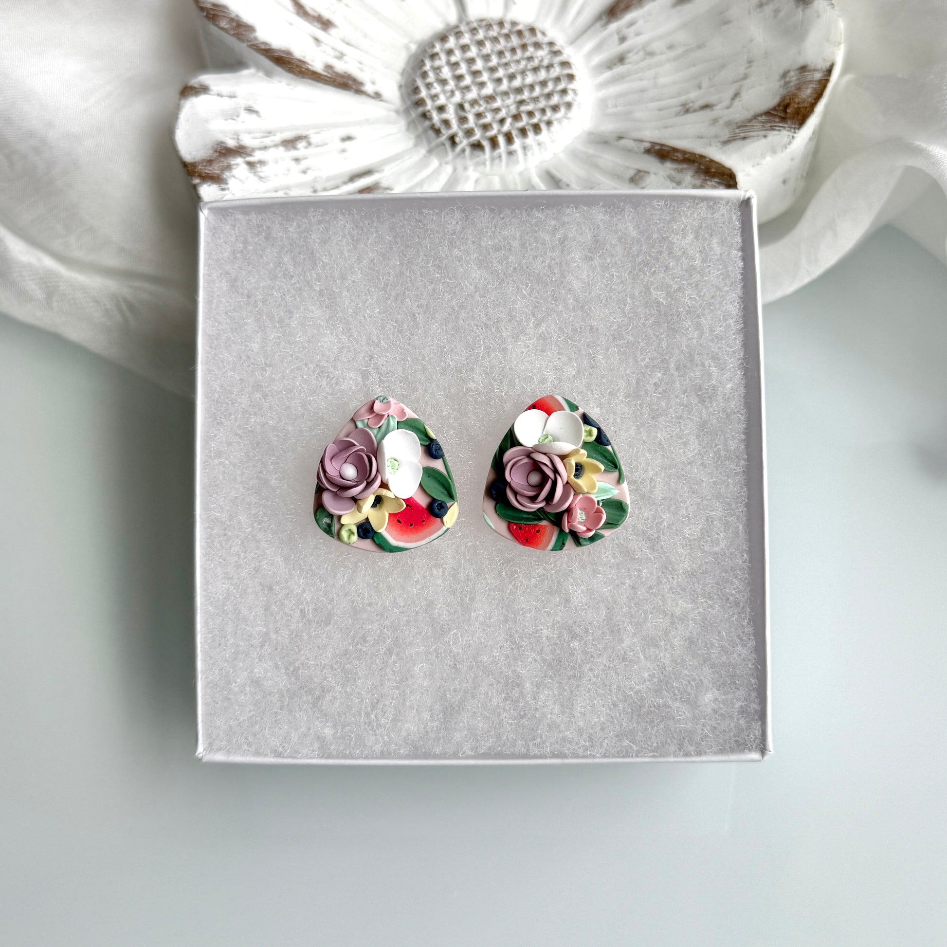 Please be mindful of the handmade nature of these clay creations. They can withstand normal wear but please refrain from wearing them in water, excessive heat or near tiny hands. Your earrings are delicate, especially the flower designs. Avoid the use of oils, cream or perfume, as they might affect the longevity. Please allow slight variances in pattern and color due to display differences.