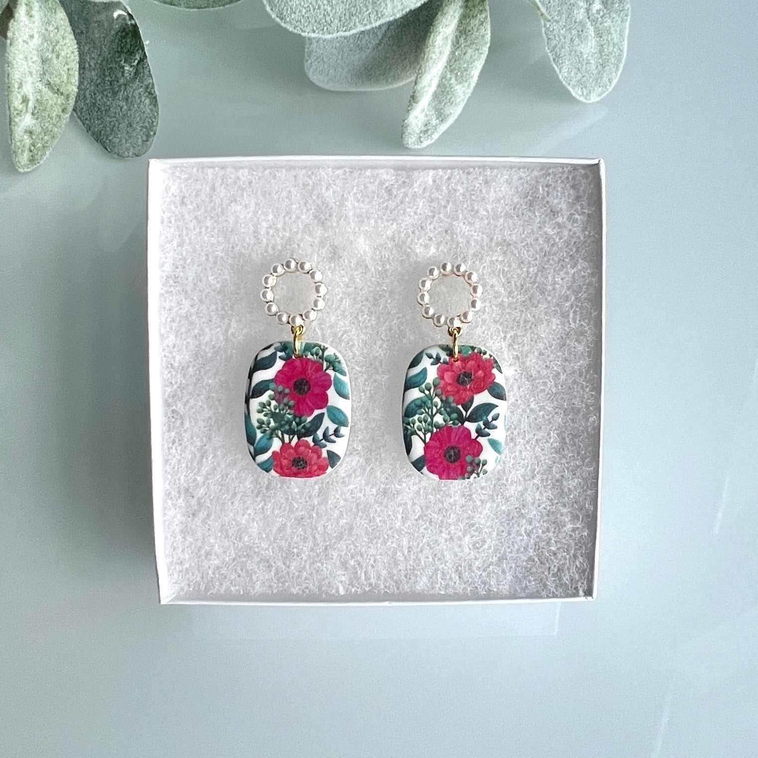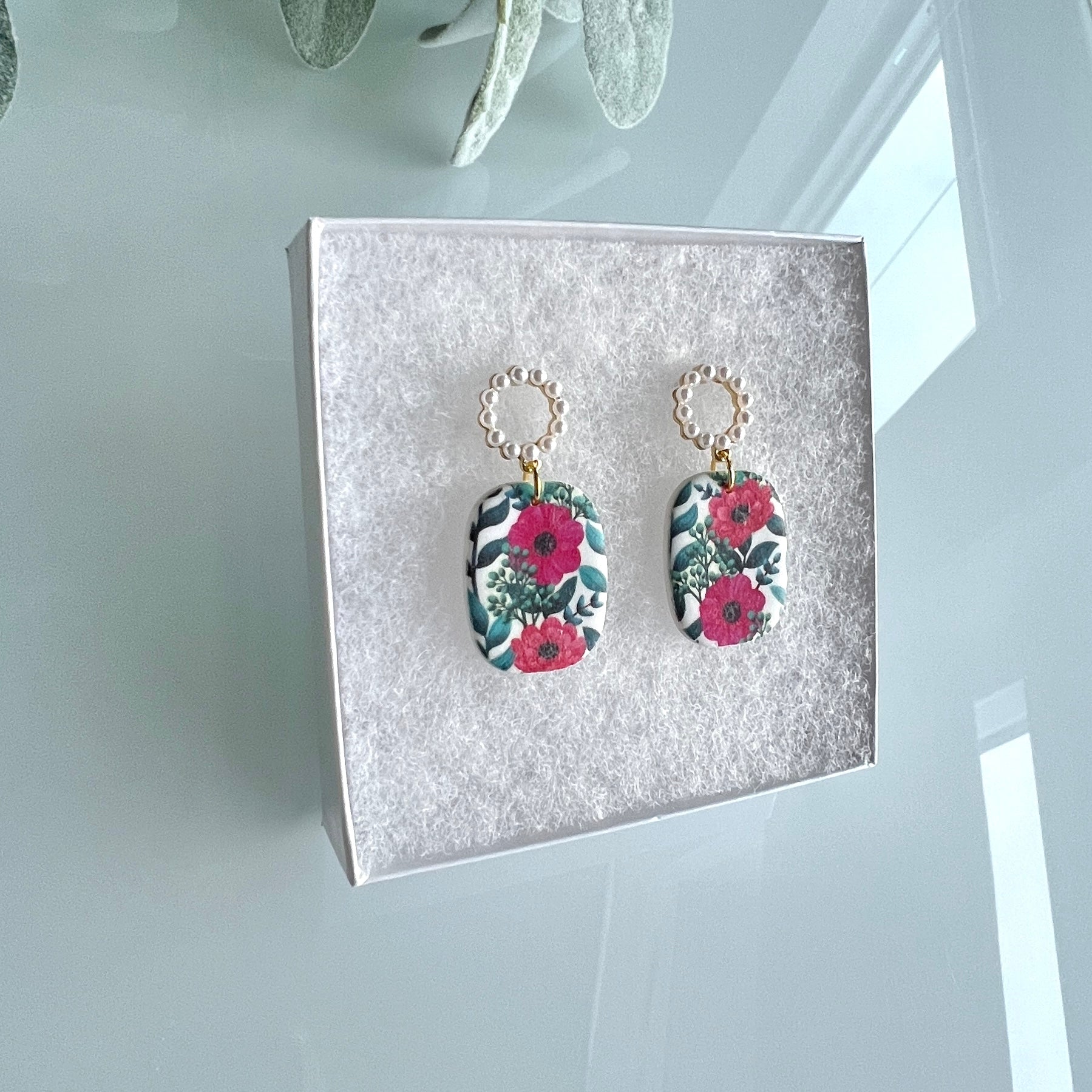 Blake flower print on white rounded rectangle with pearl ring detailed stud(12mm-diameter)