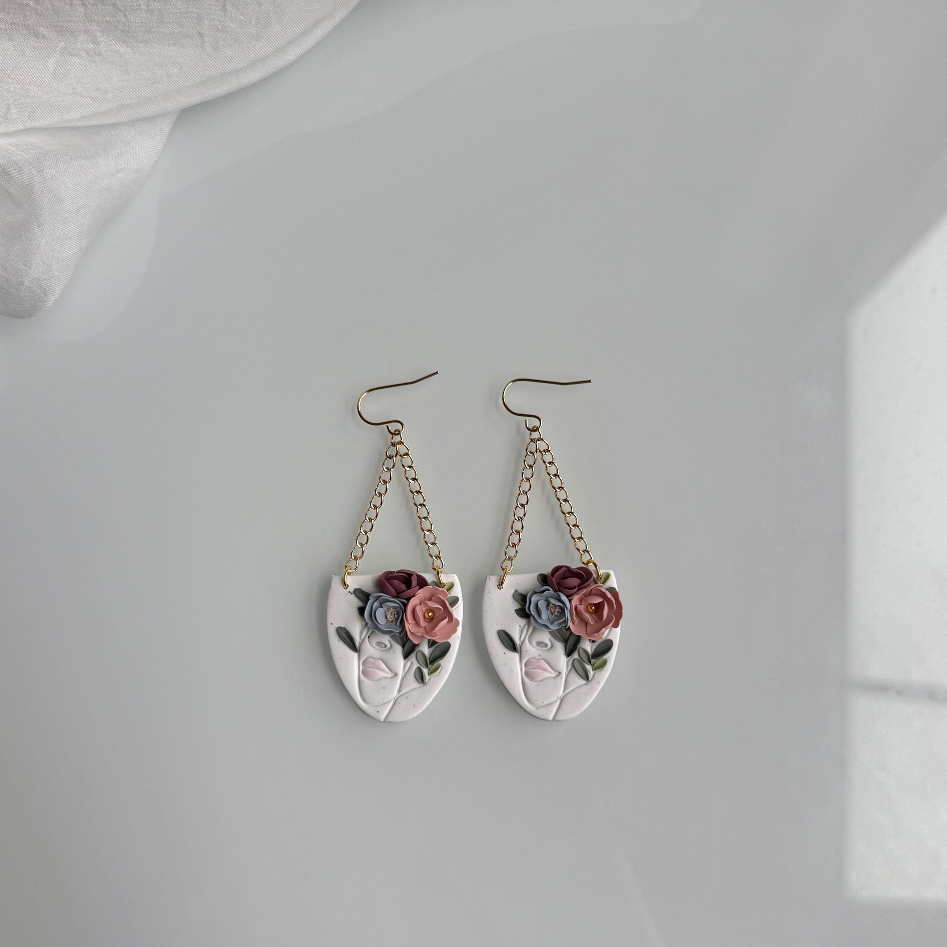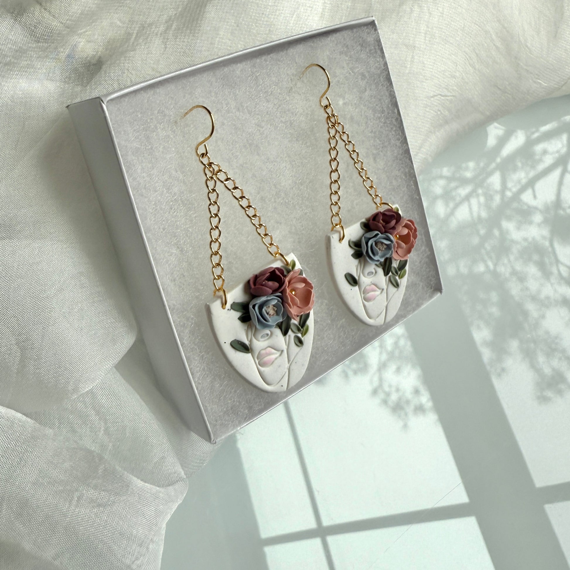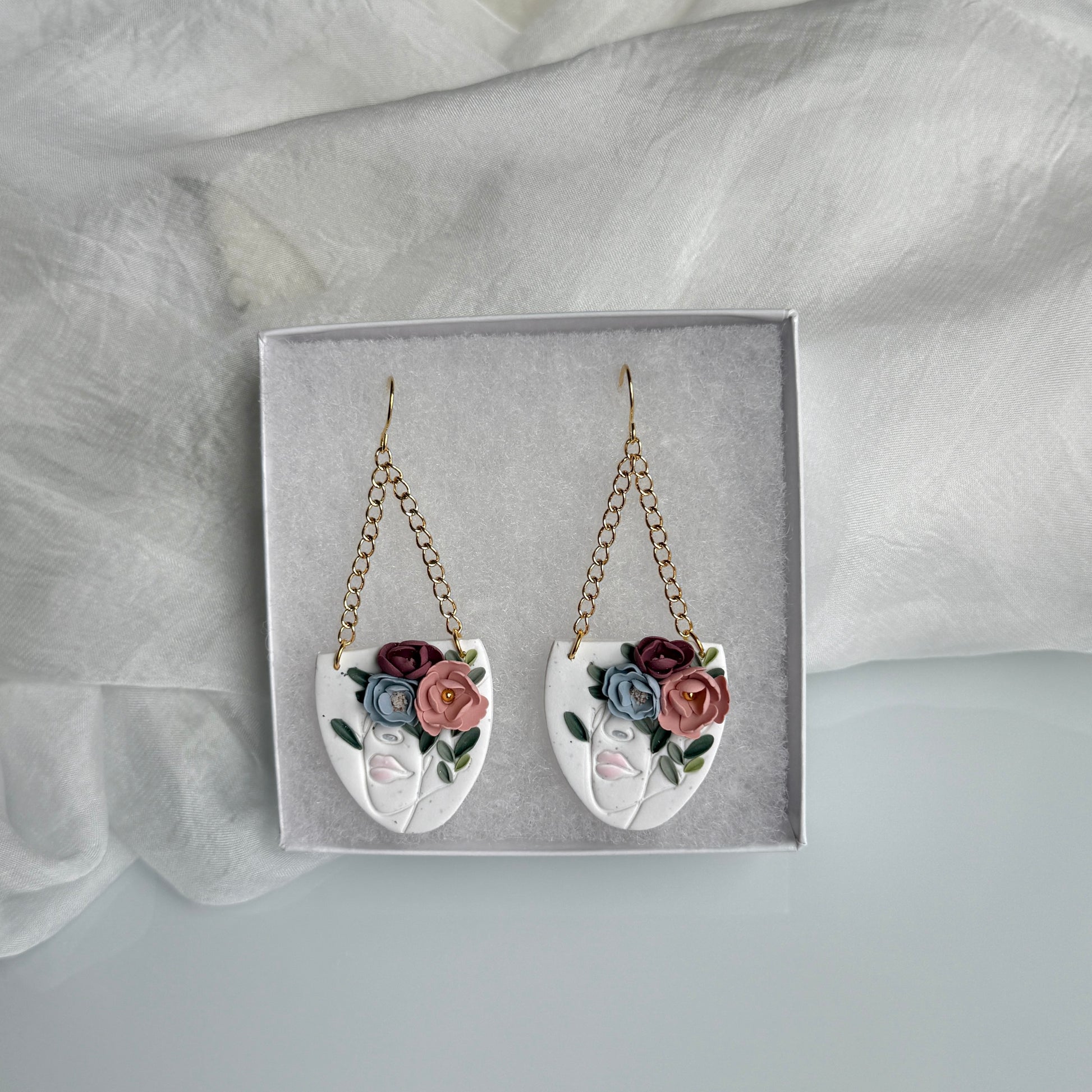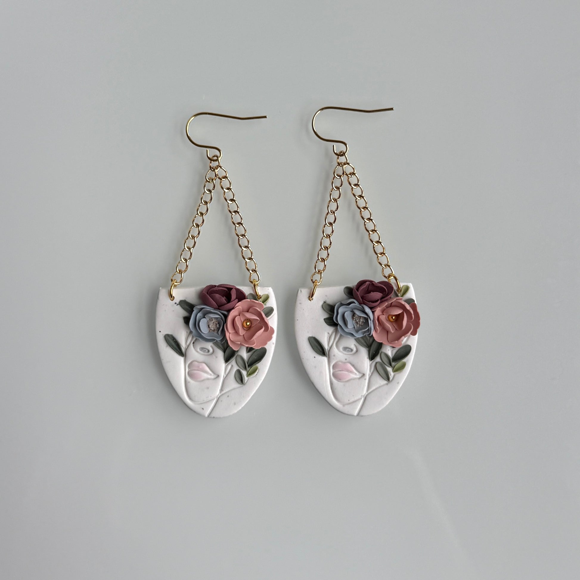 Bold statement earrings, with gorgeous face imprint on speckled white base, delicate coral, raisin and sky blue color flowers, as well as chain detail and standard ear hooks