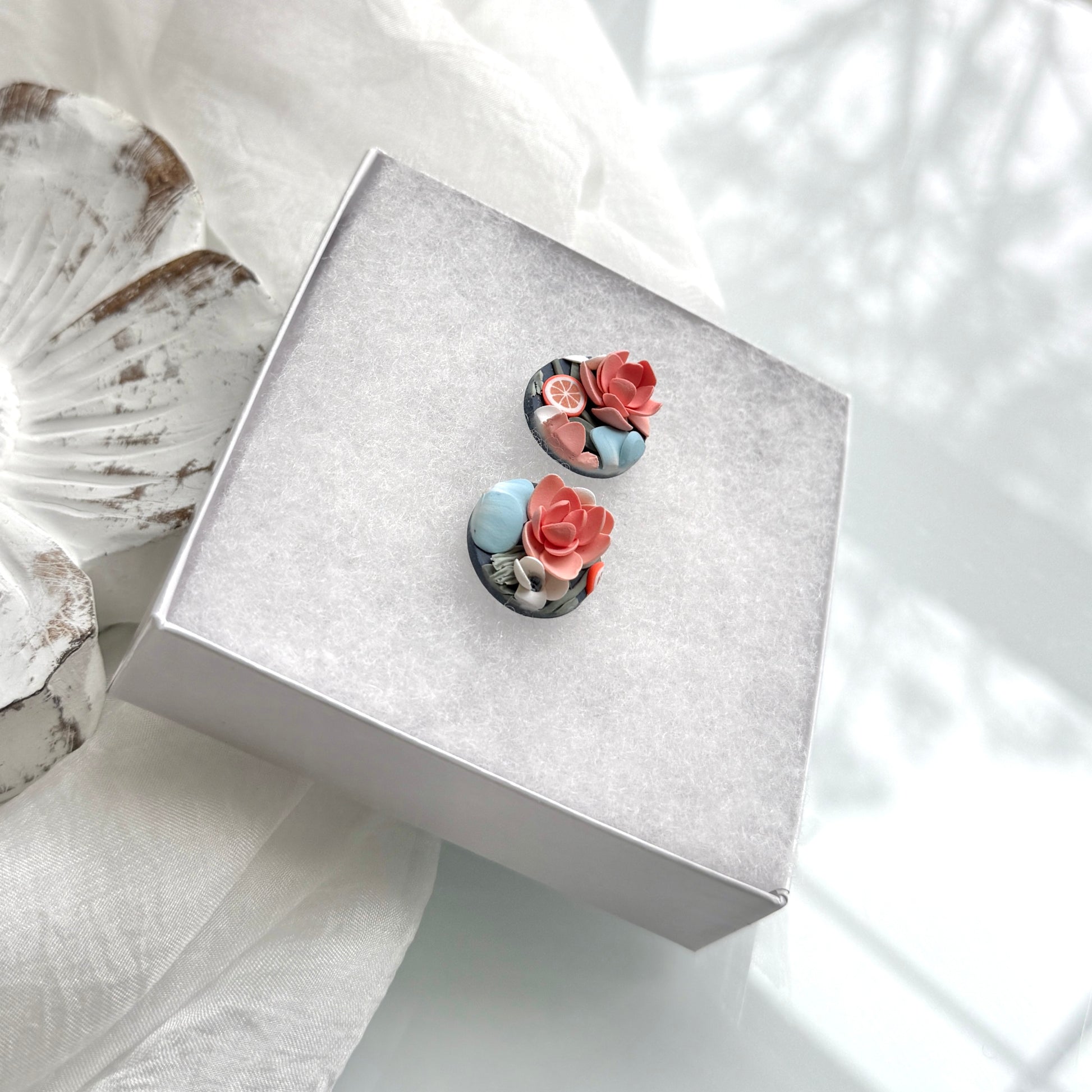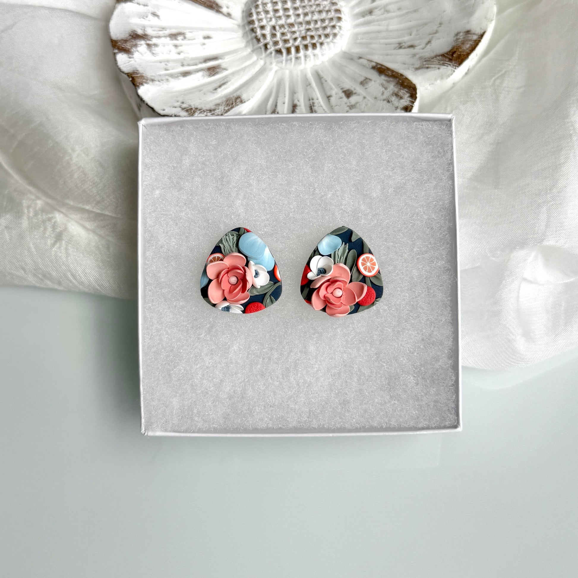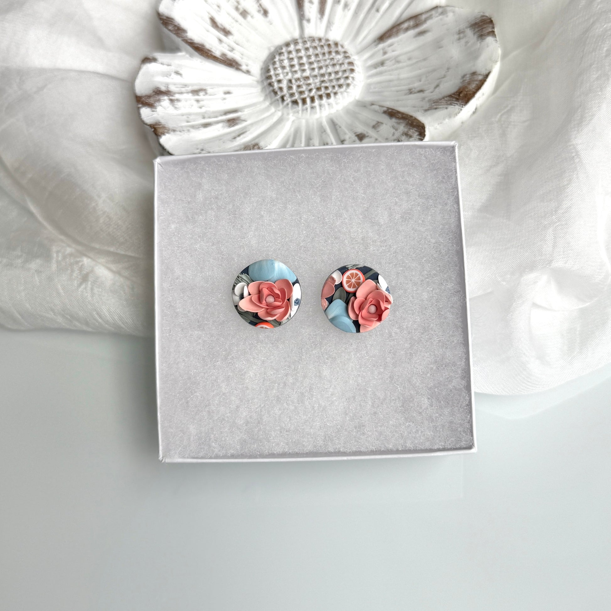 Please be mindful of the handmade nature of these clay creations. They can withstand normal wear but please refrain from wearing them in water, excessive heat or near tiny hands. Your earrings are delicate, especially the flower designs. Avoid the use of oils, cream or perfume, as they might affect the longevity. Please allow slight variances in pattern and color due to display differences.