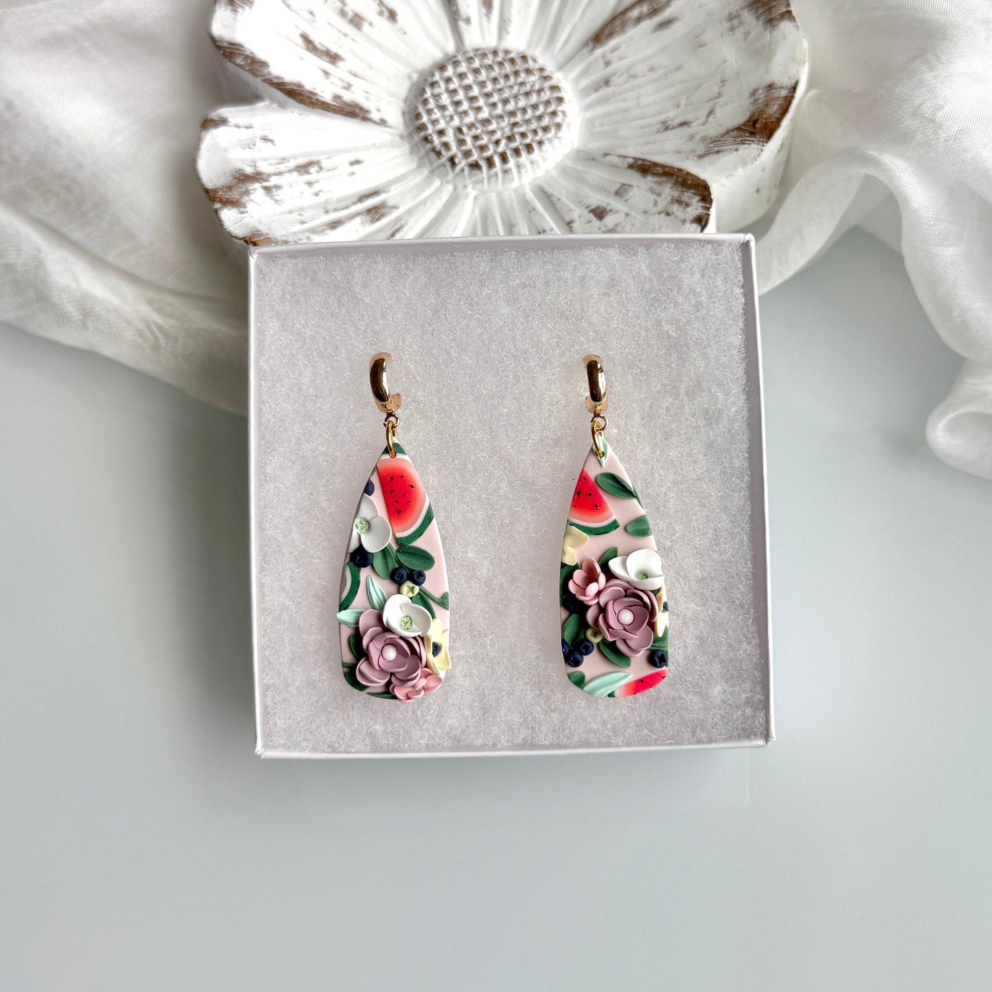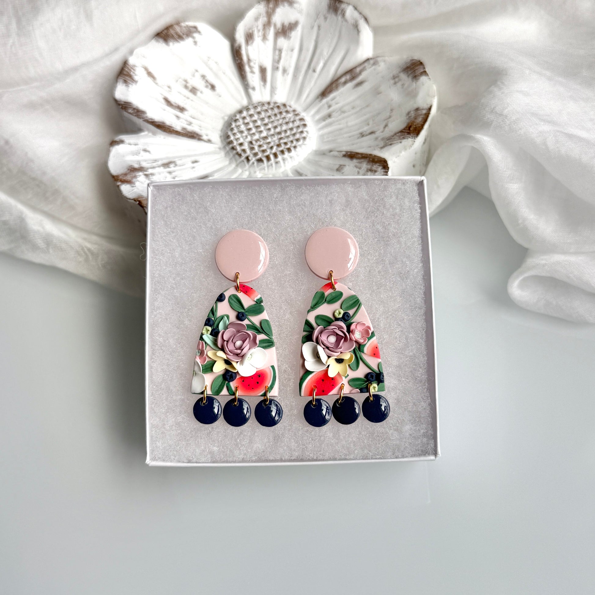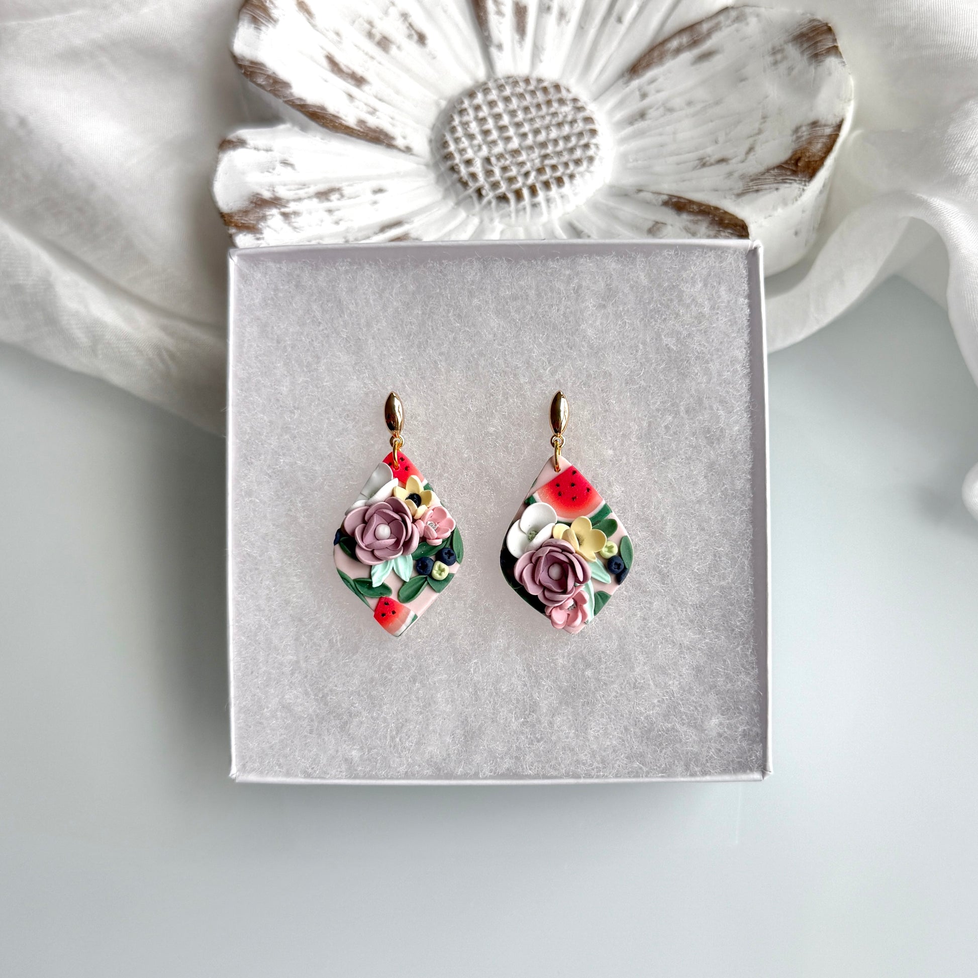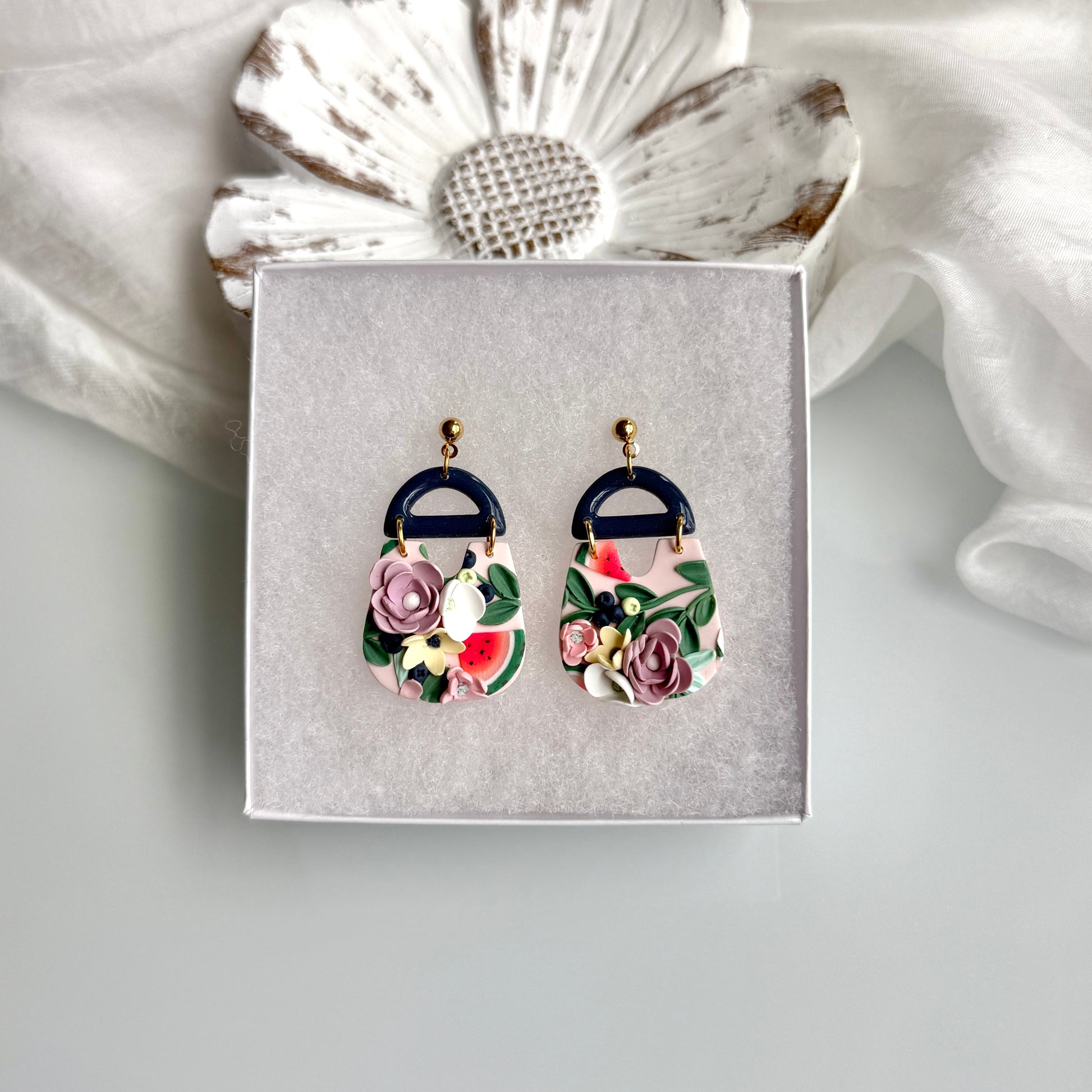 Please be mindful of the handmade nature of these clay creations. They can withstand normal wear but please refrain from wearing them in water, excessive heat or near tiny hands. Your earrings are delicate, especially the flower designs. Avoid the use of oils, cream or perfume, as they might affect the longevity. Please allow slight variances in pattern and color due to display differences.