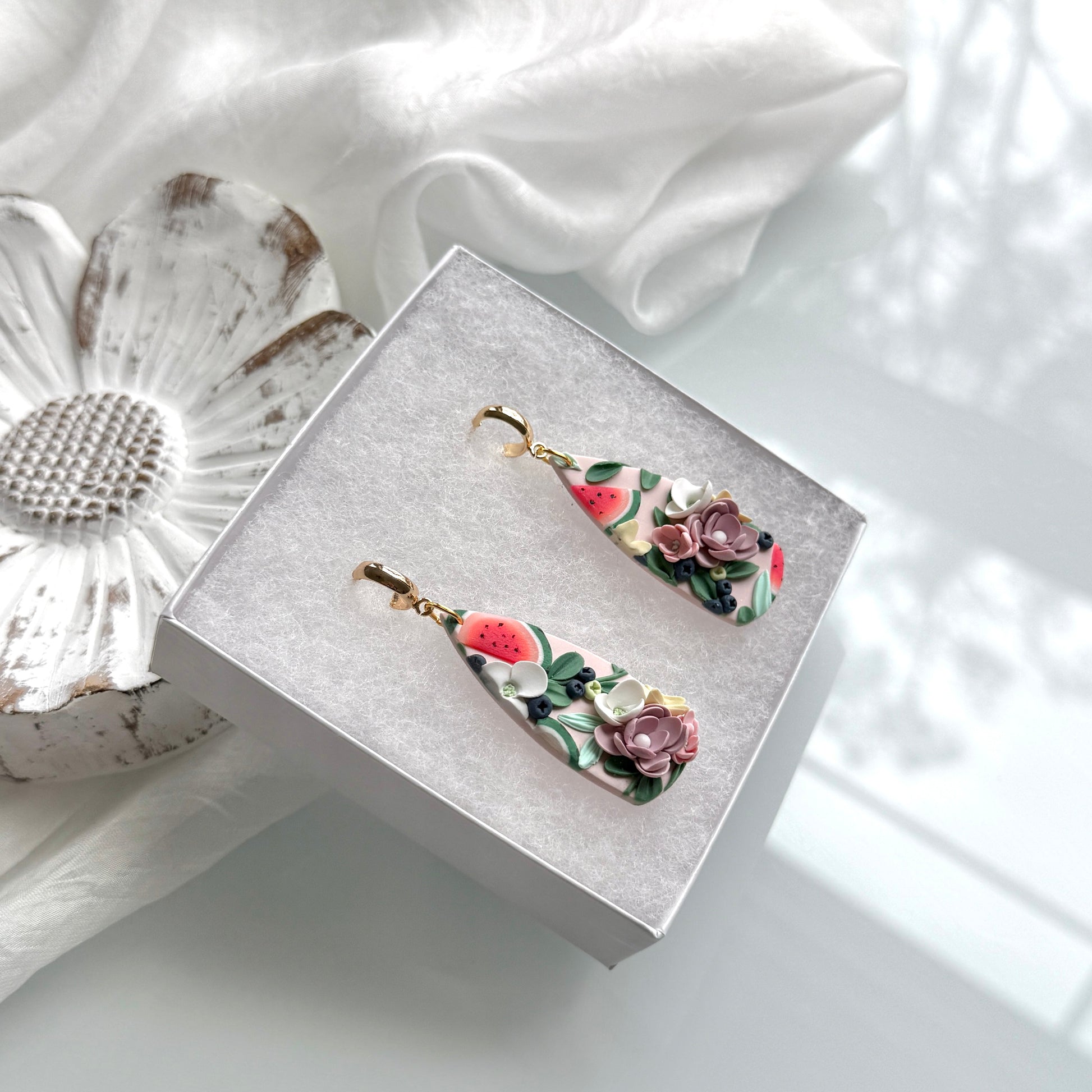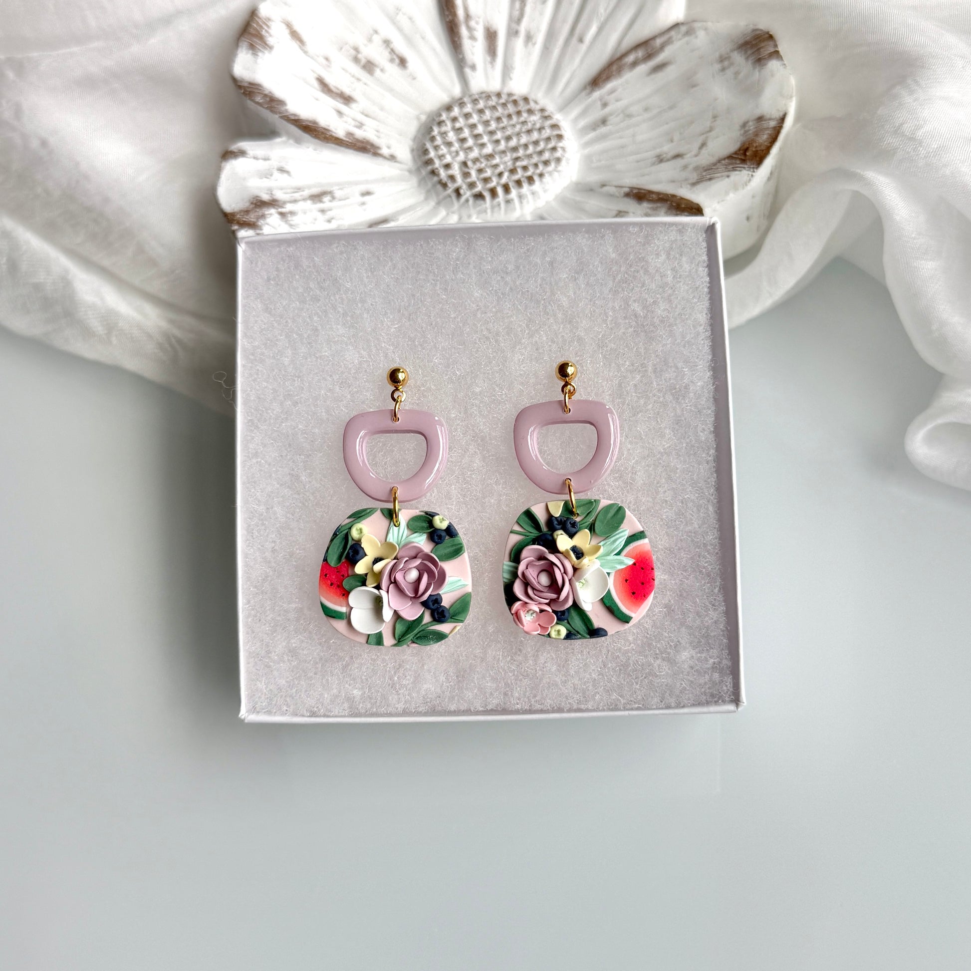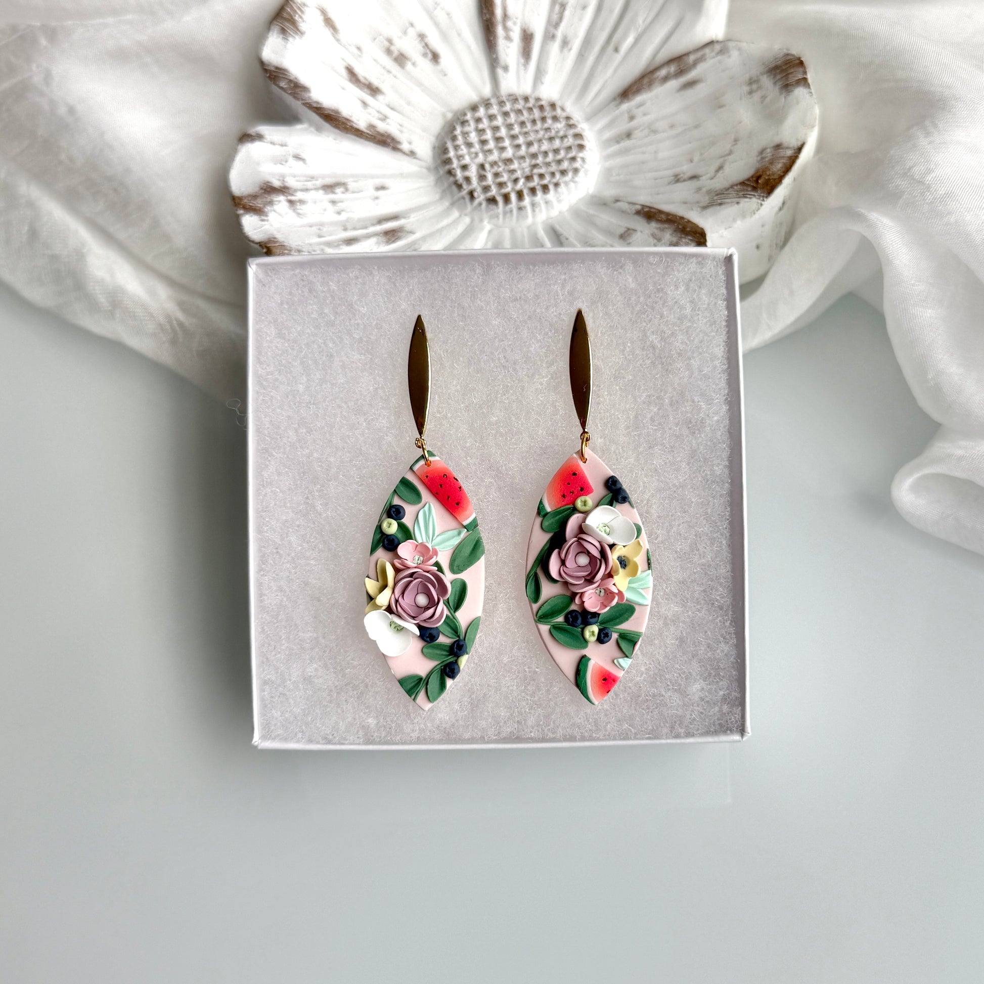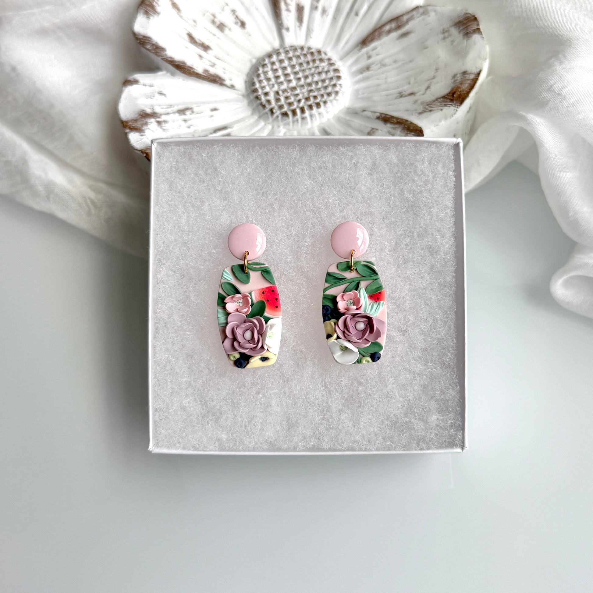 Please be mindful of the handmade nature of these clay creations. They can withstand normal wear but please refrain from wearing them in water, excessive heat or near tiny hands. Your earrings are delicate, especially the flower designs. Avoid the use of oils, cream or perfume, as they might affect the longevity. Please allow slight variances in pattern and color due to display differences.