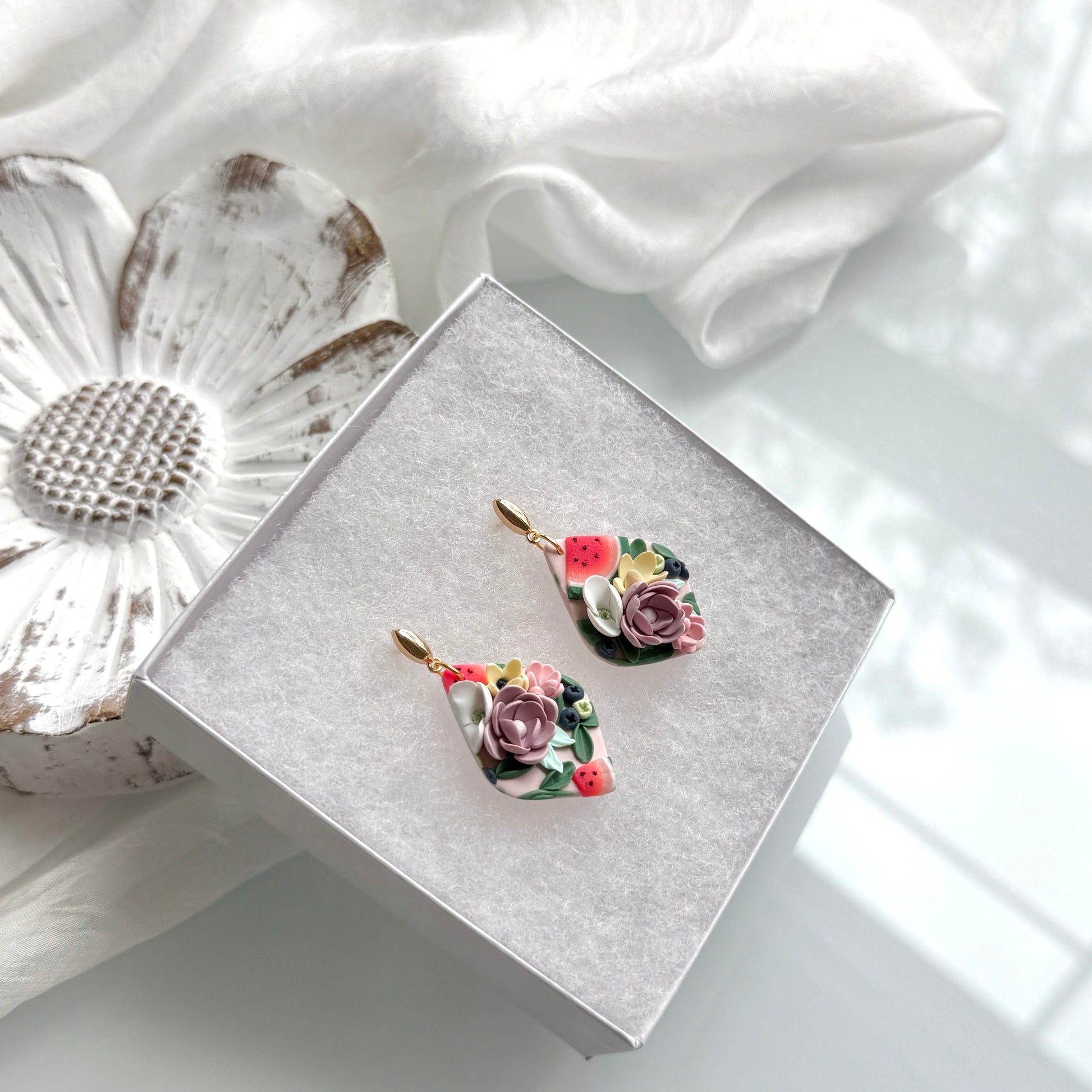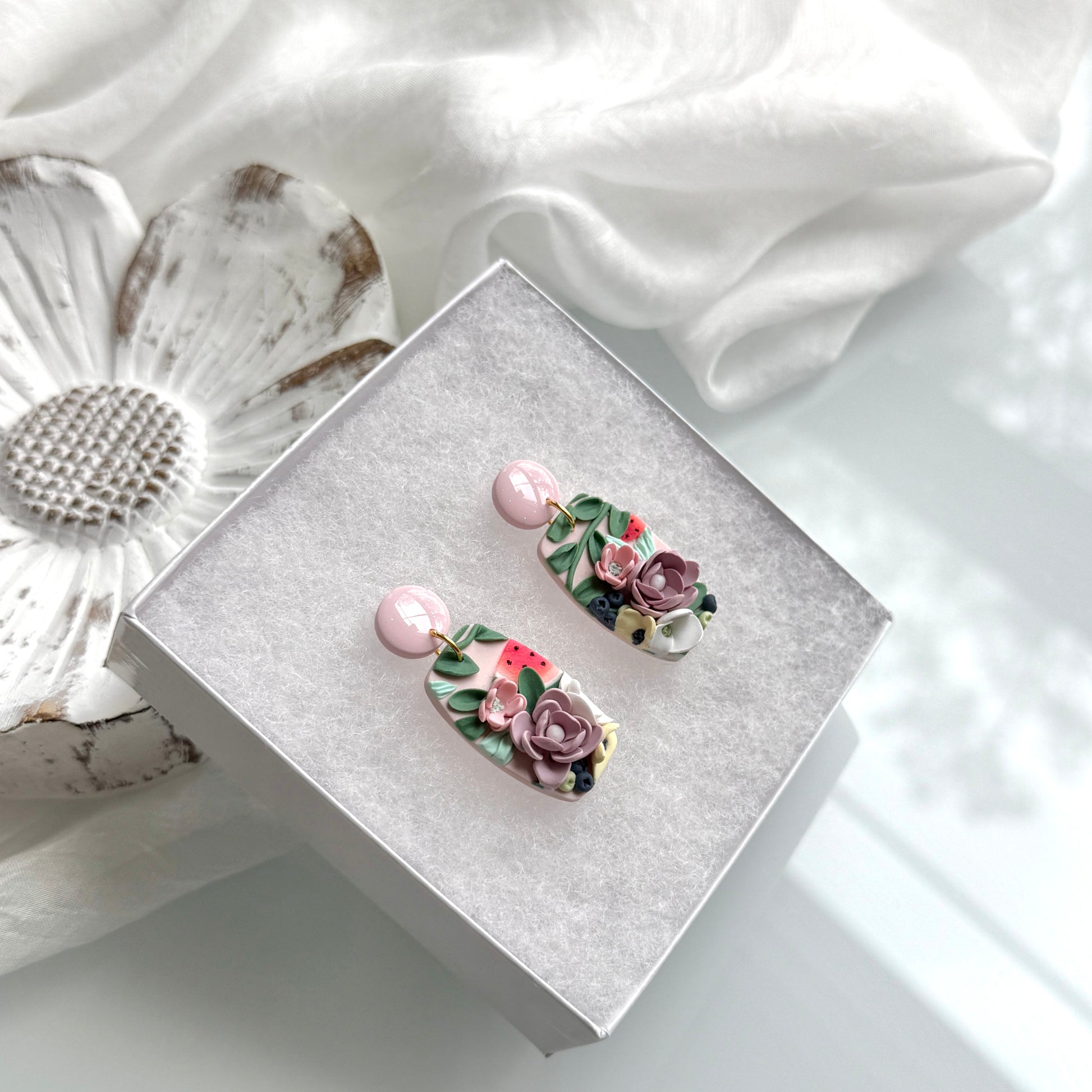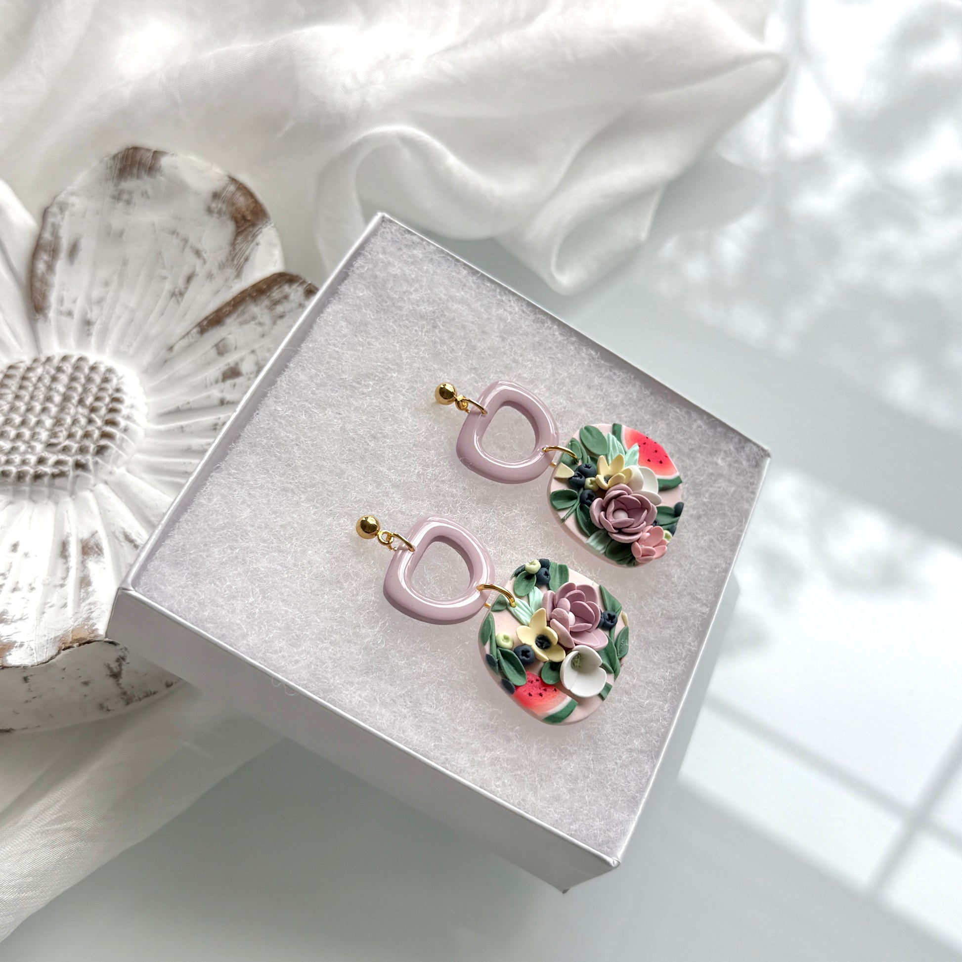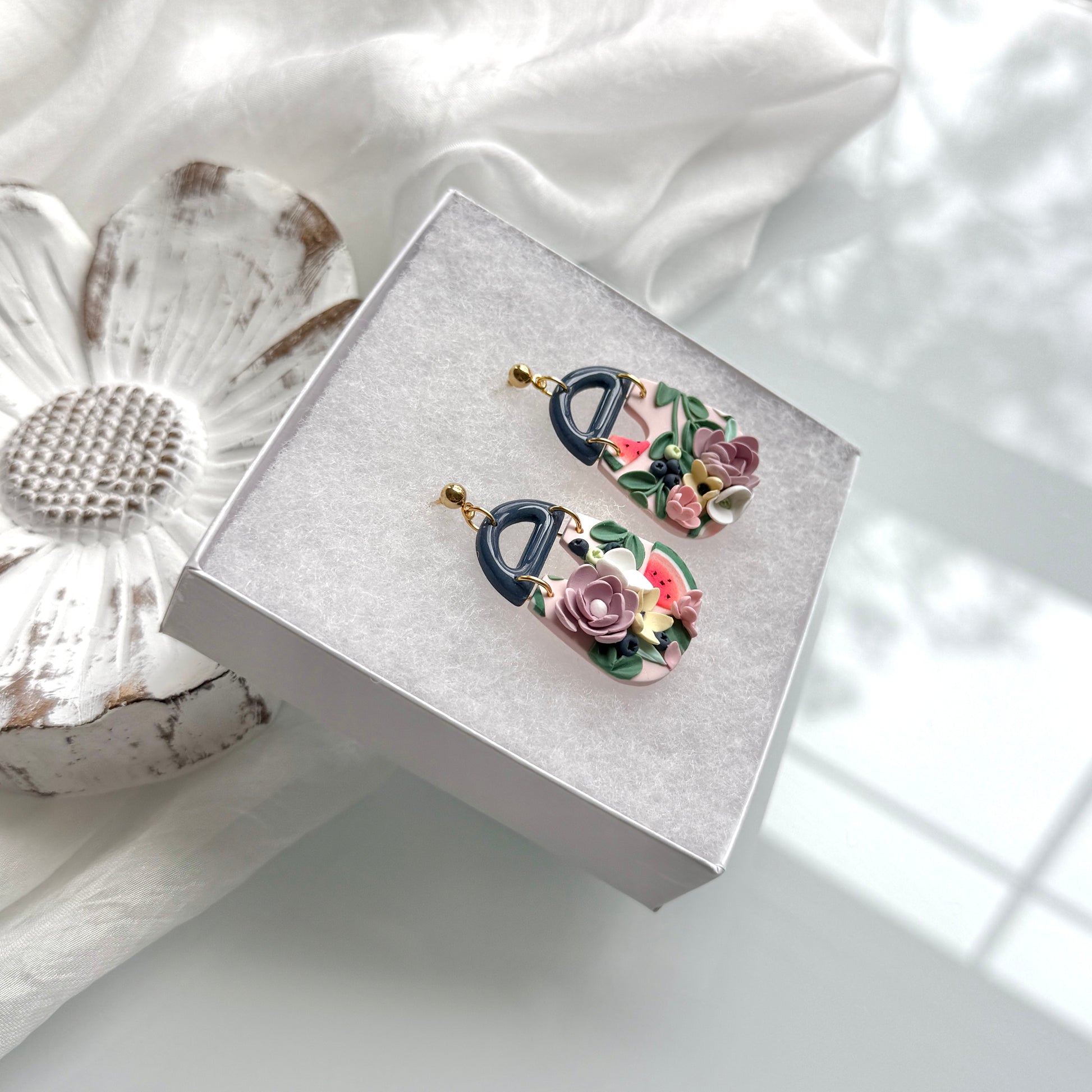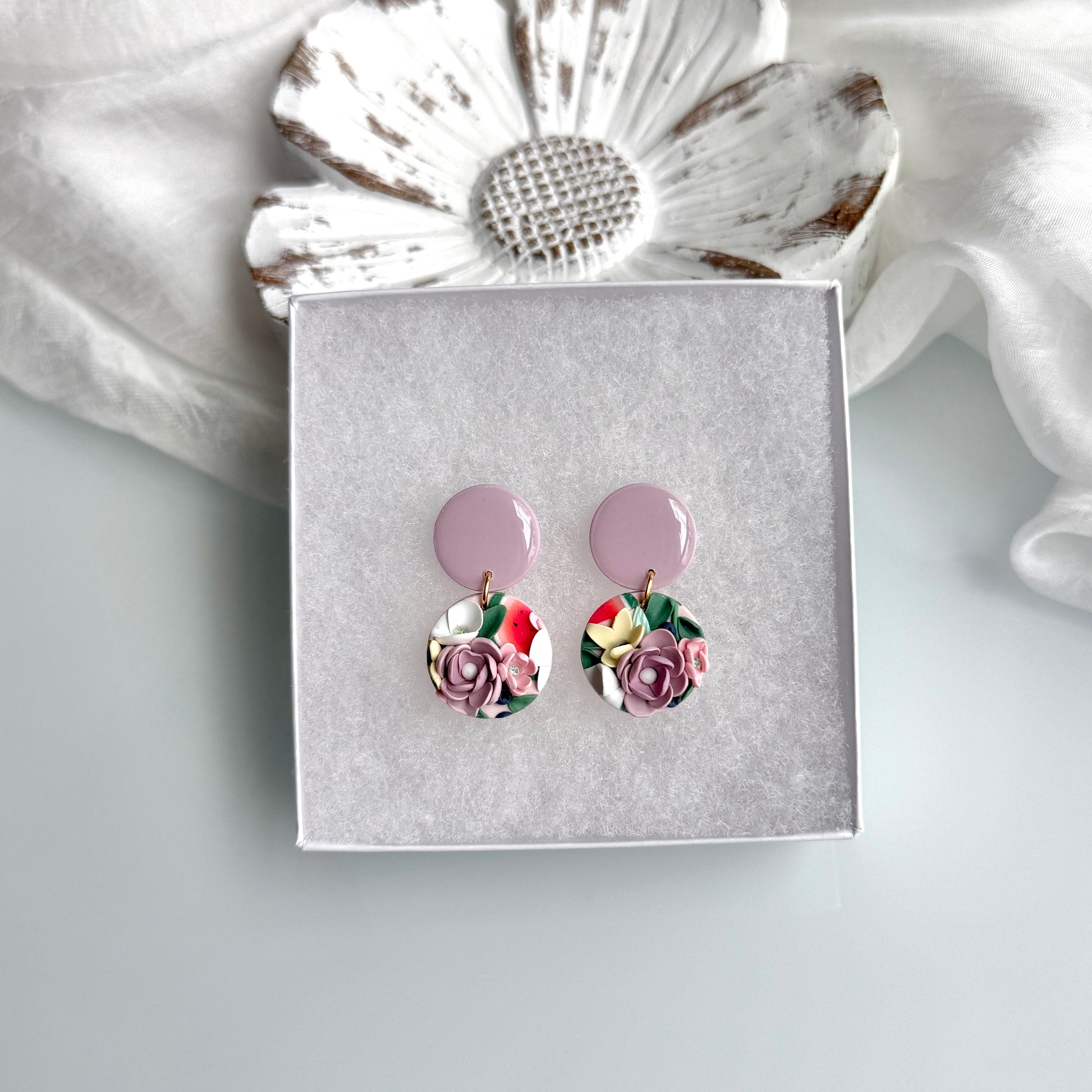 Please be mindful of the handmade nature of these clay creations. They can withstand normal wear but please refrain from wearing them in water, excessive heat or near tiny hands. Your earrings are delicate, especially the flower designs. Avoid the use of oils, cream or perfume, as they might affect the longevity. Please allow slight variances in pattern and color due to display differences.