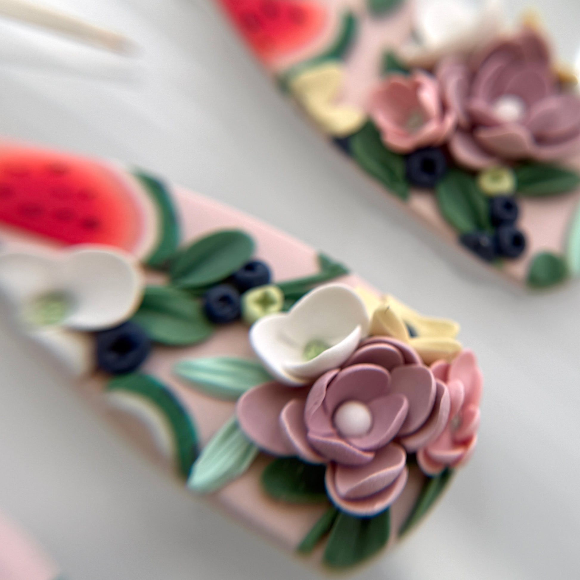Beautiful pastel Lilac, Pink, Yellow and White flowers with bright Watermelon slices, Blueberries and hints of Lime green and Mint green on a Nude Pink base: