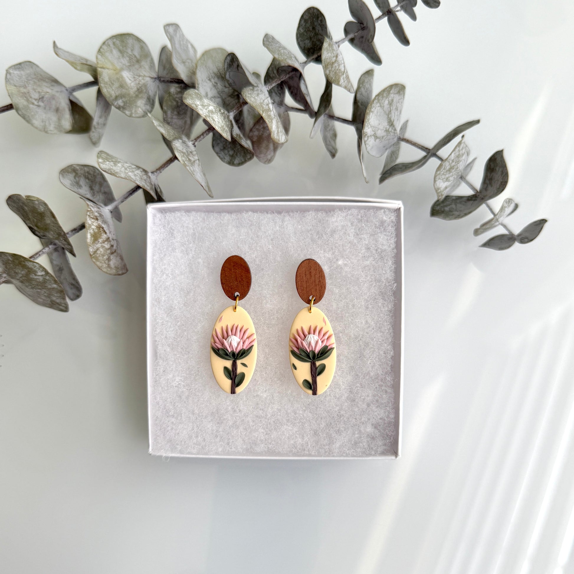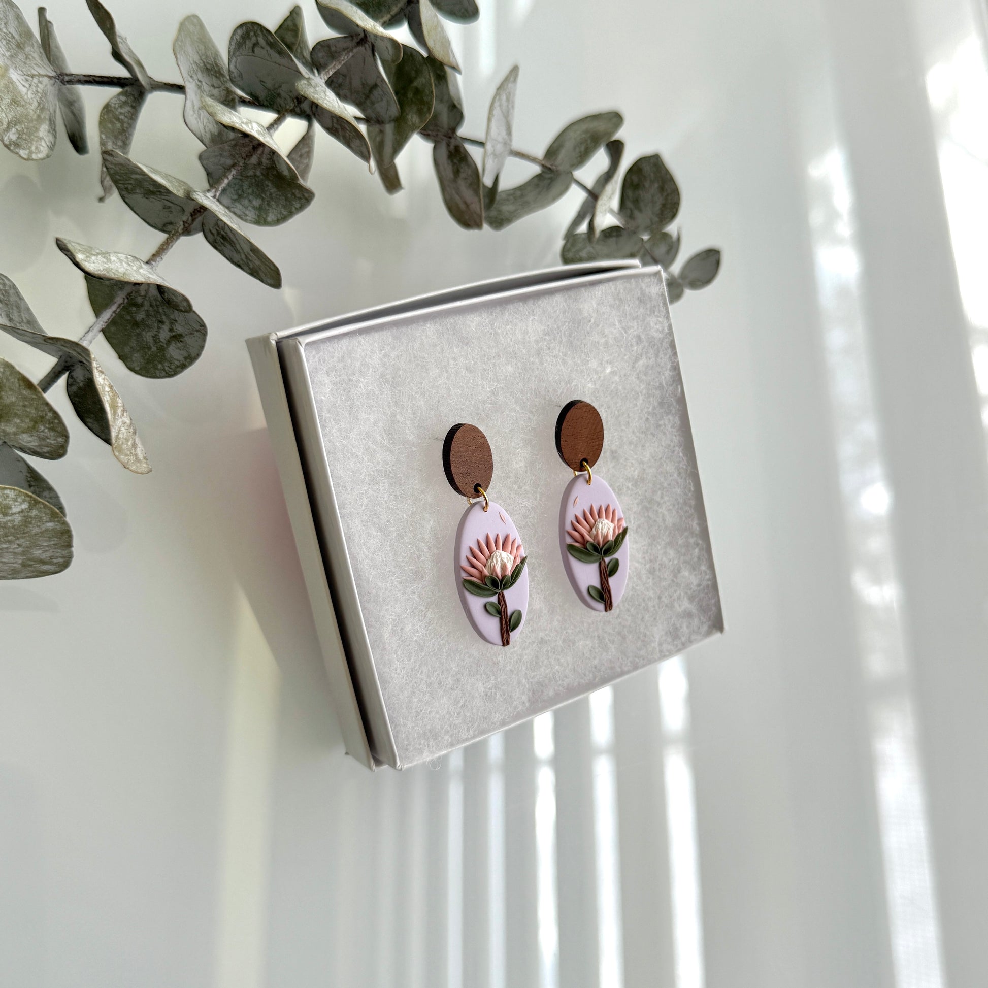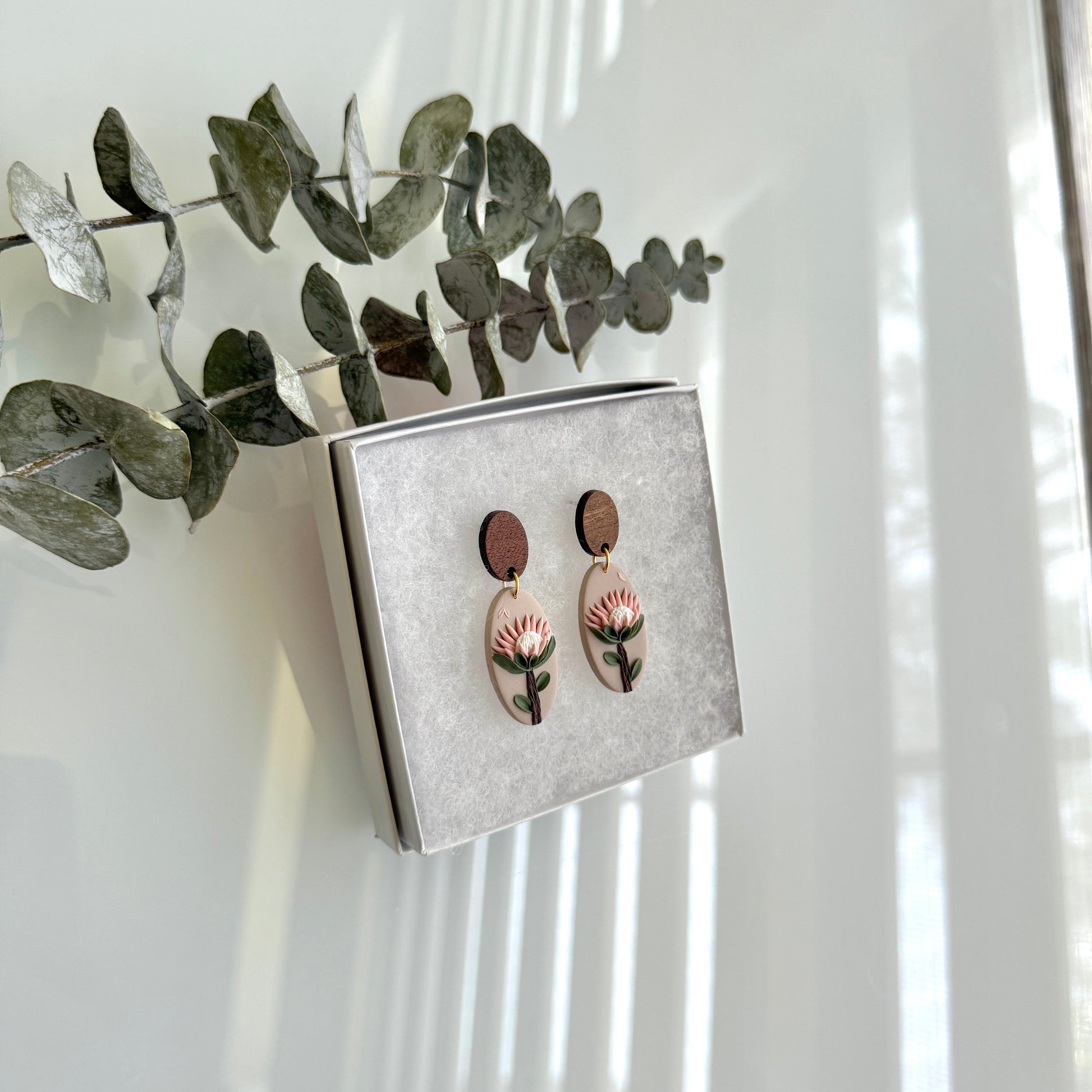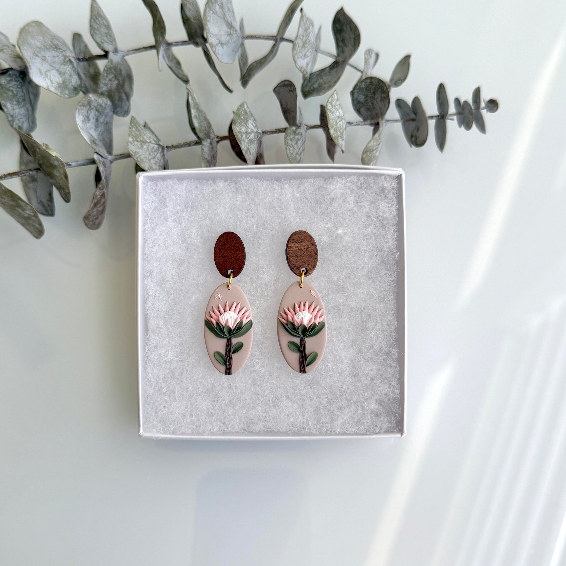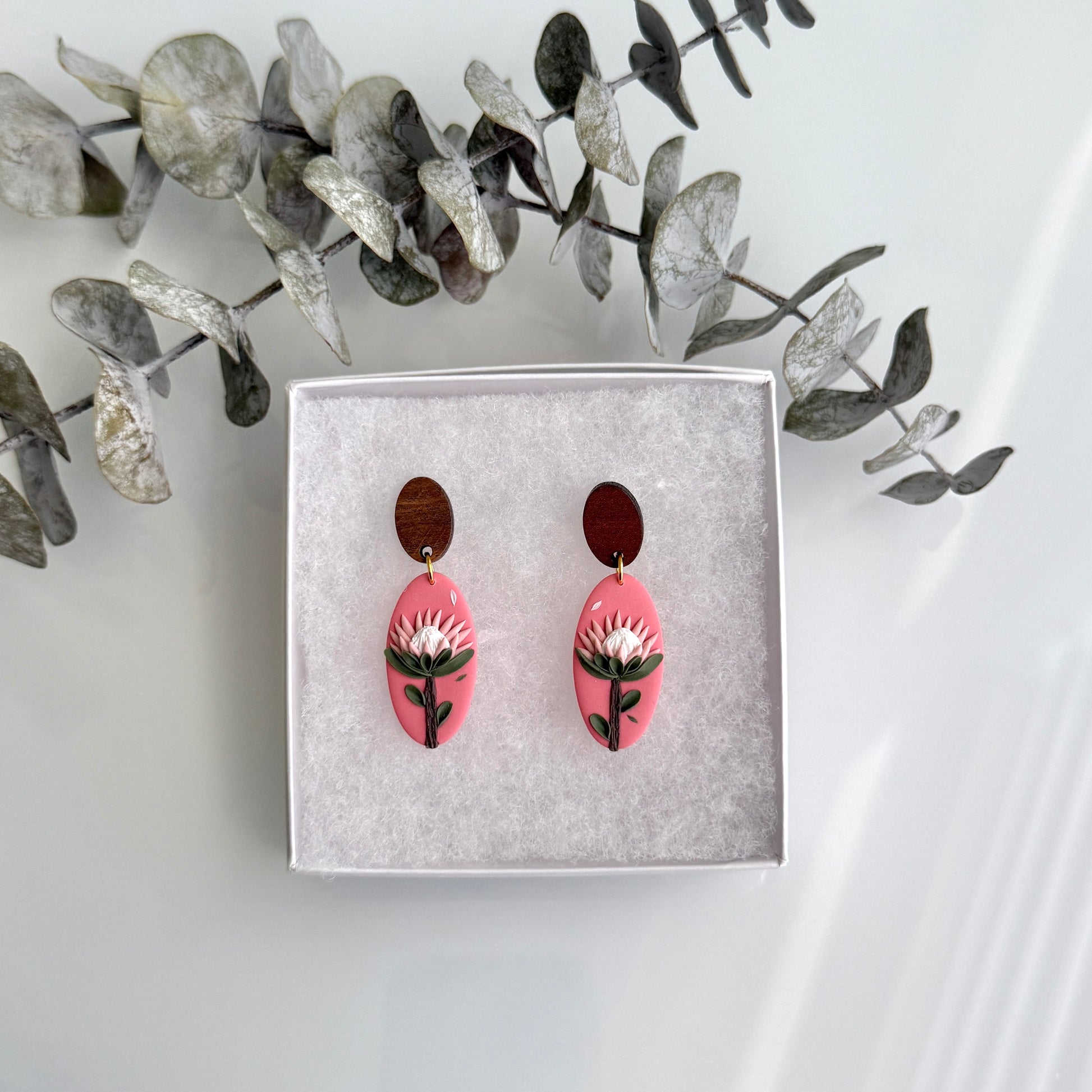 Ever popular ballet Pink Protea flowers on beautiful color base with wooden oval stud detail.