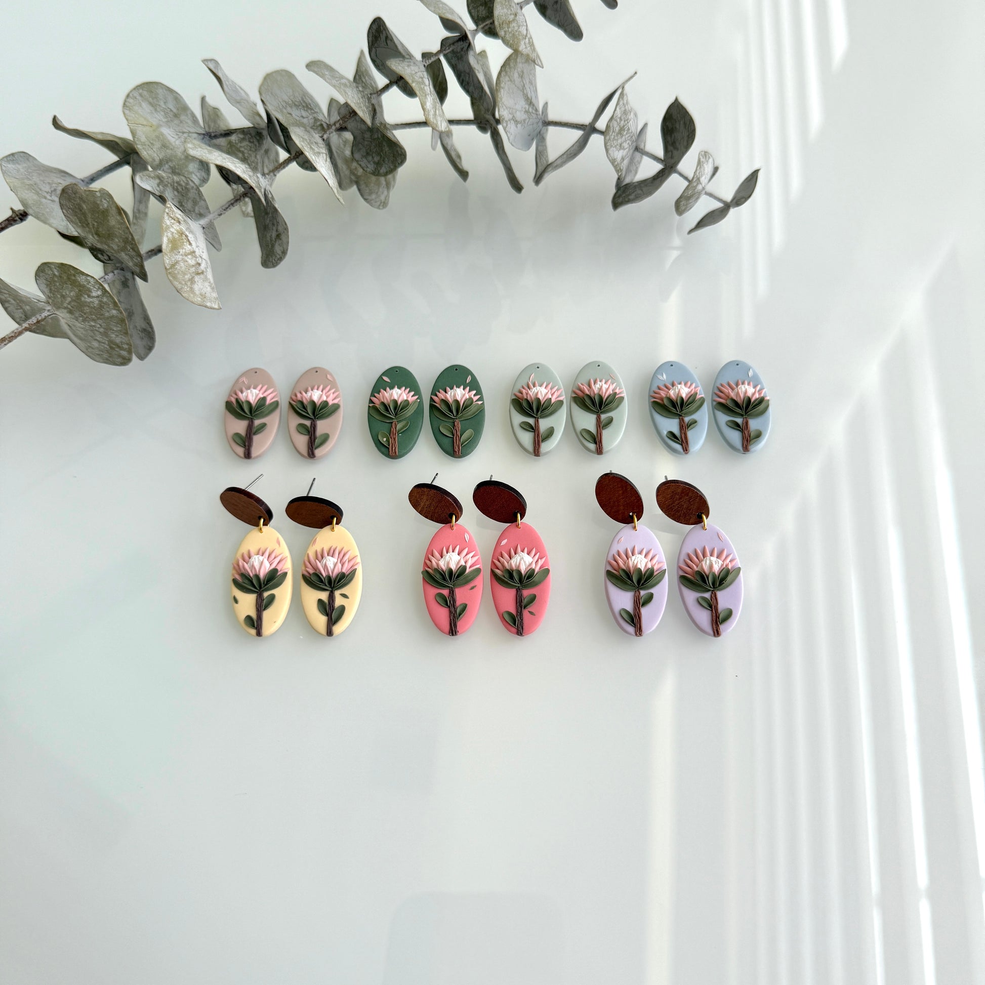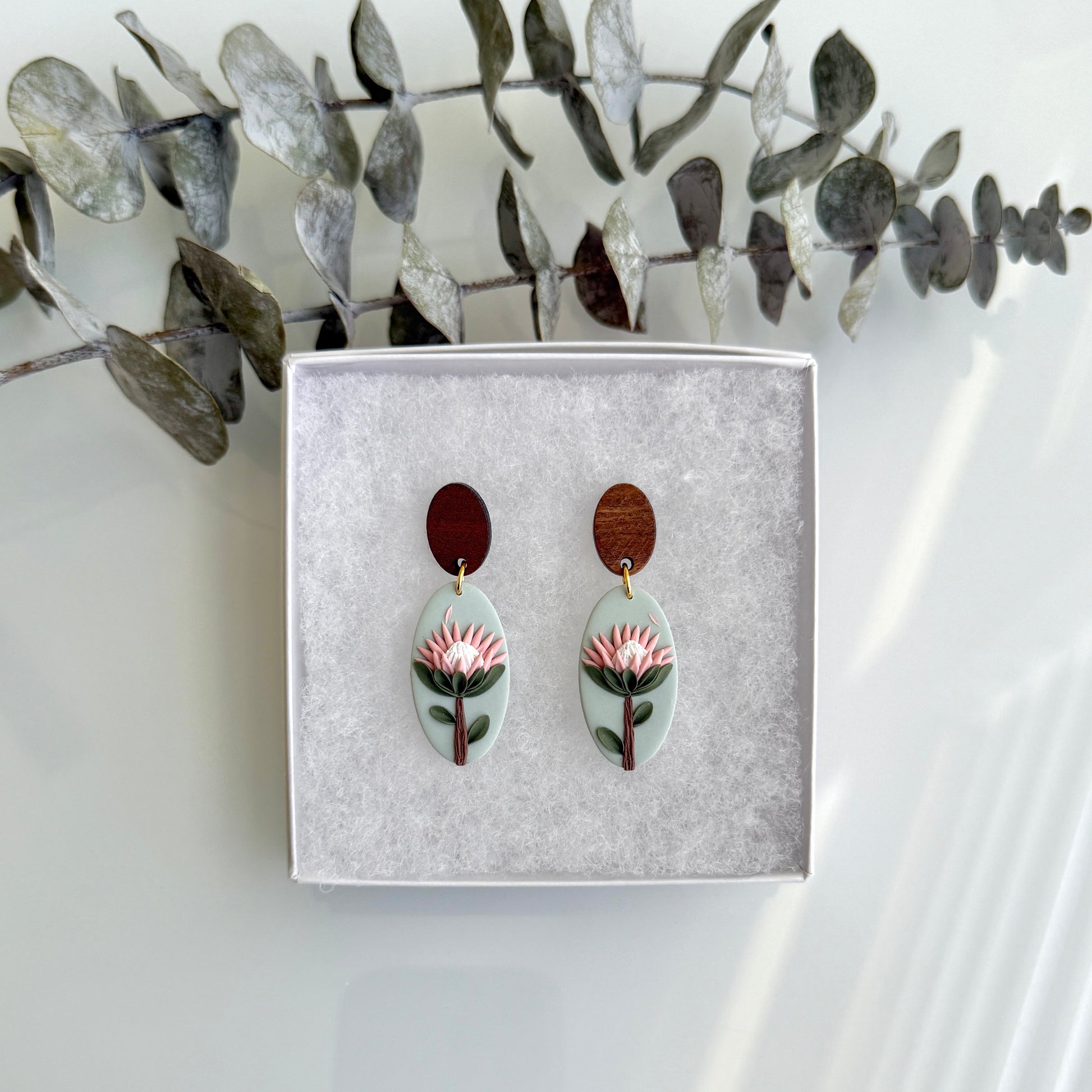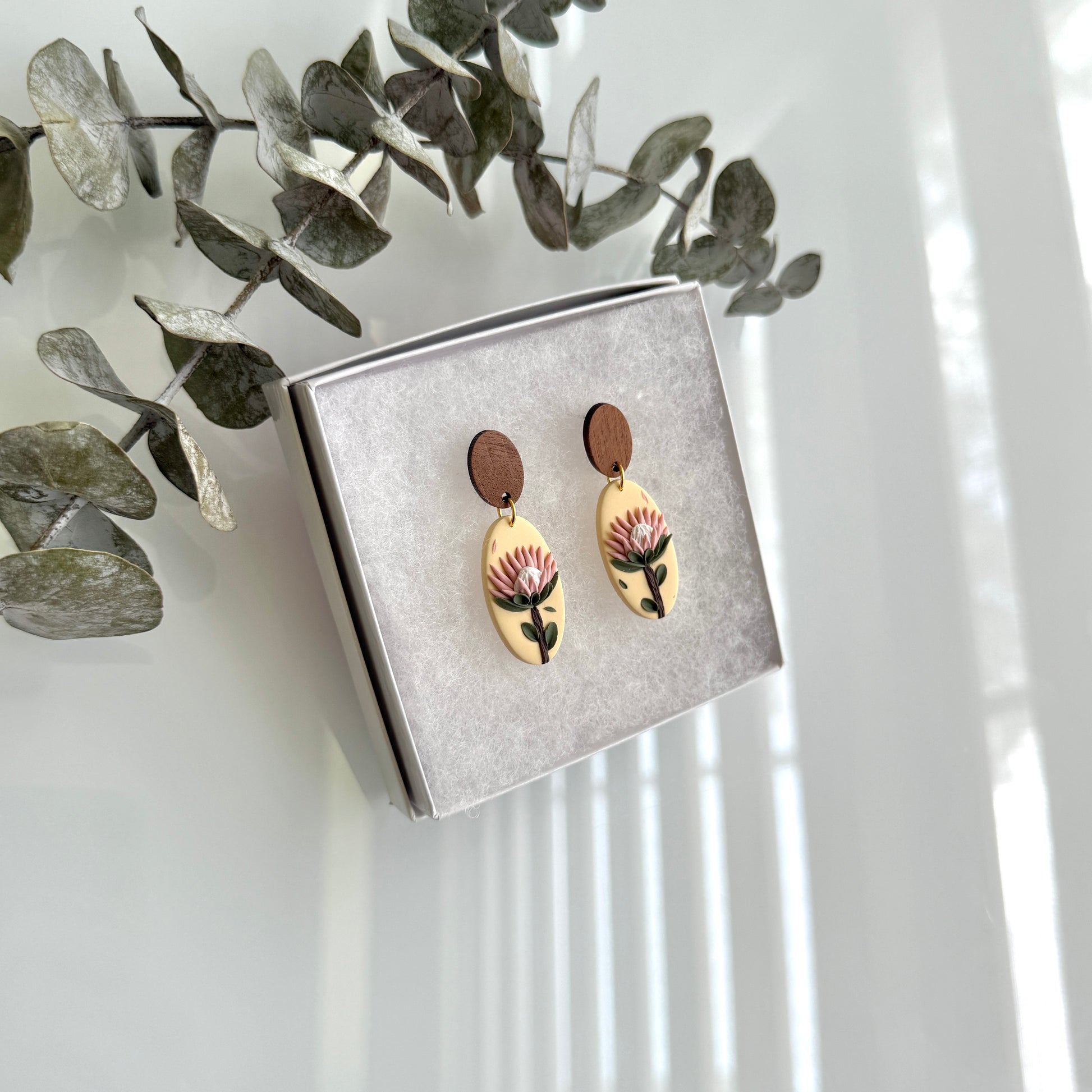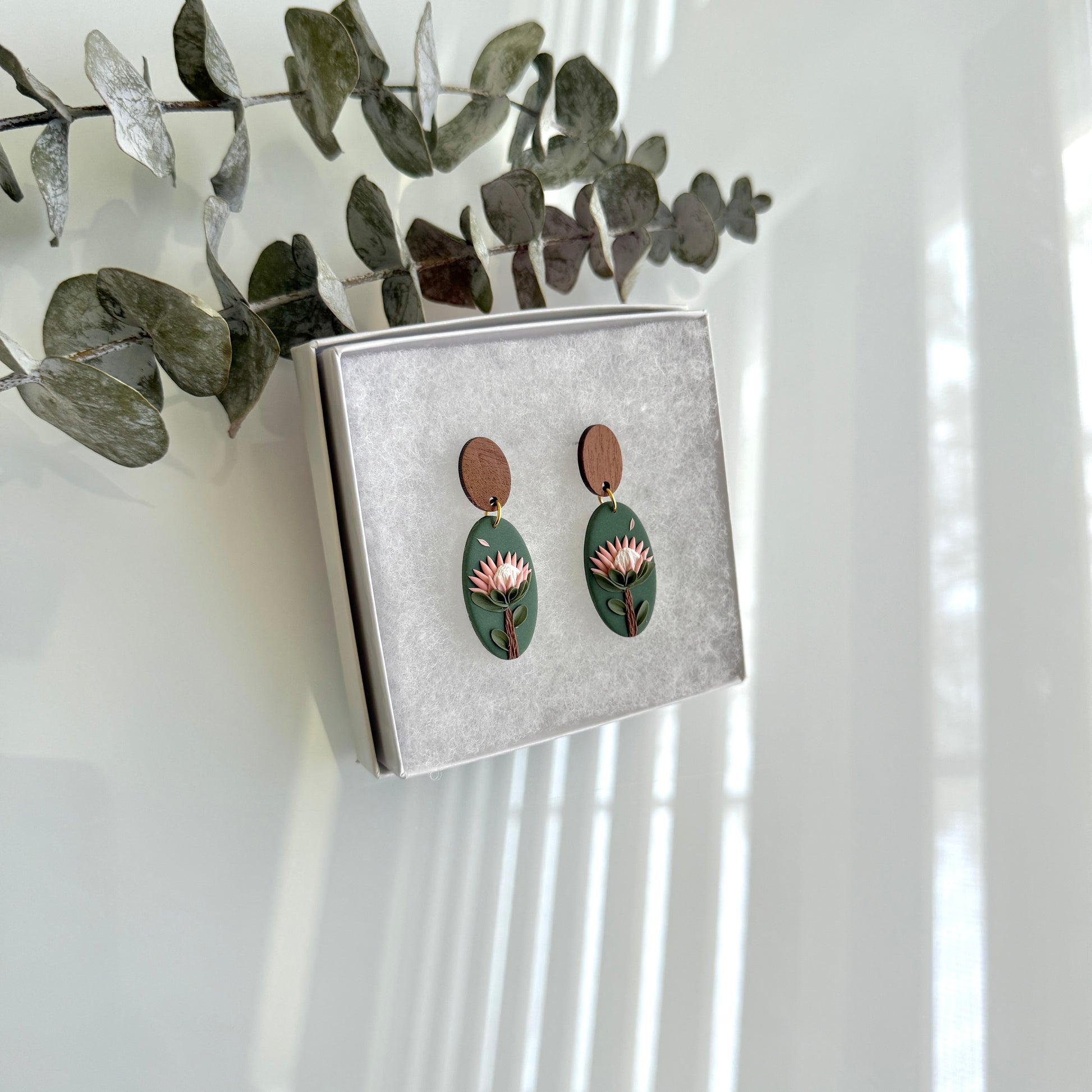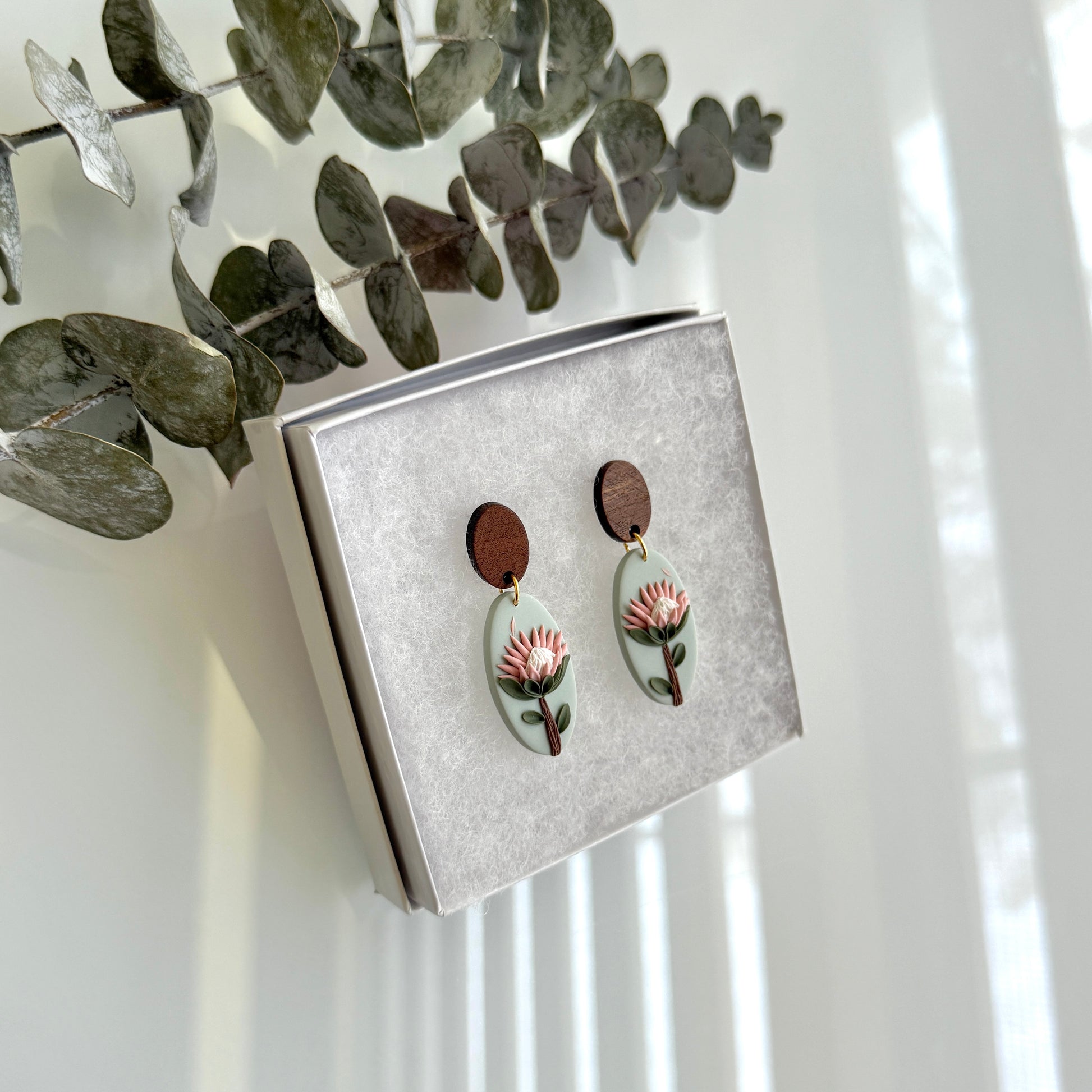 Ever popular ballet Pink Protea flowers on beautiful color base with wooden oval stud detail.