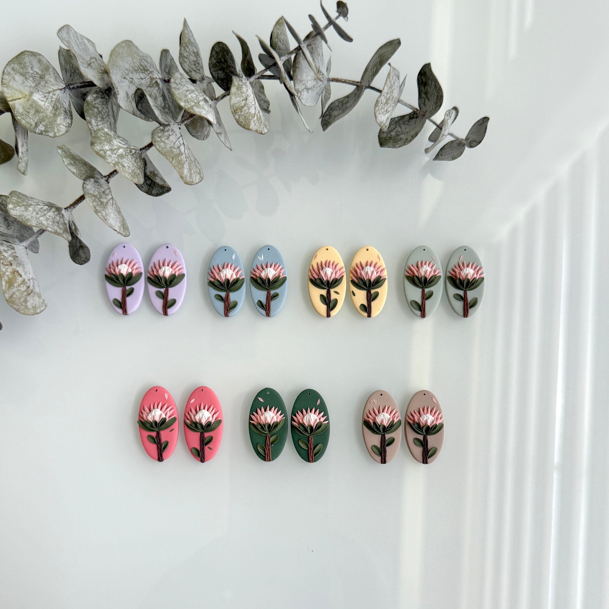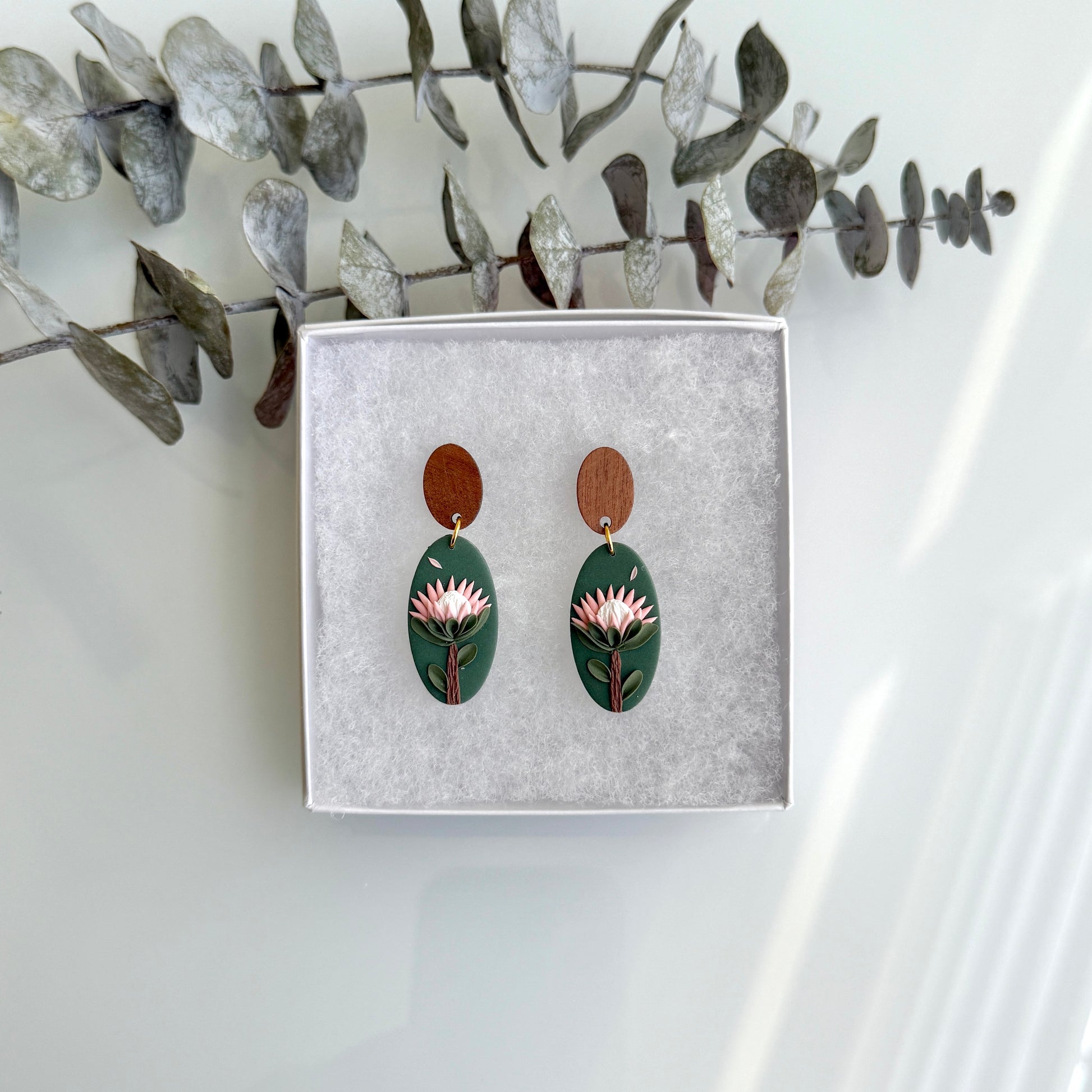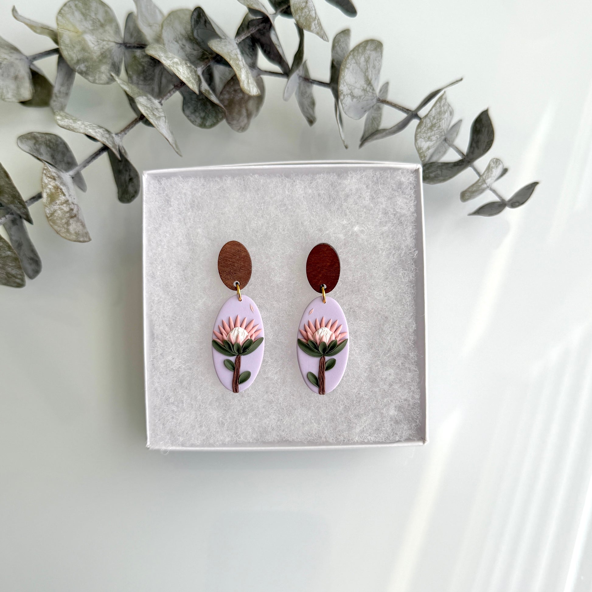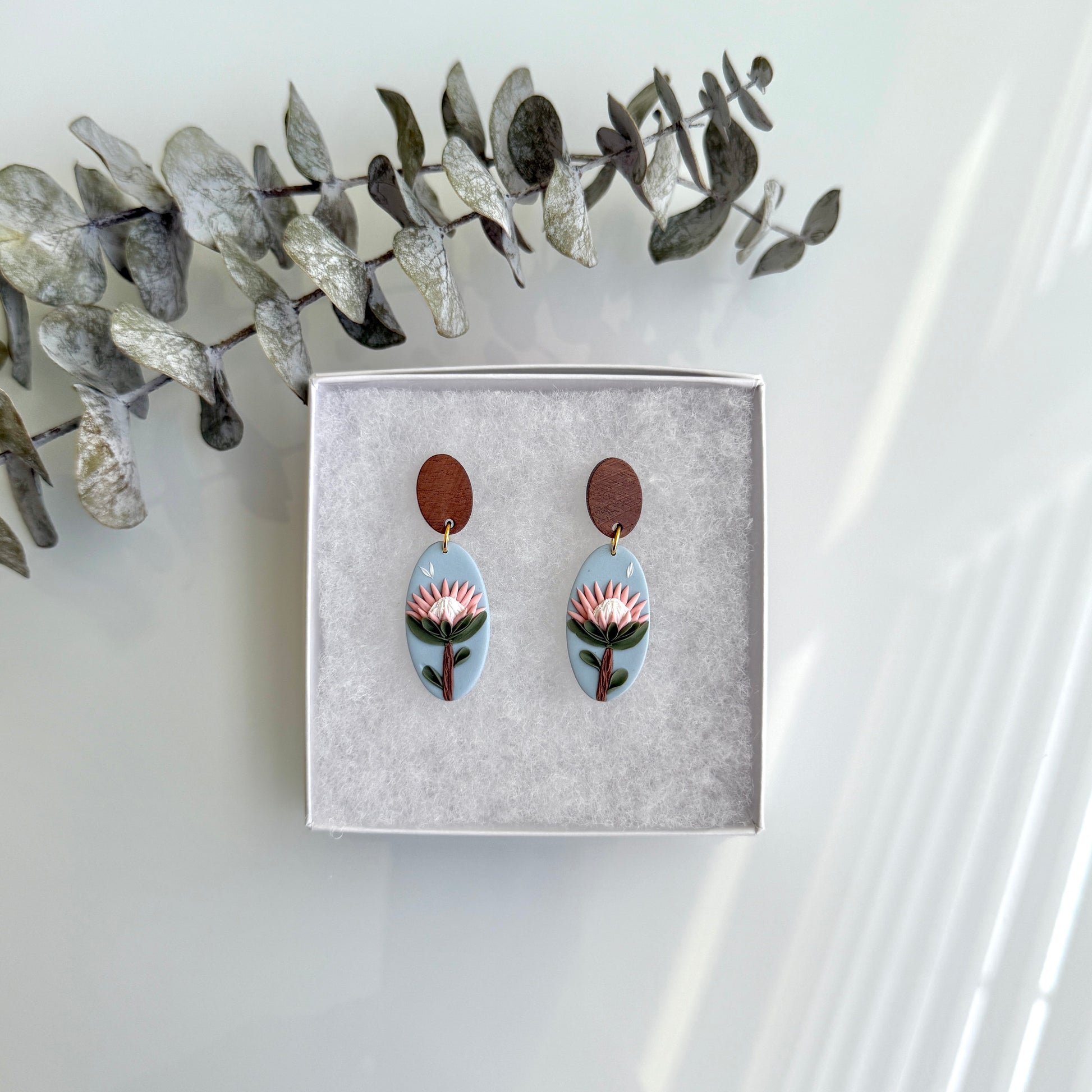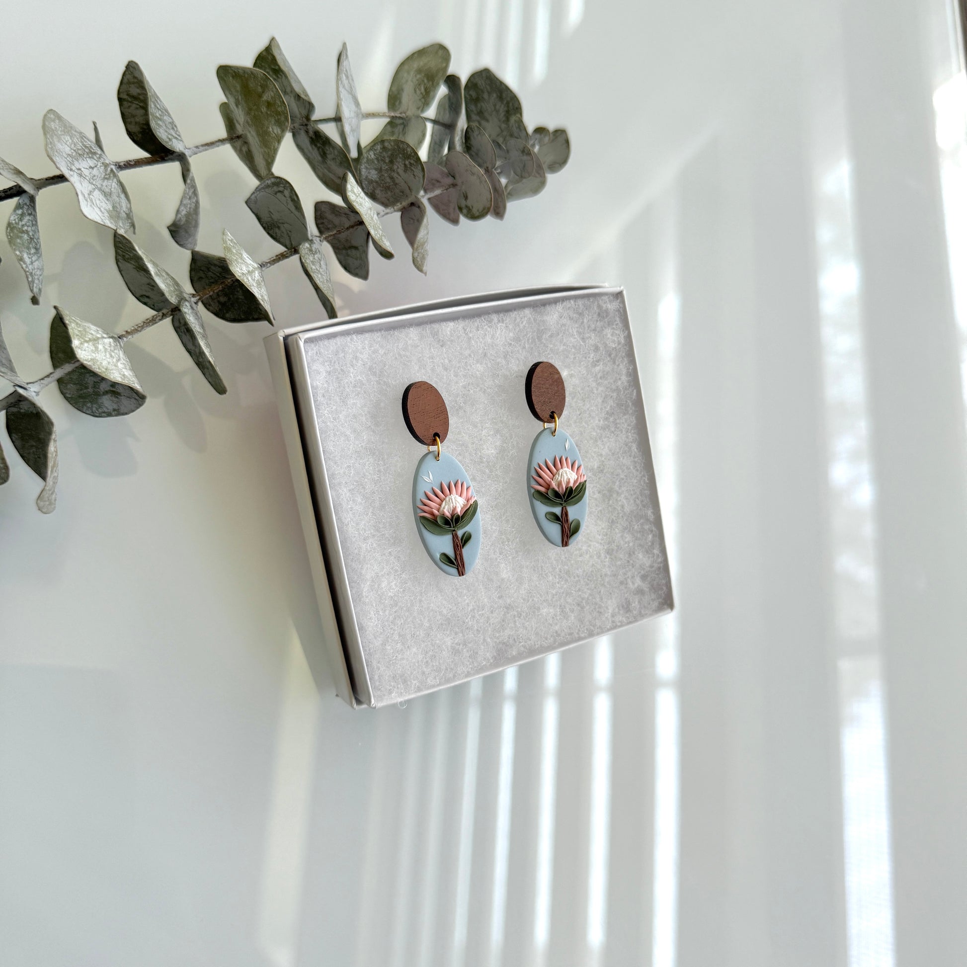 Ever popular ballet Pink Protea flowers on beautiful color base with wooden oval stud detail.