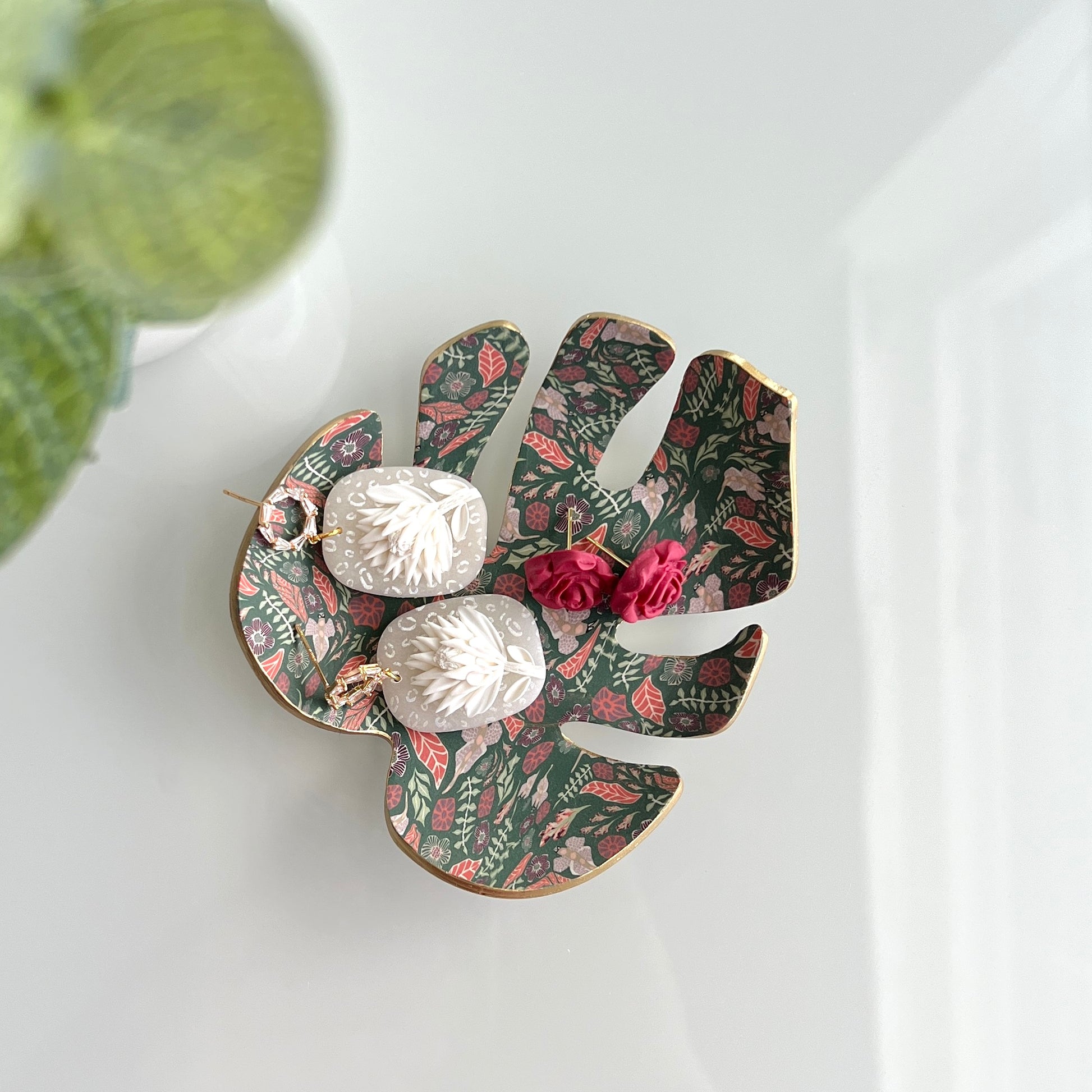 Monstera leaf shape trinket dish in "Wild Flower" design. Approximately size 90x80mm