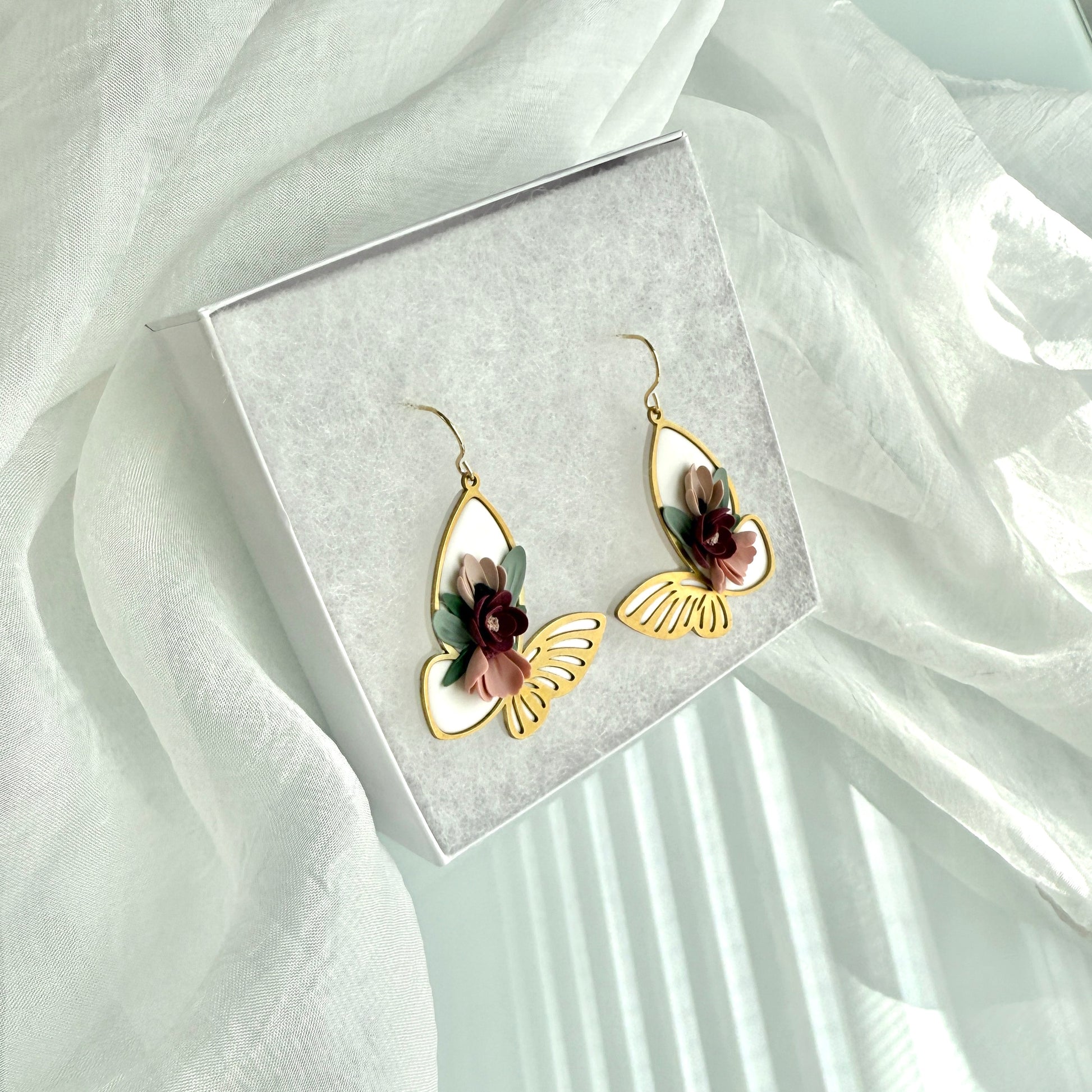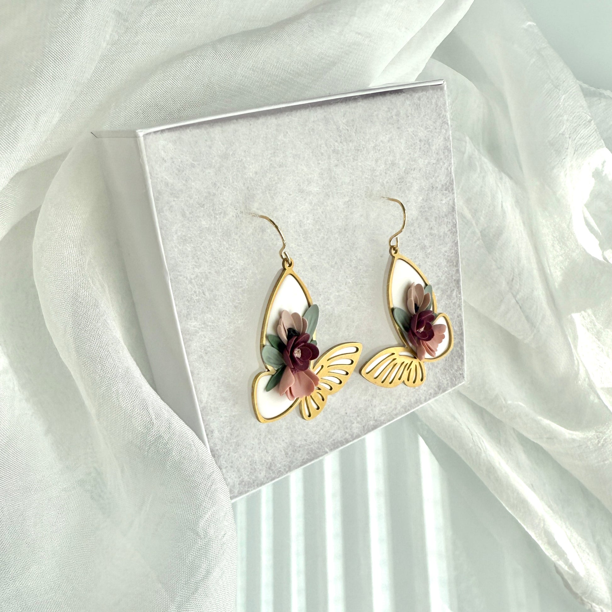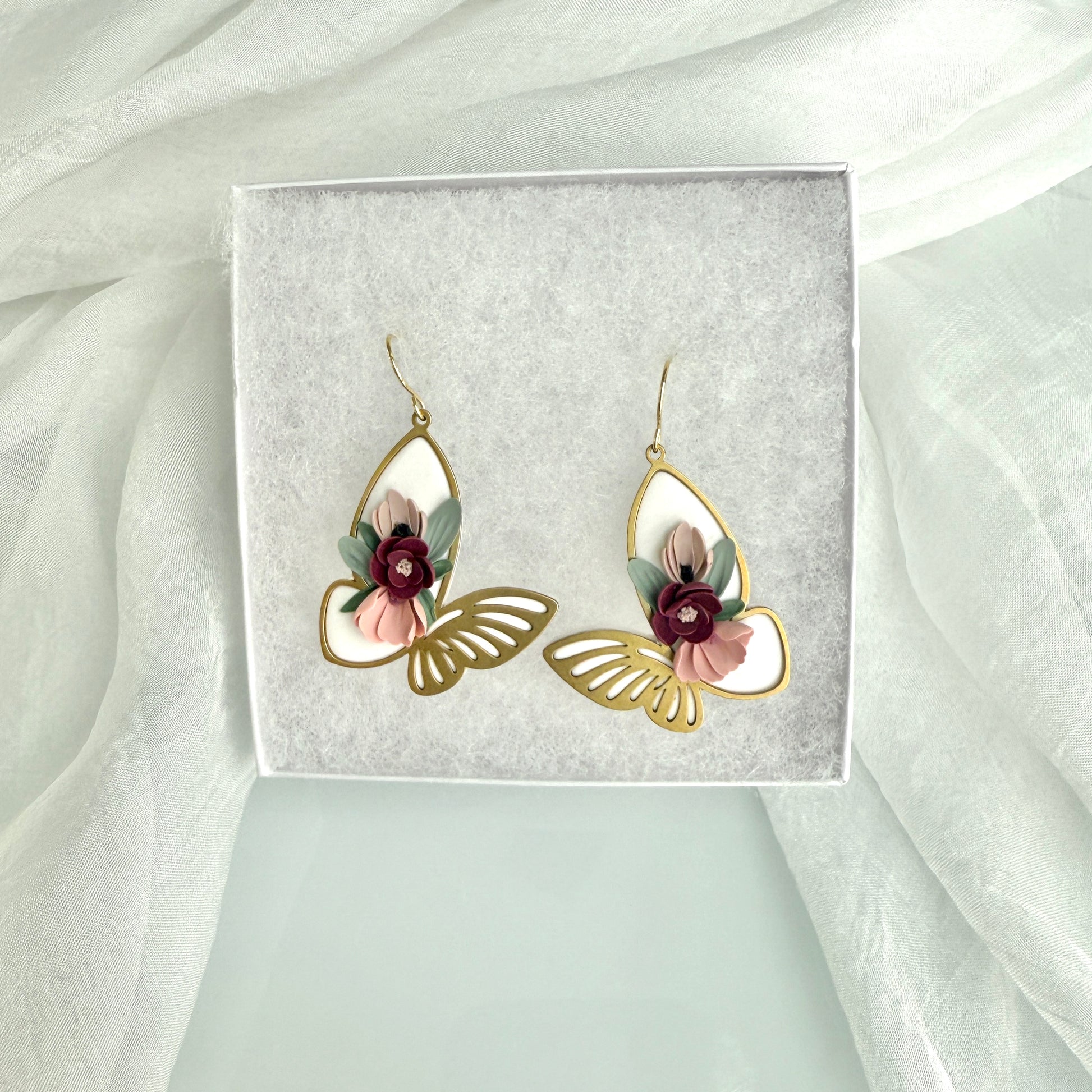 Framed Butterfly on white base, with 3D flower detail and simple ear hook:
