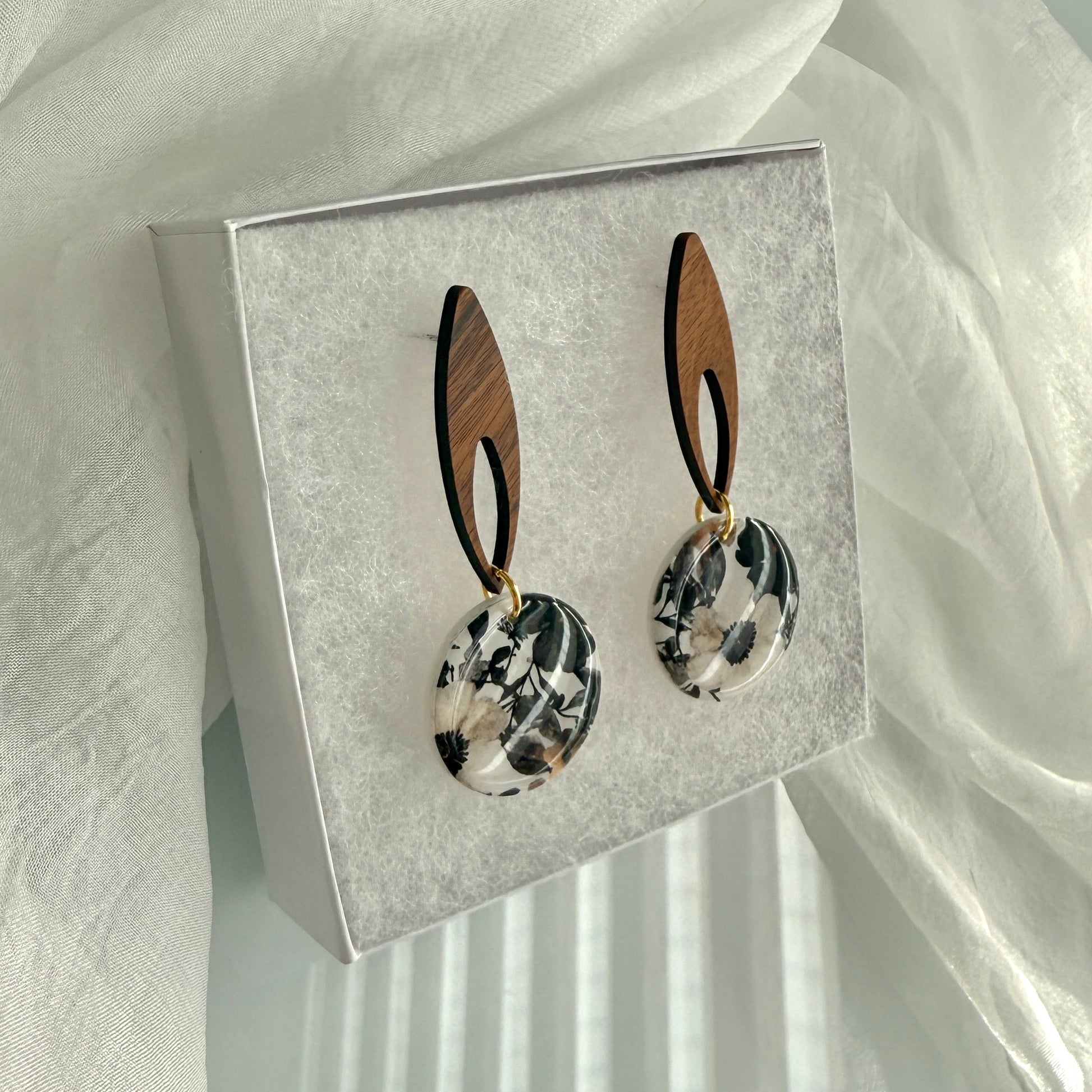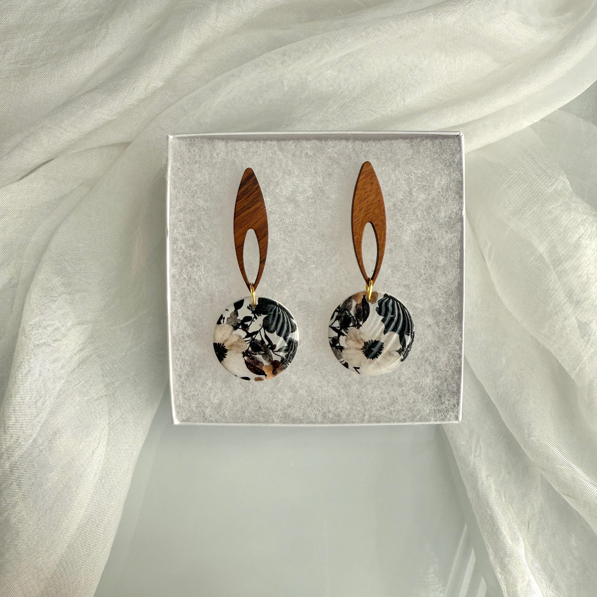 Neutral flower print, covered in shiny resin with wooden/gold detail: